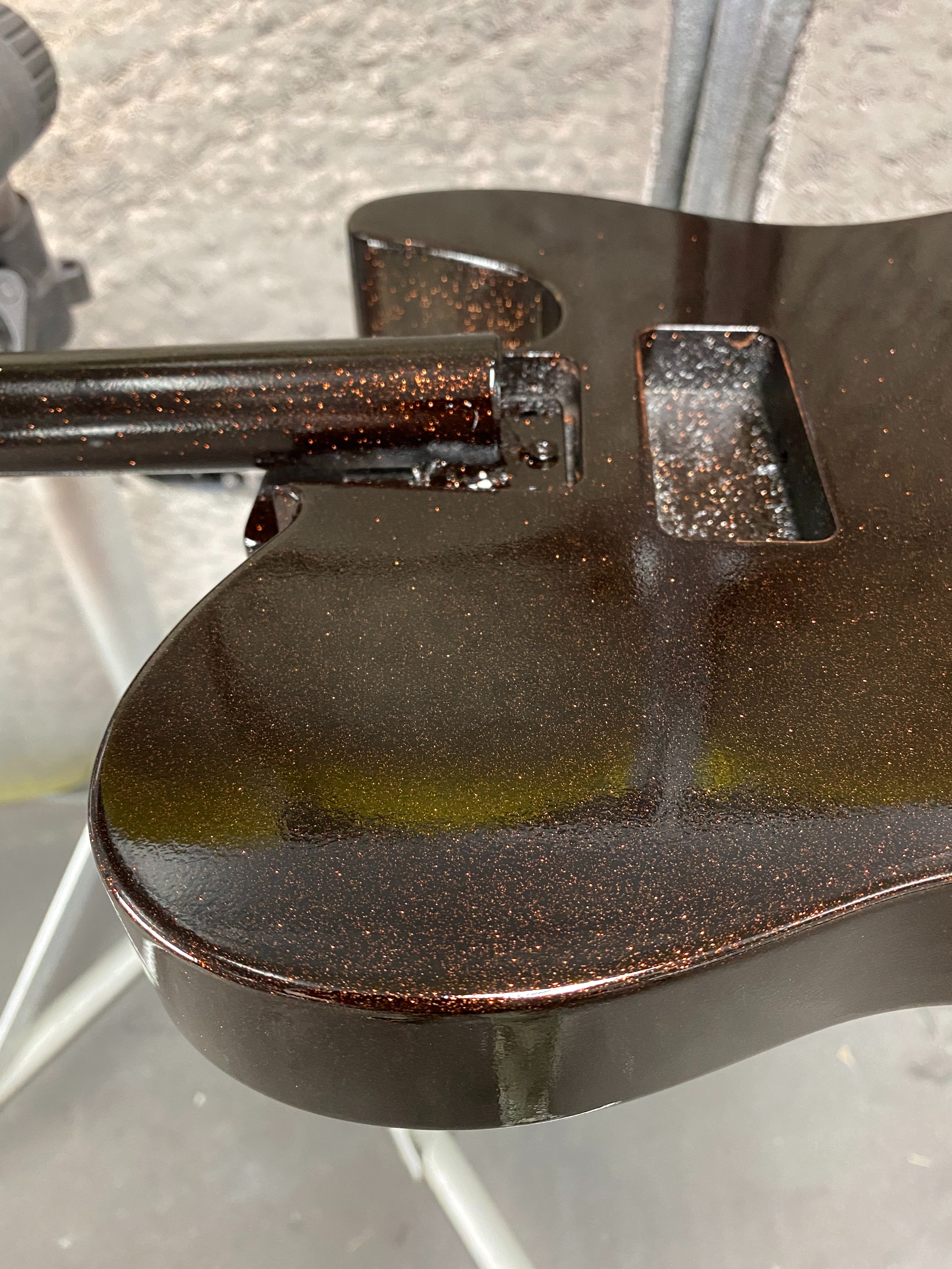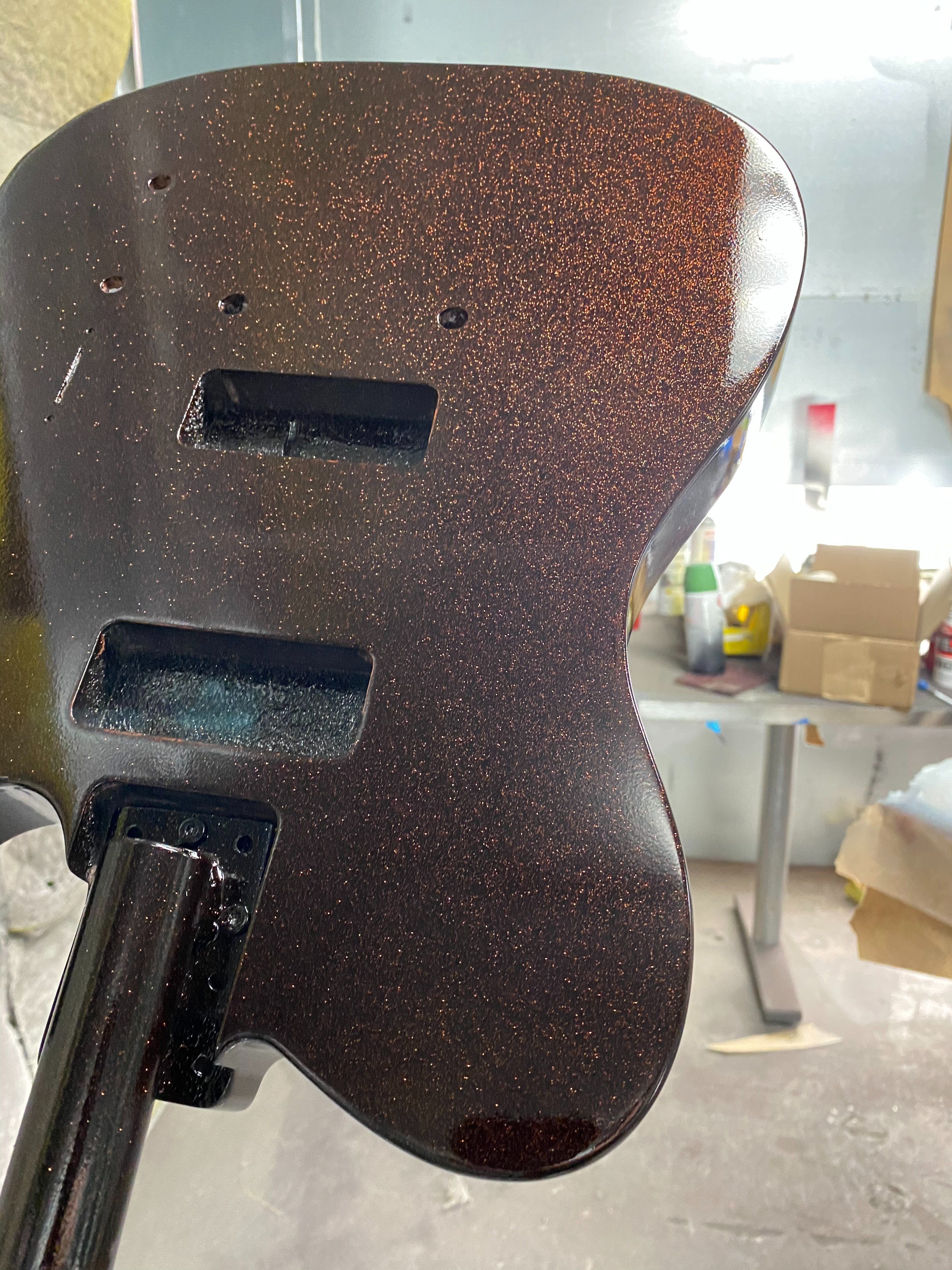 Here's one that just needs to get put together that's coming out really cool. Roth Skidmark Black base > Surfite silver Flake > Beaver Brown candy. I didn't do the best job grain sealing and it sunk pretty good (mahogany body) so I'm not gonna bother with cut and buff. Wraptail P90 Tele on the way!