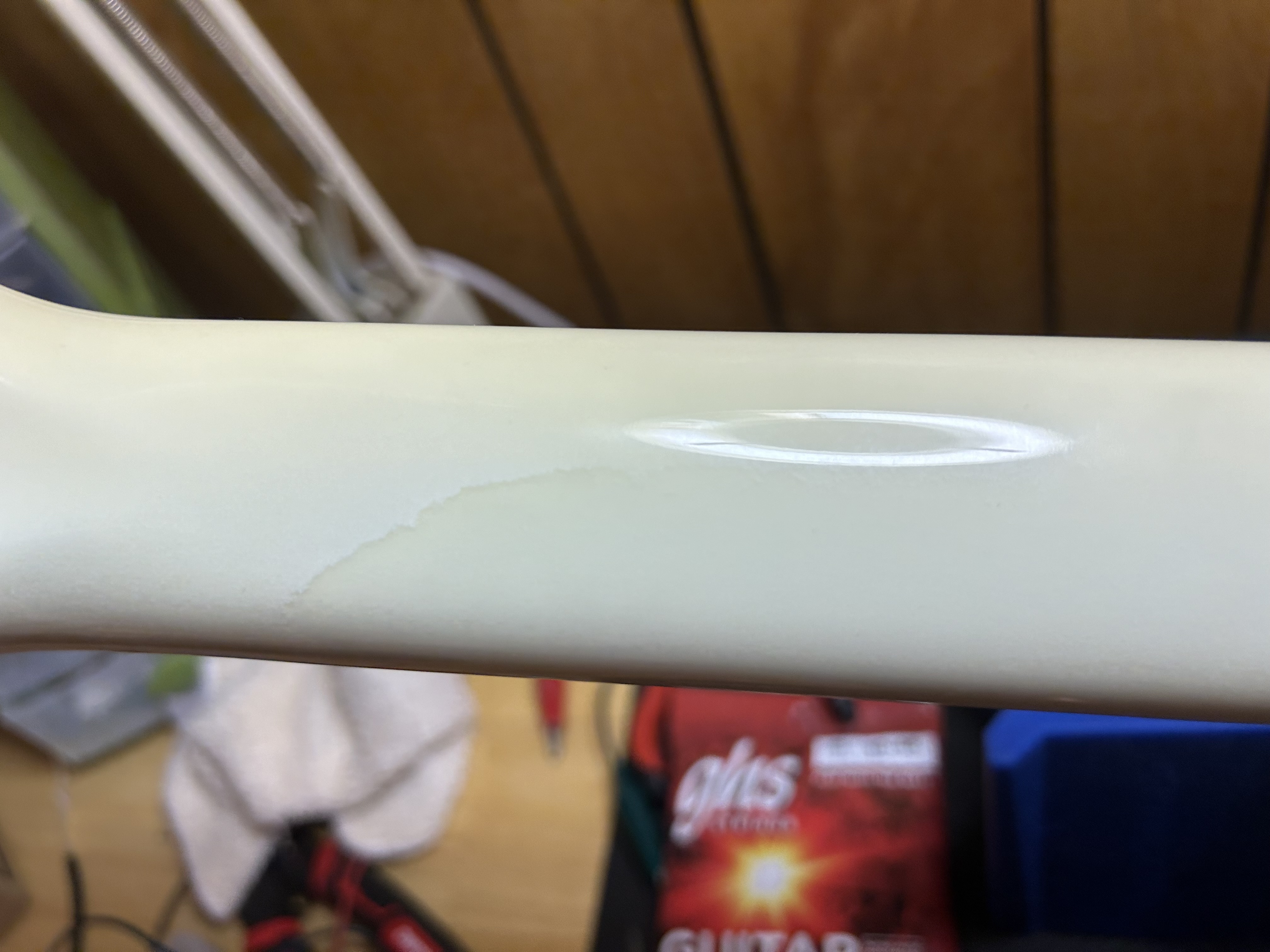 This looks like leaching of fretboard oil under the paint.Also, this on the back of the neck. You can’t feel it. Finish or in the wood? You have to have direct light on it to see it. It came with 8’s on it and the bridge was backwards