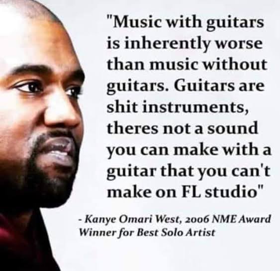 Well Kanye has spoken so that settles everything, lol. TBH you seem like you are embittered or having a difficult time right now. I hope everything is ok. Maybe it's time to put yourself out there and get a band started. Music is a gift to us for our healing and enjoyment, guitar or not. Blessings!!!