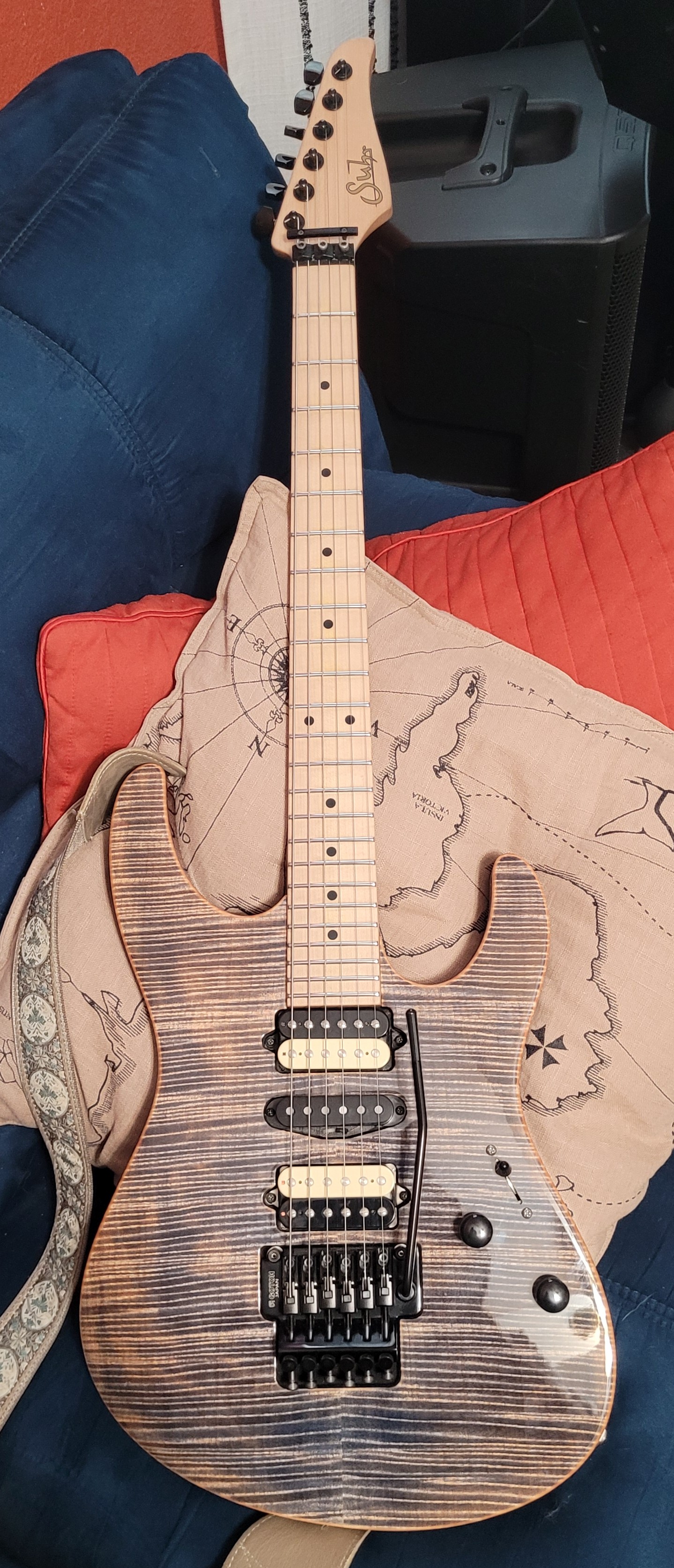 That is absolutely stunning. I want one. But I can’t find anything like it online.The denim Modern is the metal/shredder in my collection. It has a Swamp Ash body with a Flame Maple top, pups are SSV-V60LP-Aldrich. The neck is the Modern Elliptical .800-.850, 10"-14" compound radius, jumbo SS frets. It is tuned half a step down to Eb and I have a .009-.042 string set on it. I'll be using it for an Ozzy celebration of life this coming Sunday