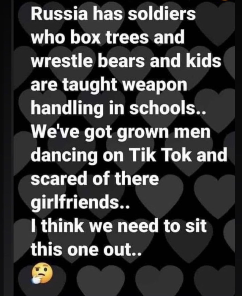 wonder how a group of our blue hairs with their they/them pronouns would do in an altercation with russia's finest? or better yet...a group of chechans.....