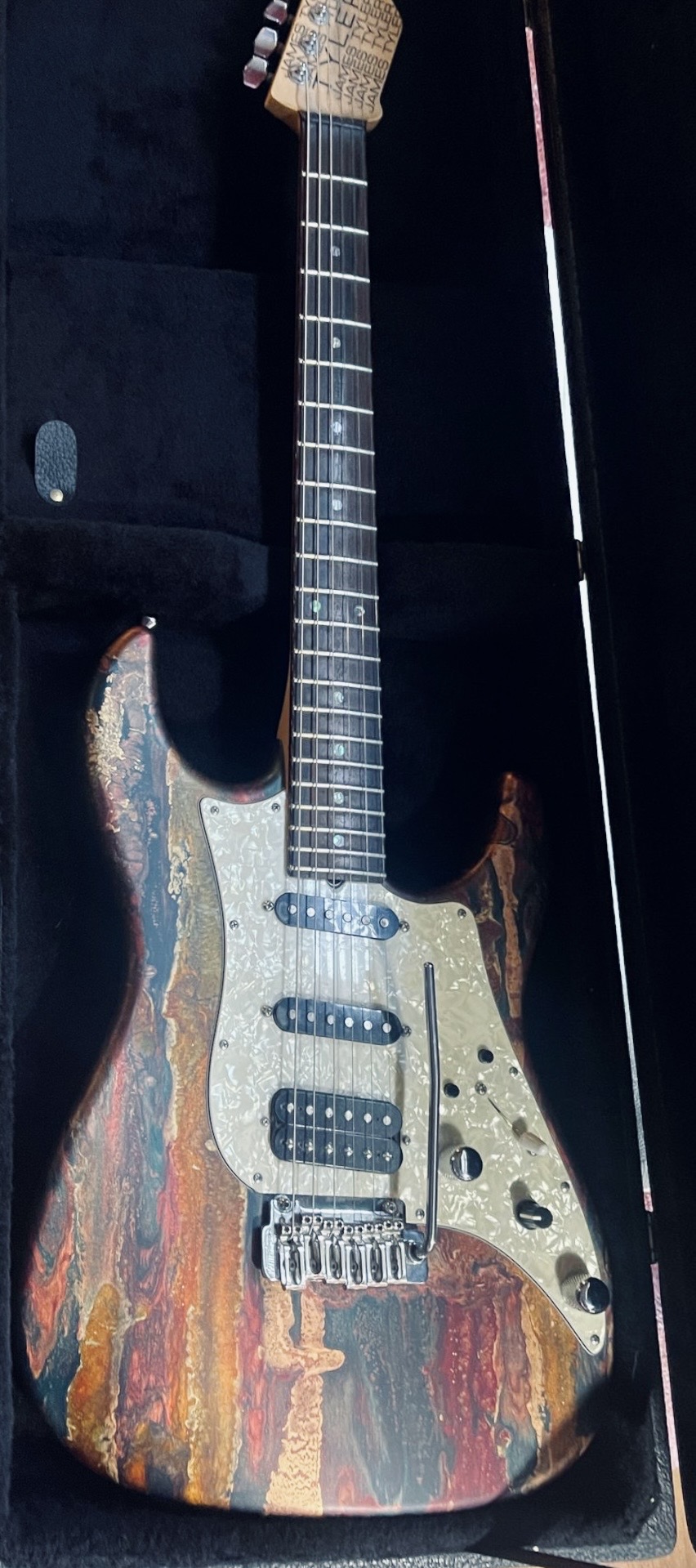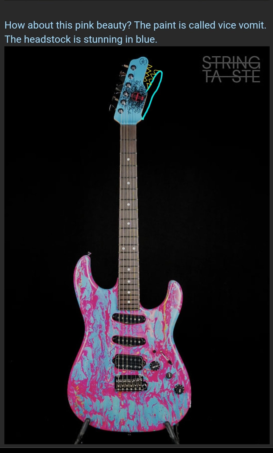How about this pink beauty? The paint is called vice vomit. The headstock is stunning in blue.
