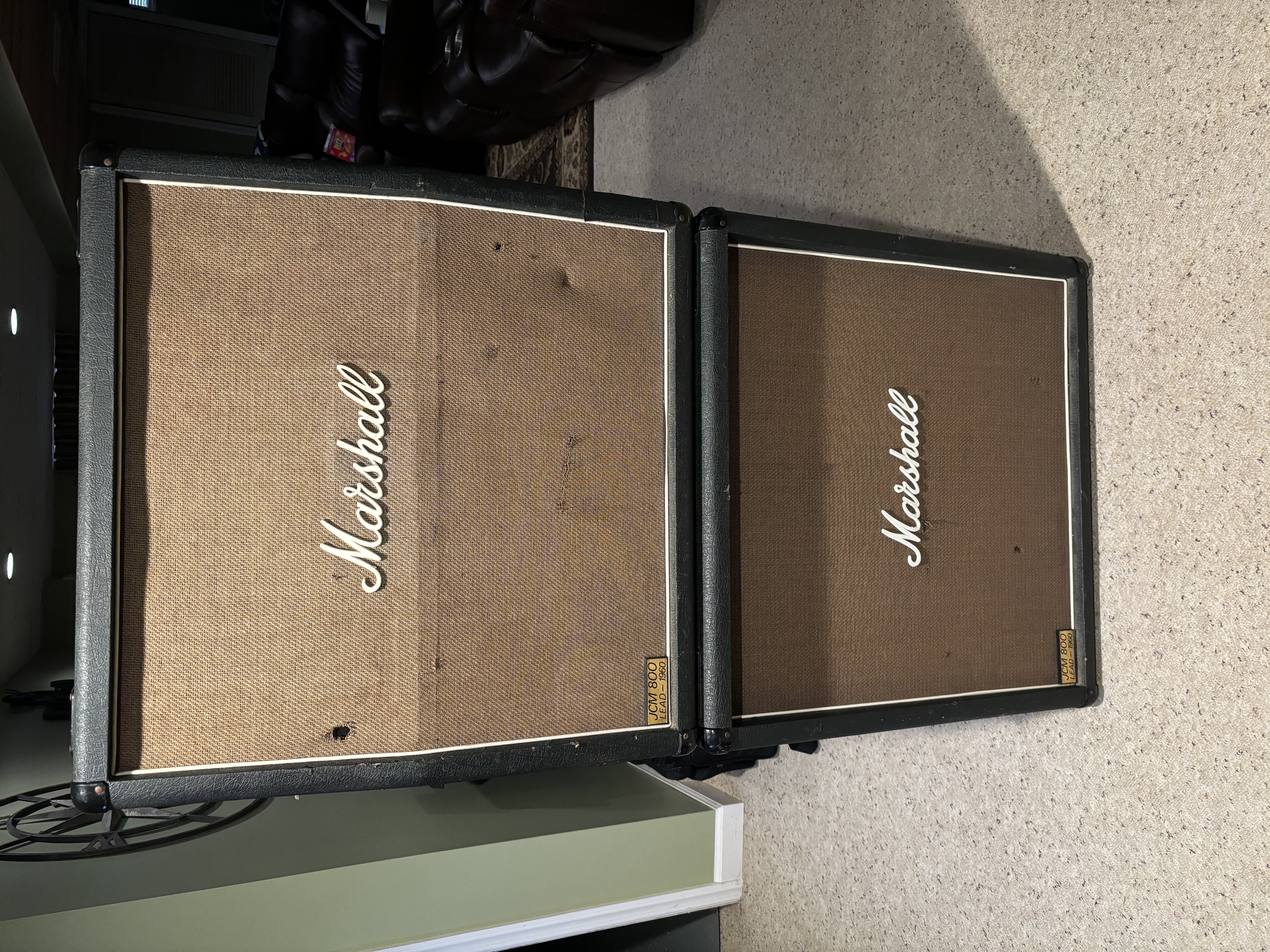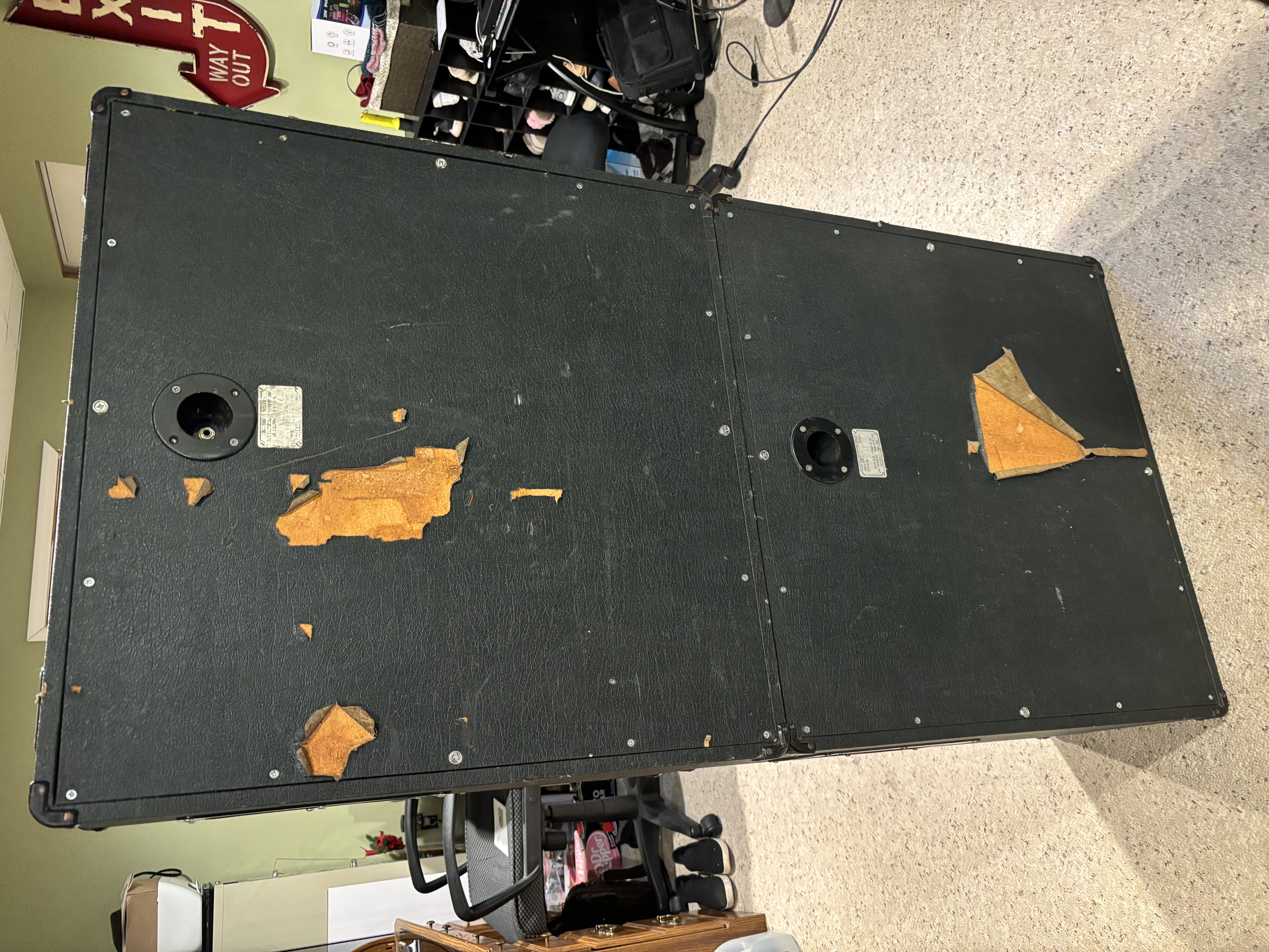 These are clearly from 1985/86 based on the cloth. Angled cab has the speakers pictured and the bottom cab has the white label 75’s but the magnets are not vented. Neither have casters because they were in road cases. Came from an east coast backline rental company and have been on tours with Cinderella. Both cabs sound fantastic but have the wear that one would expect for heavily used cabinets of this age.
