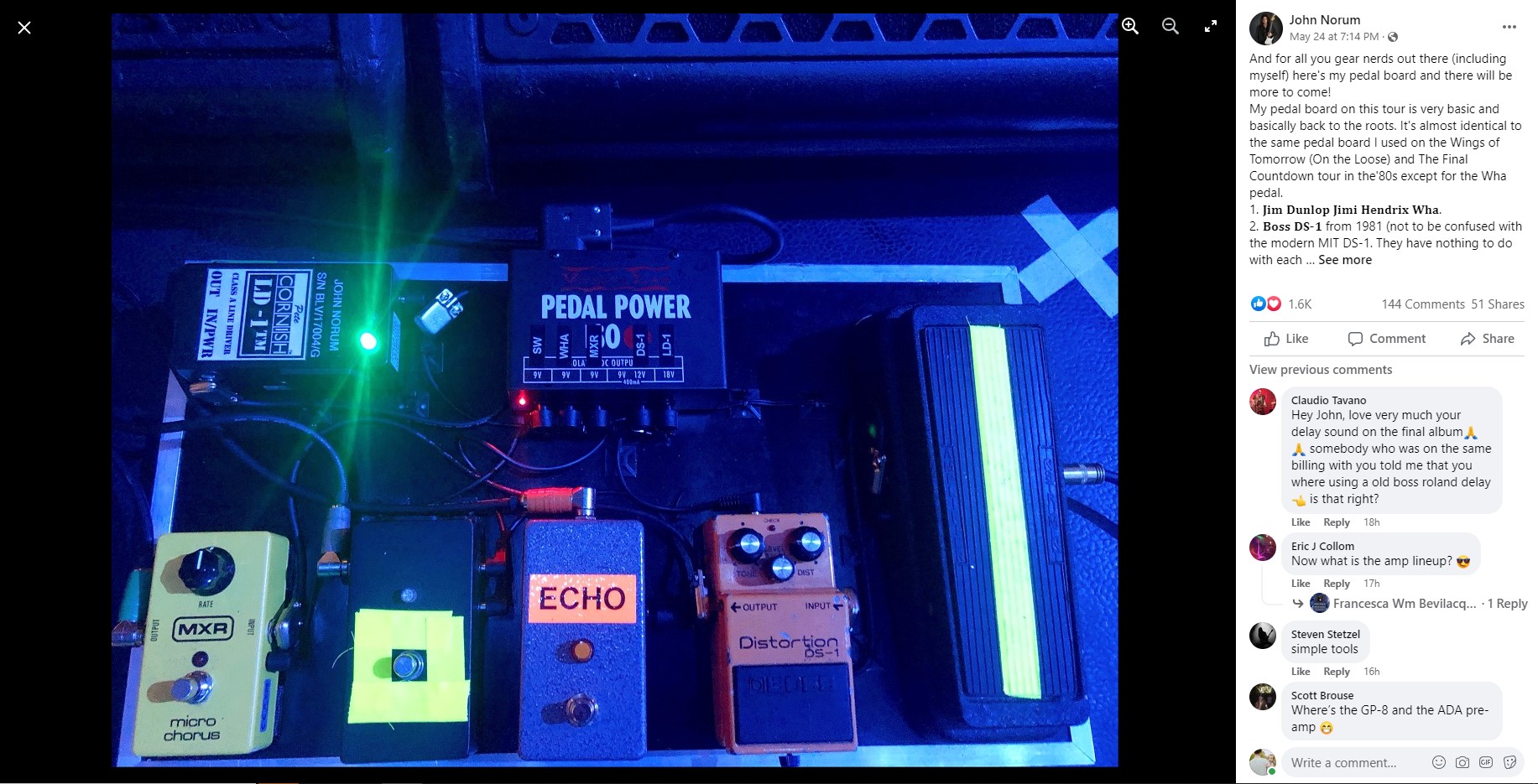 Gotta love Norum, total gear nerd like the rest of us. Saw this the other day on his FB. He's gone back to an even simpler board. MXR micro chorus, 81 Japan DS-1, MXR echoplex, JH Wah . Dead simple, pick it up anywhere or on ebay for a few hundred bucks (japan DS-1) and the rest is chops.