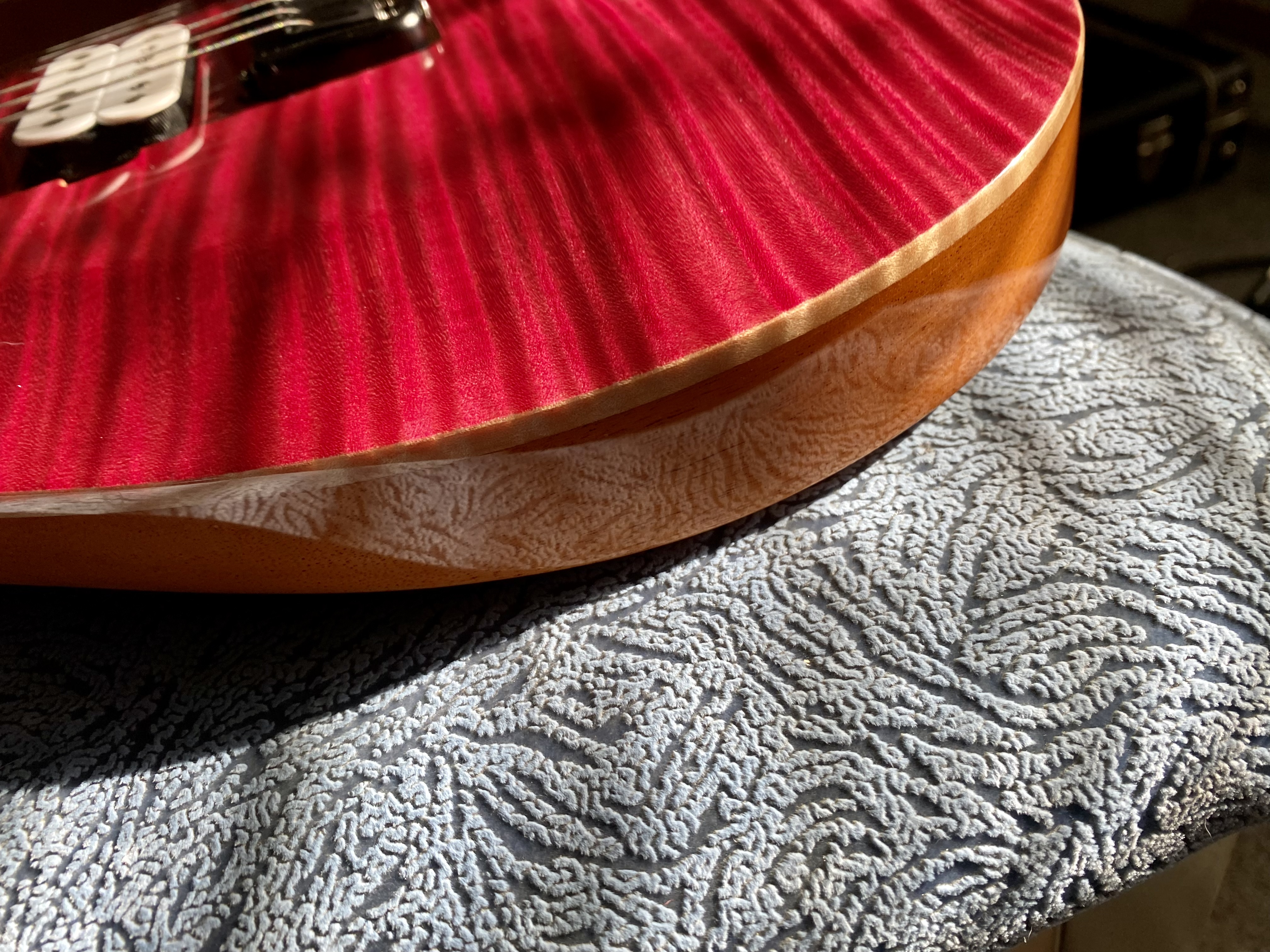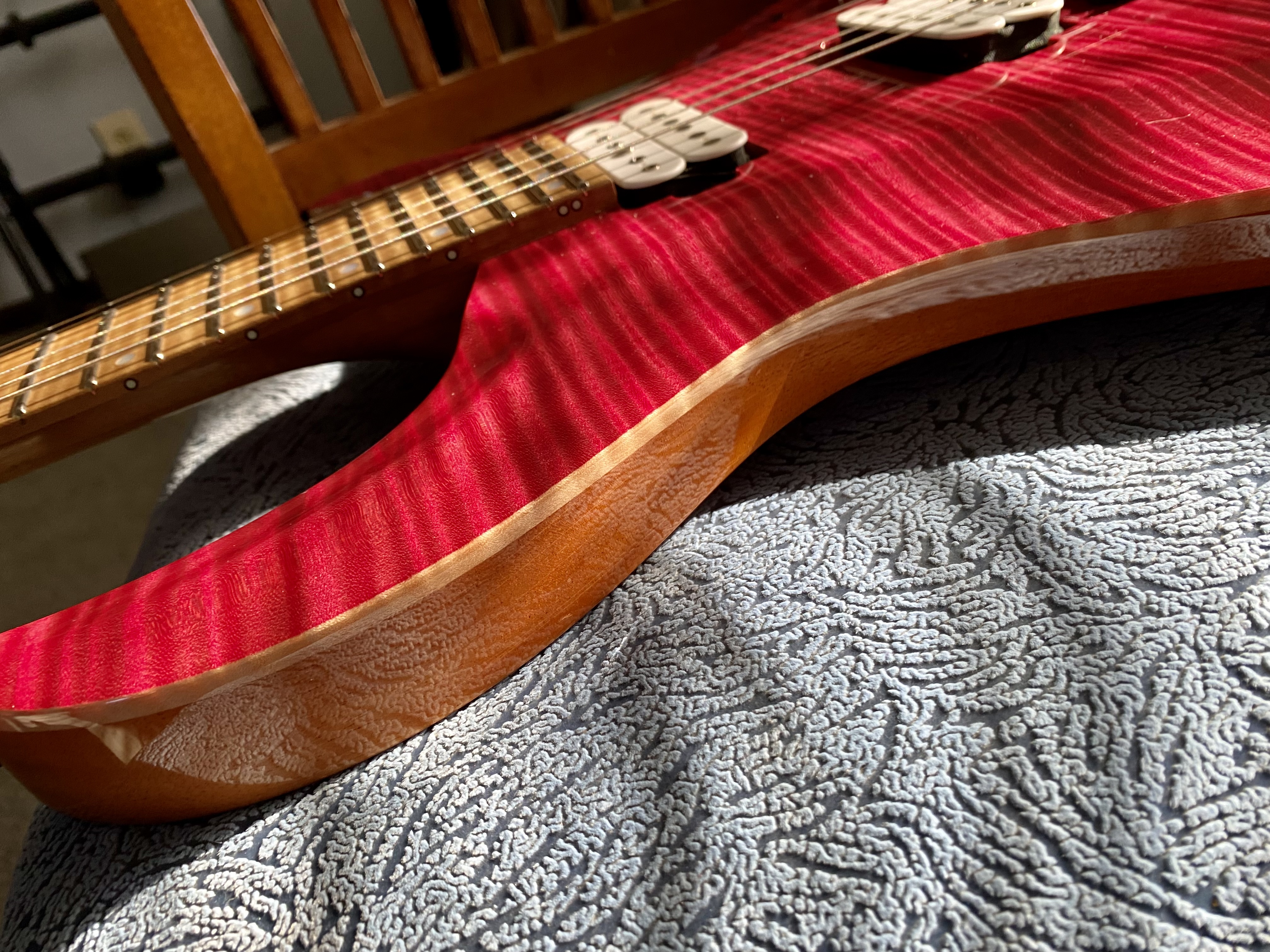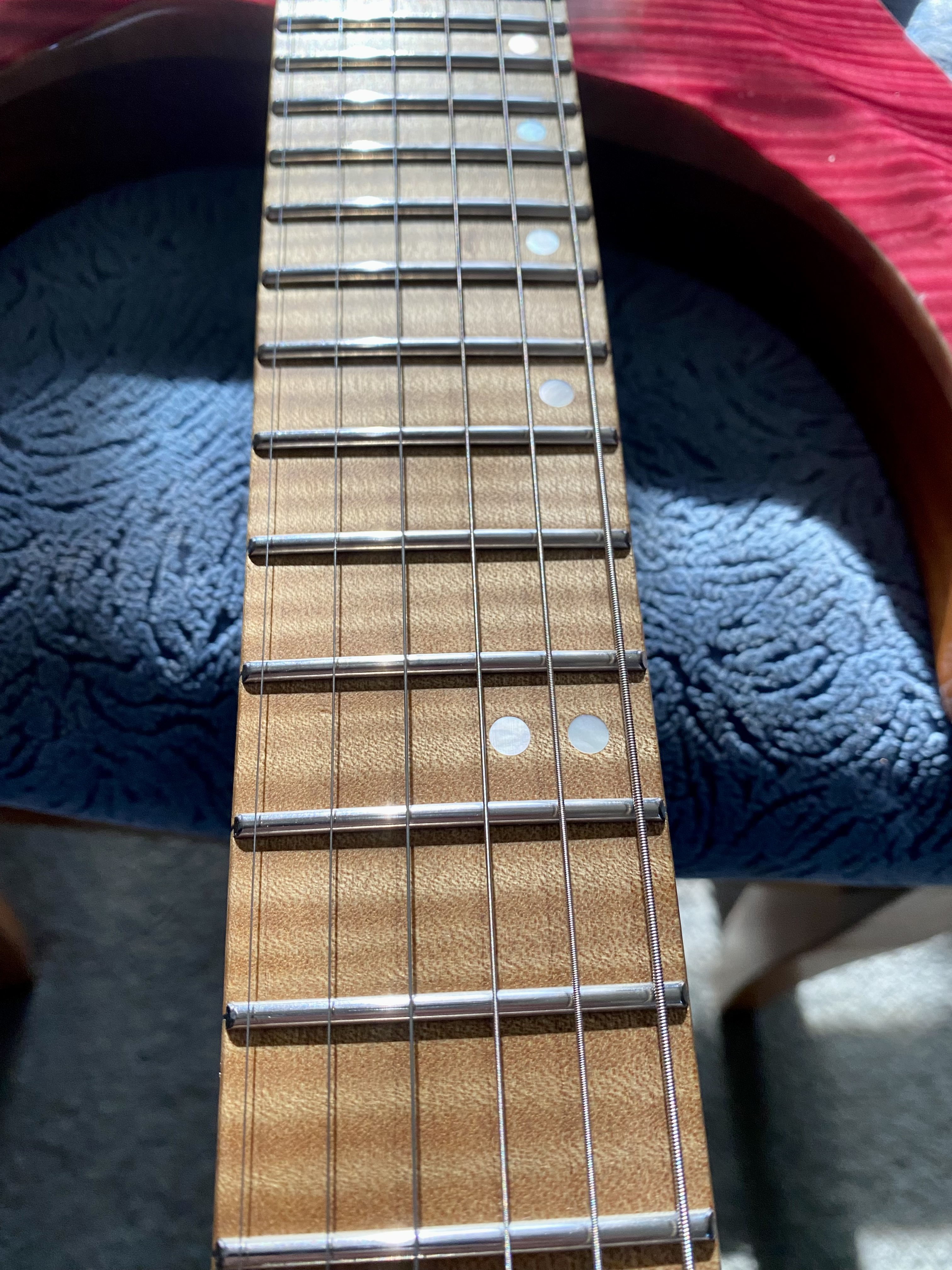 Has the Kiesel side dot glow markers. Their trem system. Maple neck 3D 1/4” flame cap. Not sure of body wood.