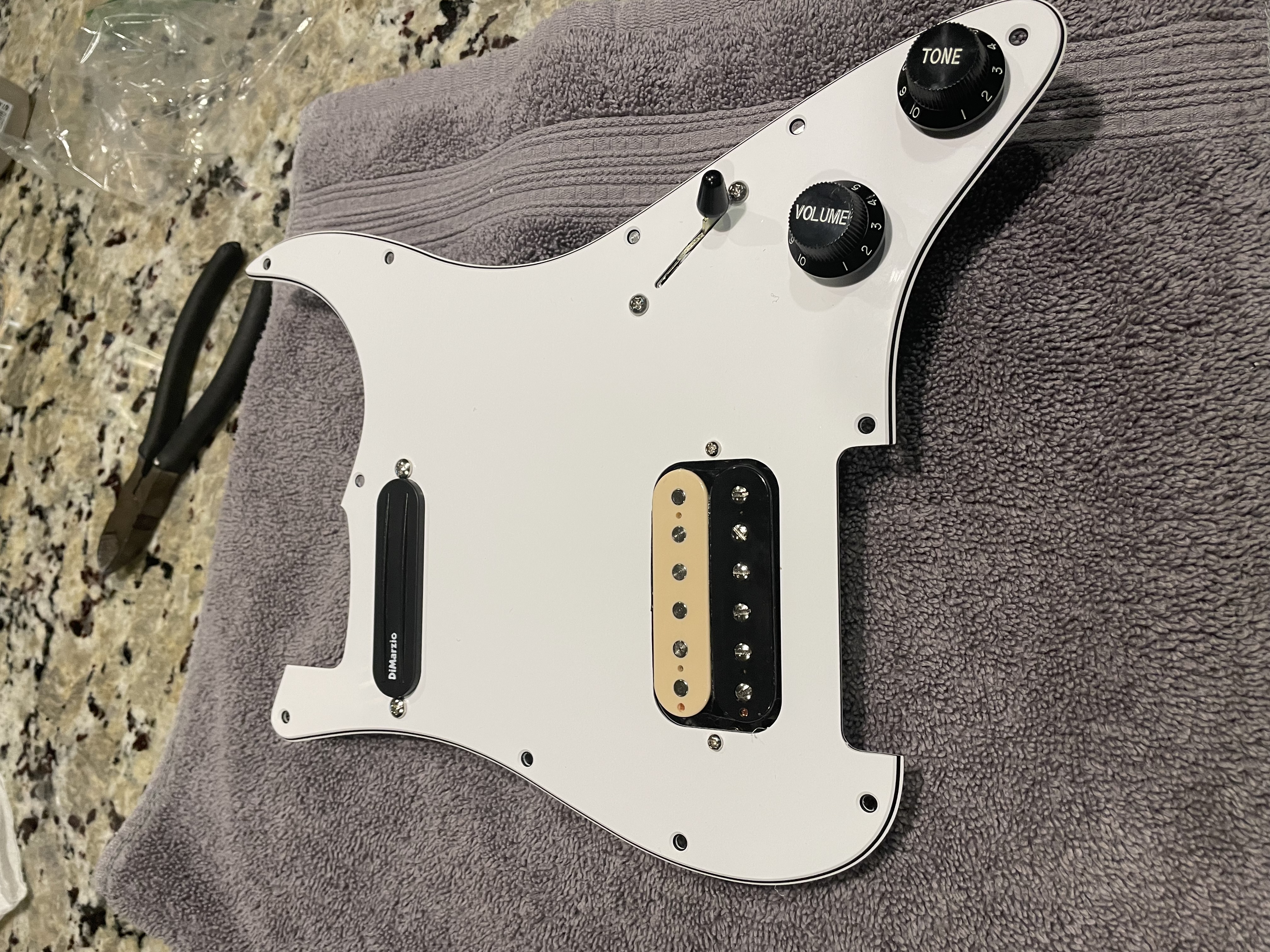 Just finished up this guard for my partscaster. Gonna give the new “Eruption” pickup a go. Dimarzio Satch Track in neck.