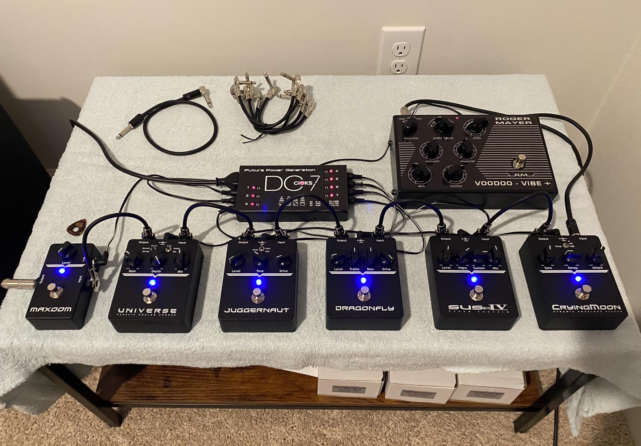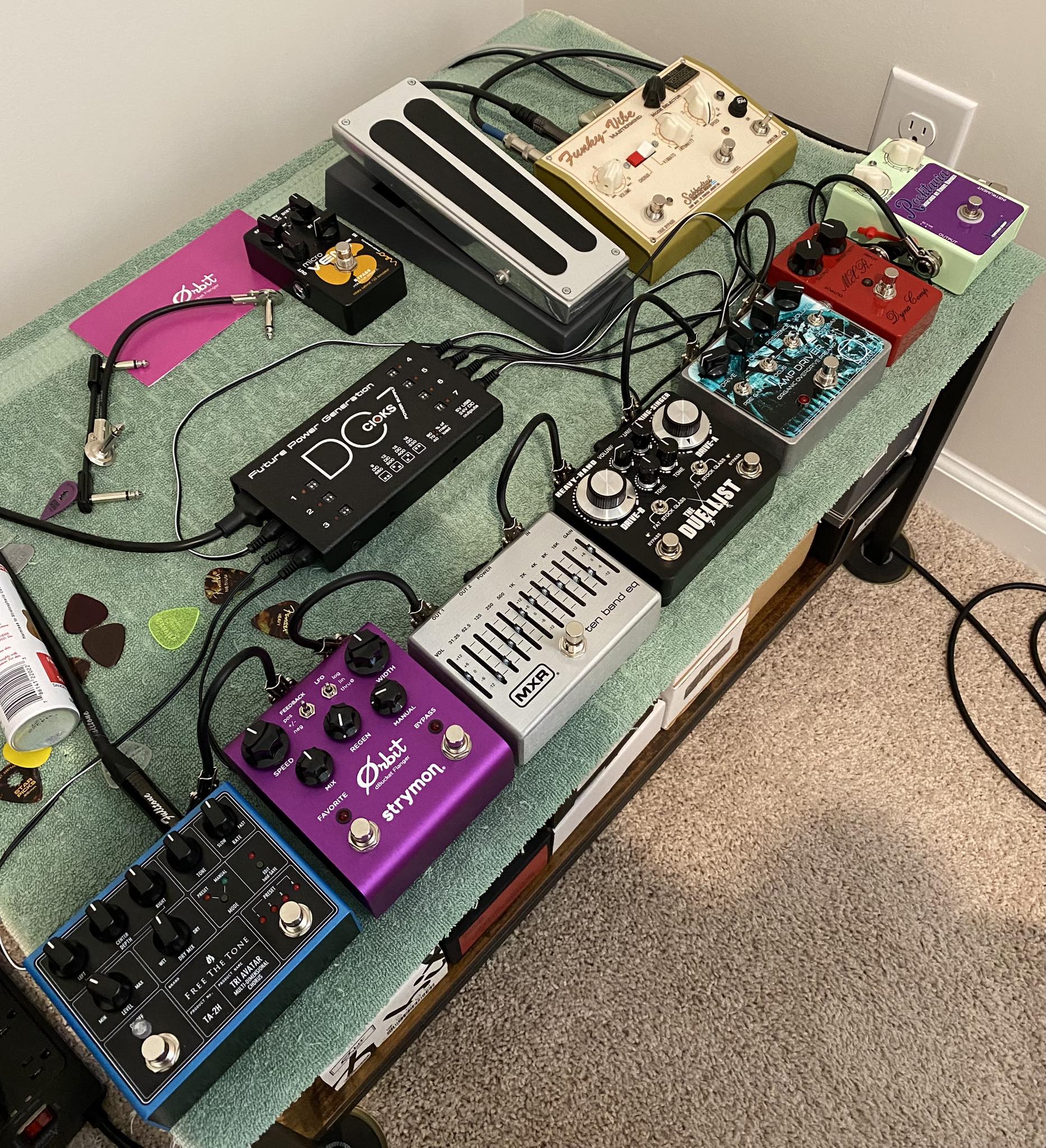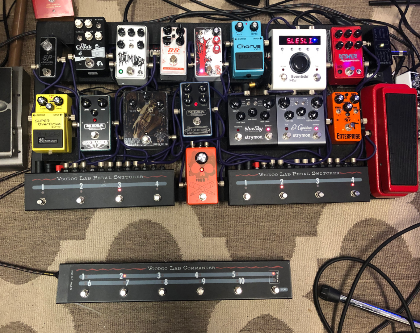 Current set up fresh off two months of tour and uncleaned since then, haha. Although I got hooked up with Temple and Cioks recently and coincidentally my new Temple board should arrive sometime today so I’ll be migrating over and upgrading my power supplies. I have lots of pedals I fuck with at home or in recording situations but for touring it’s just the essentials that work.