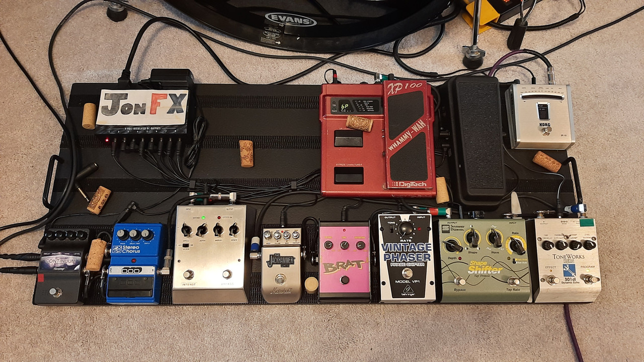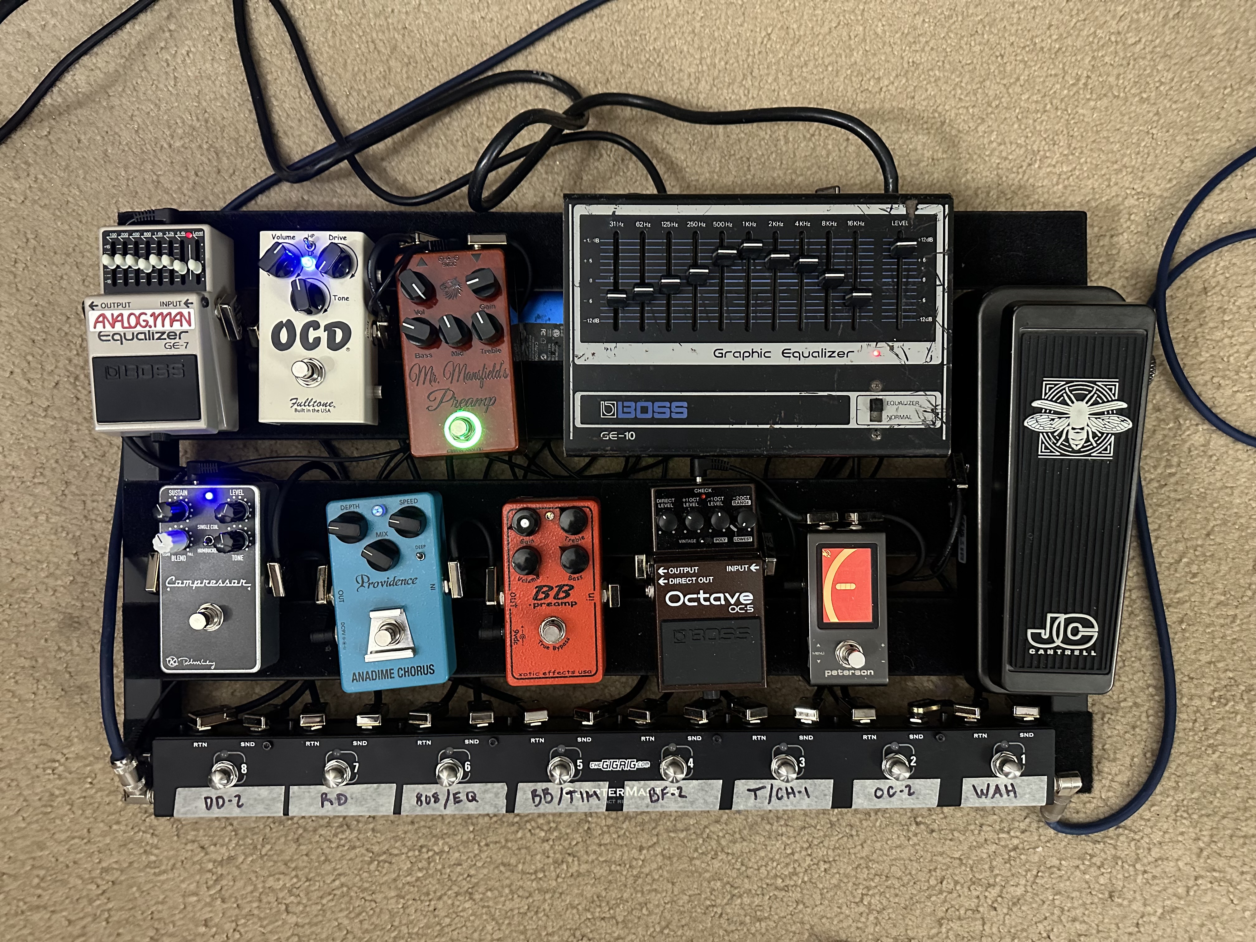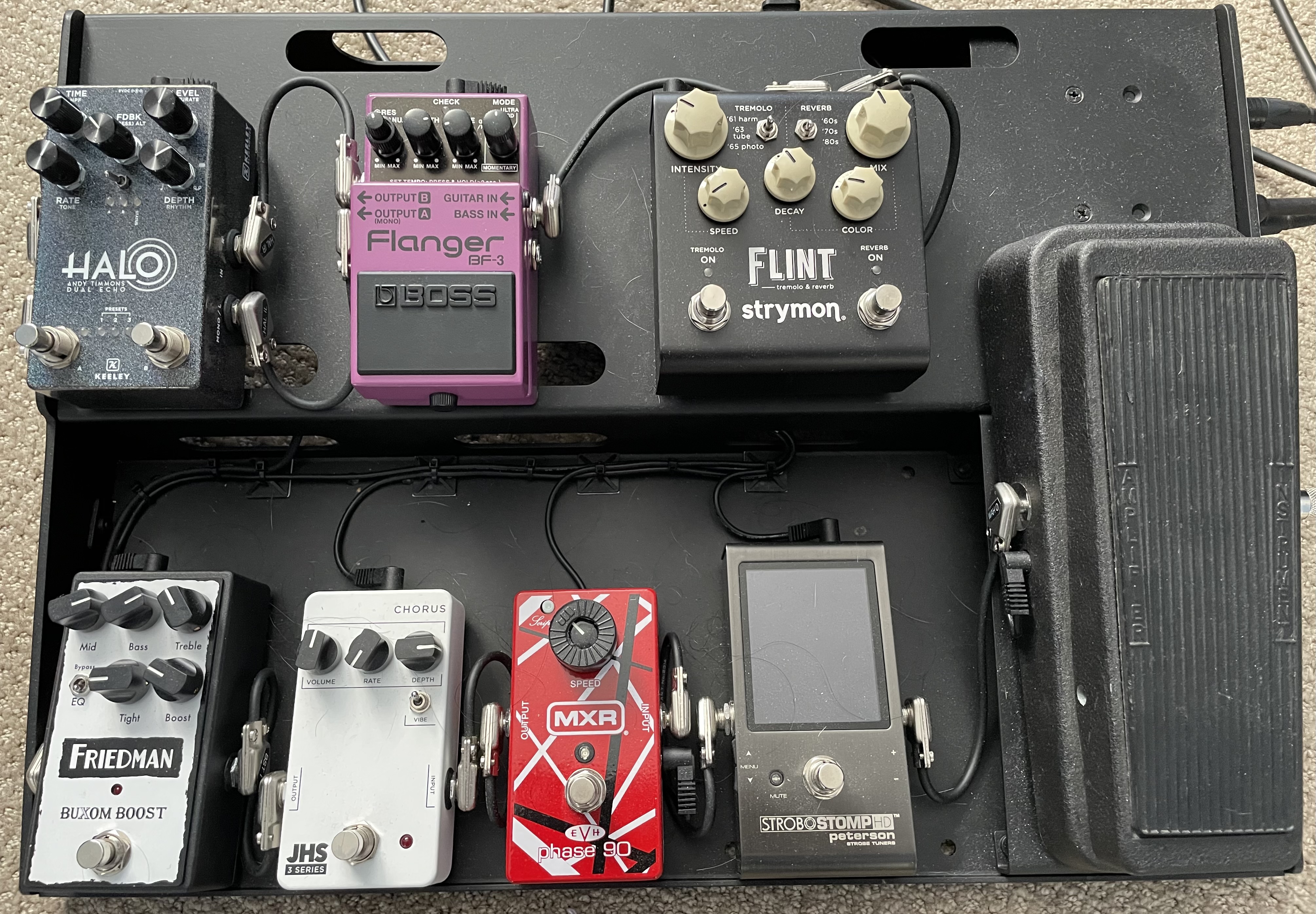Current set up fresh off two months of tour and uncleaned since then, haha. Although I got hooked up with Temple and Cioks recently and coincidentally my new Temple board should arrive sometime today so I’ll be migrating over and upgrading my power supplies. I have lots of pedals I fuck with at home or in recording situations but for touring it’s just the essentials that work.