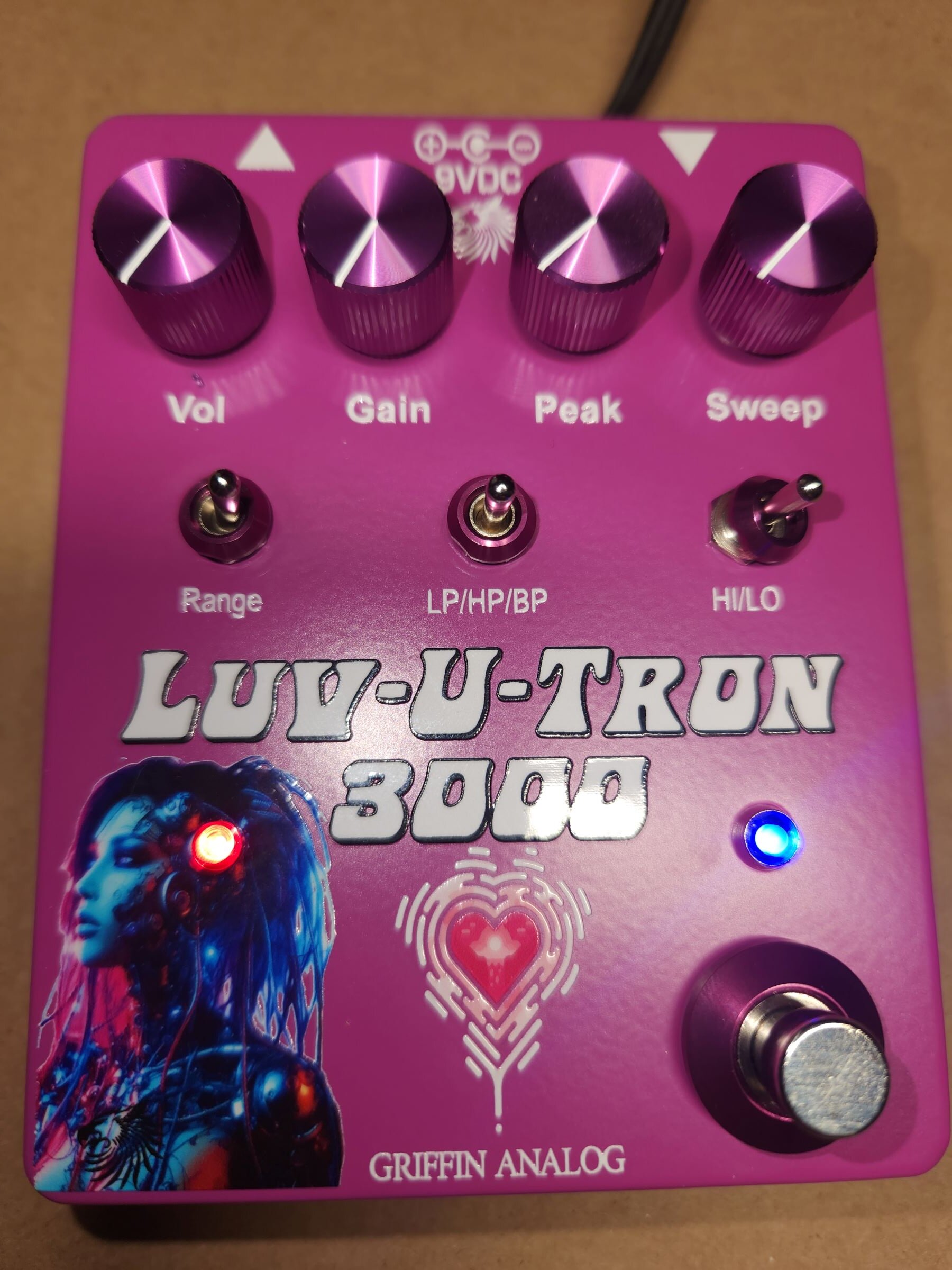 so the Luv U Tron 3000 was born ........ an awesome Mutron III clone ..... I actually put one of her artwork pieces on the bottom of the pedal and gave her a extra plain bottom so she could display the artwork ...