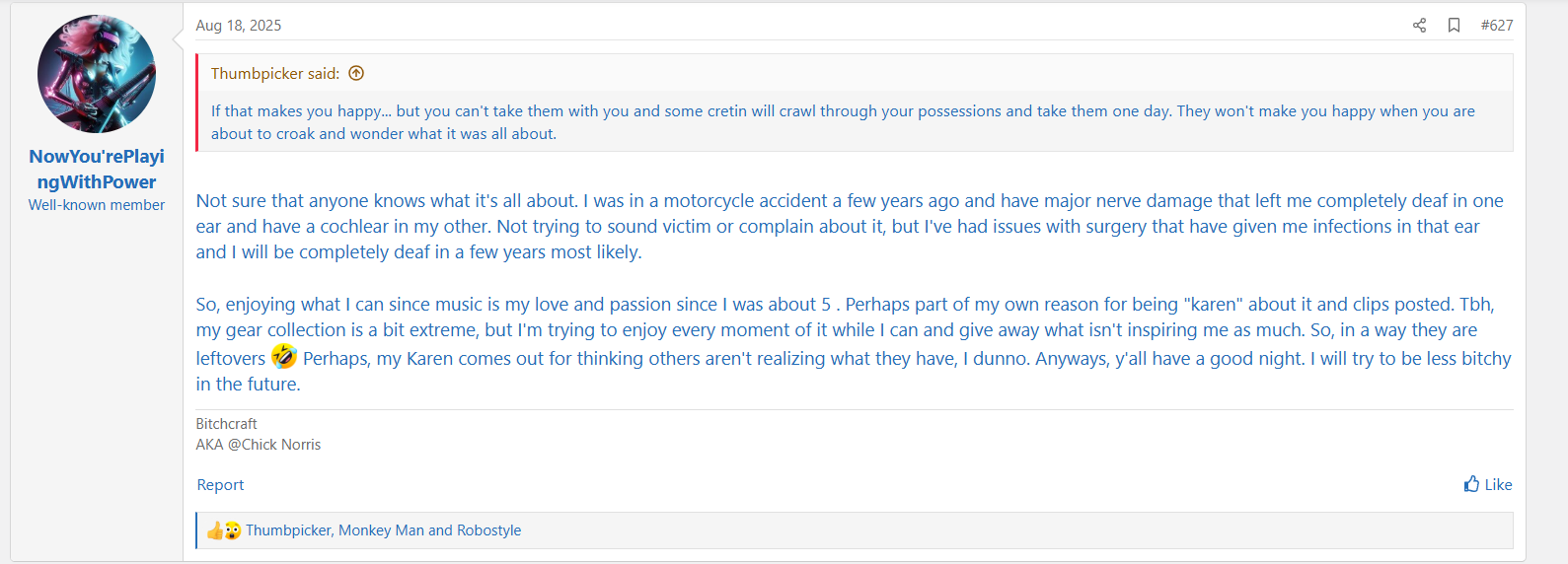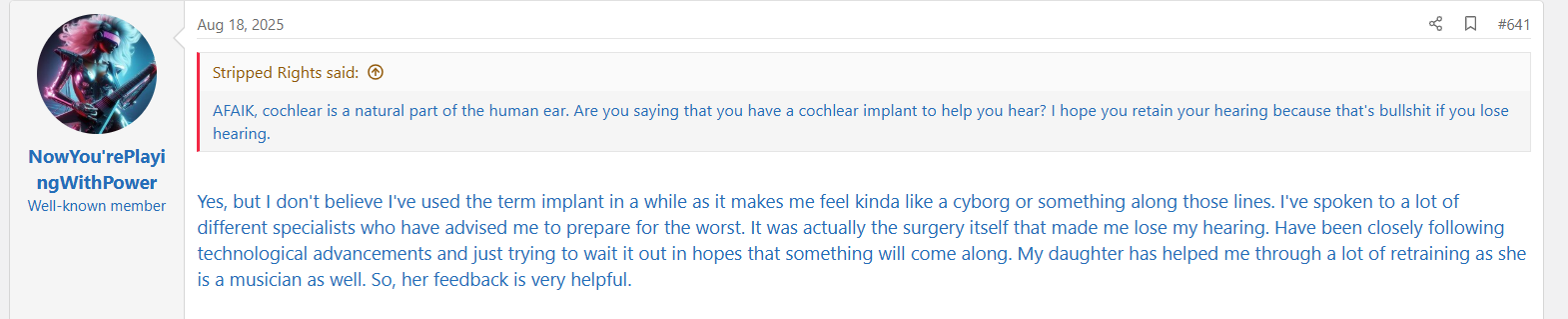Like a lot of you it seems ..... I also considered her a online friend ..... she never mentioned hearing loss to me .... she mentioned family ... music ... gear .... gear and more gear ... she bought several of my pedals ..... she even sent me a huge box of electronic parts that I use all the time ...