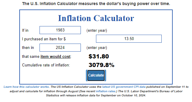 That's $31.79 too much to pay for MC tickets.I know it's not a very scientific approach but just for fun I ran the price of the ticket in 1983 into an inflation calculator