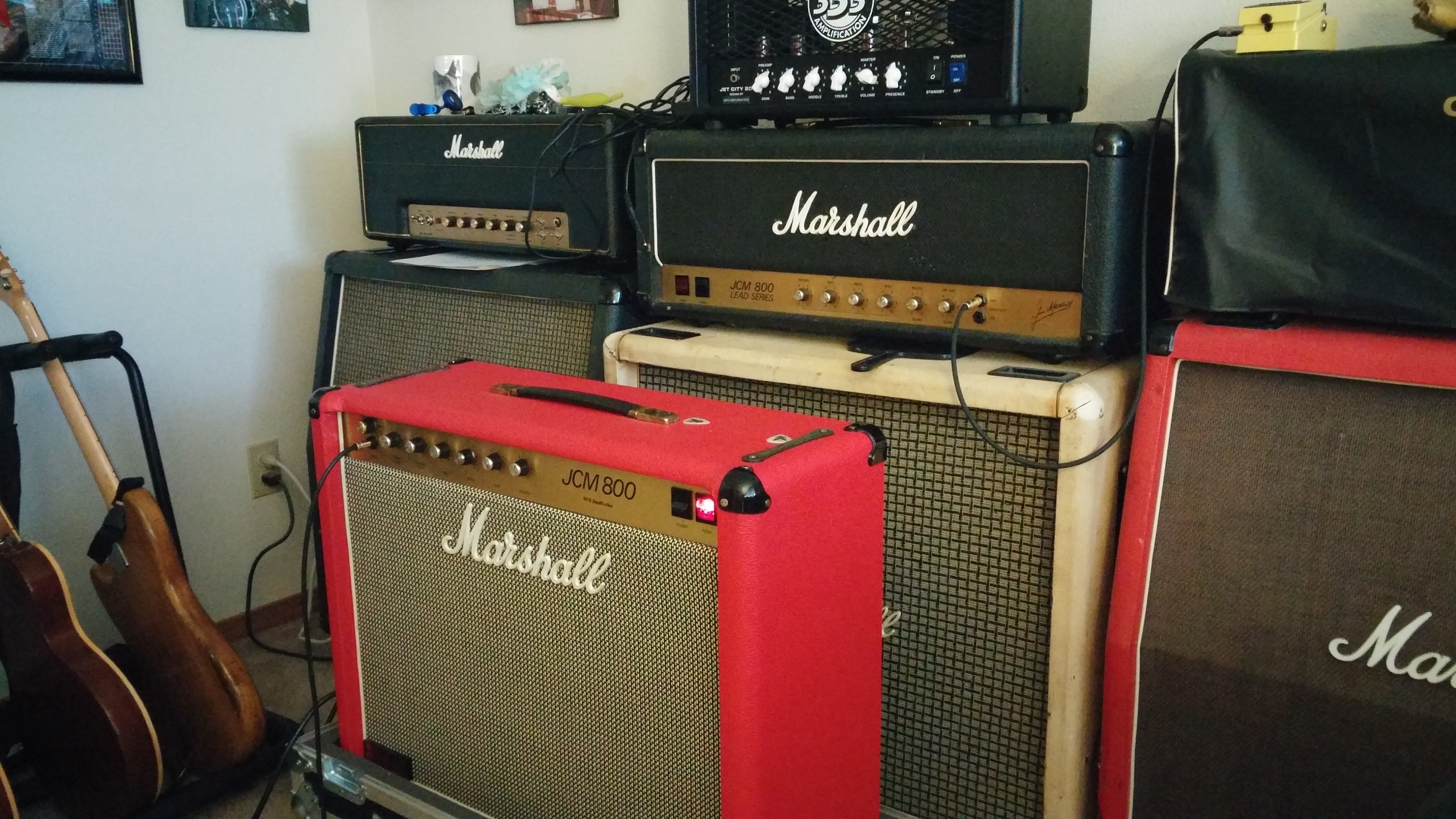 I'll be honest and tell everyone that I never gave the split channel JCM 800's a thought. I was always a 2204/2203 or a 1987/1959 guy. About a year ago, a friend of mine wanted to trade me a 4212 for my Mesa Studio 22+ combo. Having very little money tied up in the Mesa, and after playing the Marshall, I decided to go for it. I knew the Marshall needed some work but I decided it would be fun to tinker with. Ended up changing some pots and threw in a fresh set of 6550's as well as two G12H-65 70th Anniversary Celestions, as it had a reconed (very poorly I might add) G12T-75 and a V-30. Bought a 2x12 roadcase off a different friend and VOILA...new rig. Throw it in the band trailer and forget about it.
