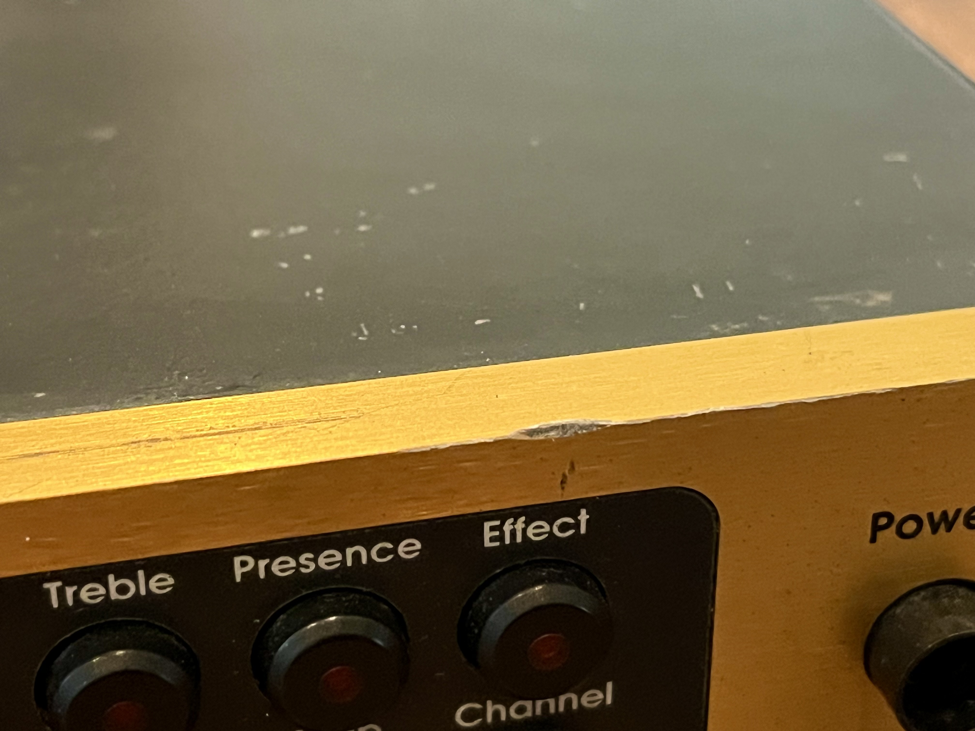 The “input” font is slightly smeared. And the power button is missing the end cap. Otherwise all there. Cosmetically very nice. One small ding at top edge as shown. Rack ears have mounting bolt marks. Nothing unusual.