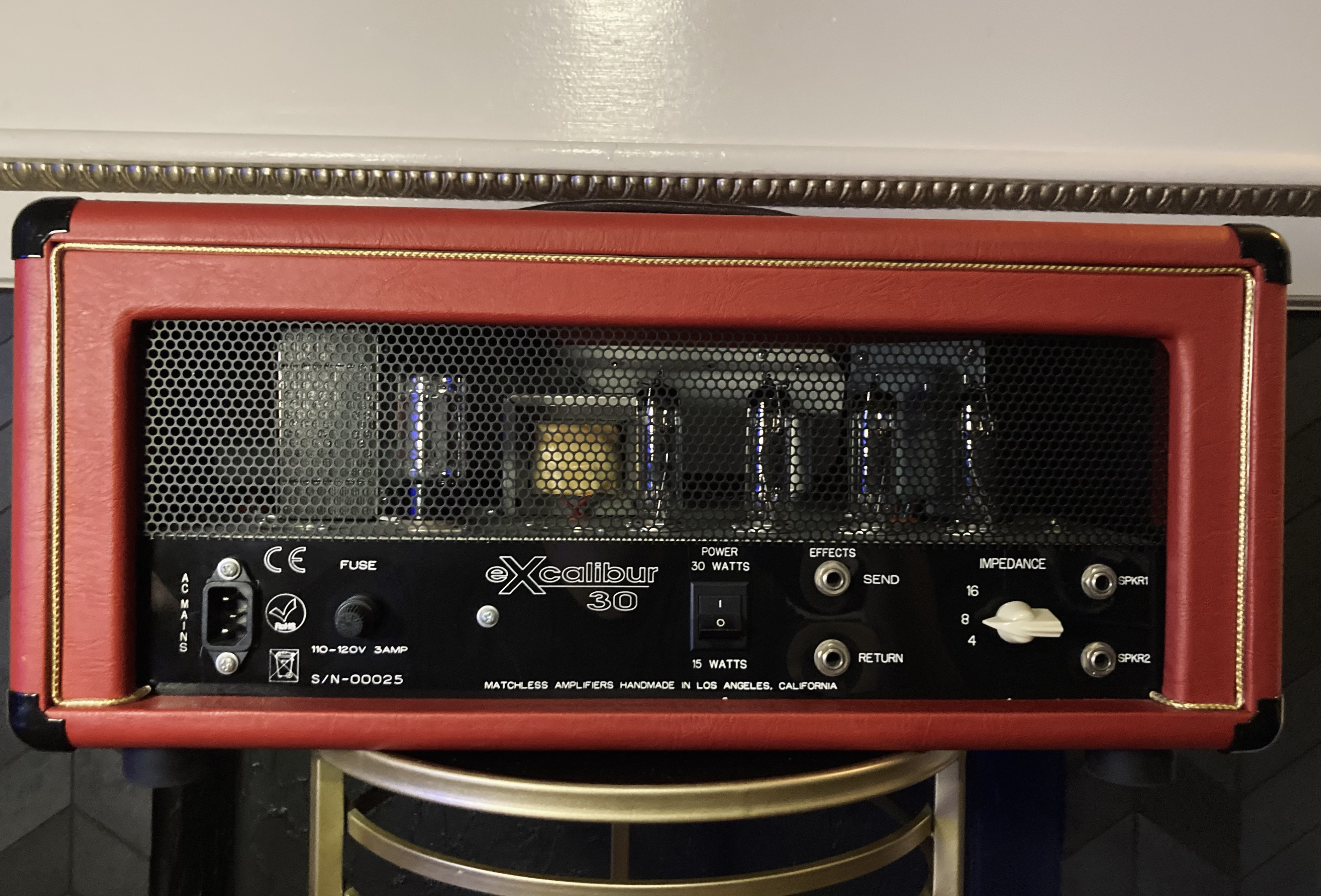The EL84-based eXcalibur 30 is loud, chimey, and articulate with plenty of gain. Of course bold and harmonically complex Matchless cleans are accounted for although it doesn't get squeaky clean above bedroom volumes. These were designed with the OD channel of the Independence in mind. I had an Independence and this is a different animal. Outside of the difference in the power section, it's much more saturated and fills a larger sonic footprint. I'm not saying it's better, just different. This head has a few things in common with the Avalon platform: Hybrid construction including point to point wiring, circuit tracing, and turret style construction & these amps tend form cracks in the plexi front/rear panels. I tried to picture all faults as best as I could. Also, on a side note the front and back wood panels are velcro'd on which was in interesting choice for Matchless. I've never had a problem with them coming off, rattling, etc and it actually makes changing/rolling tubes super convenient.
