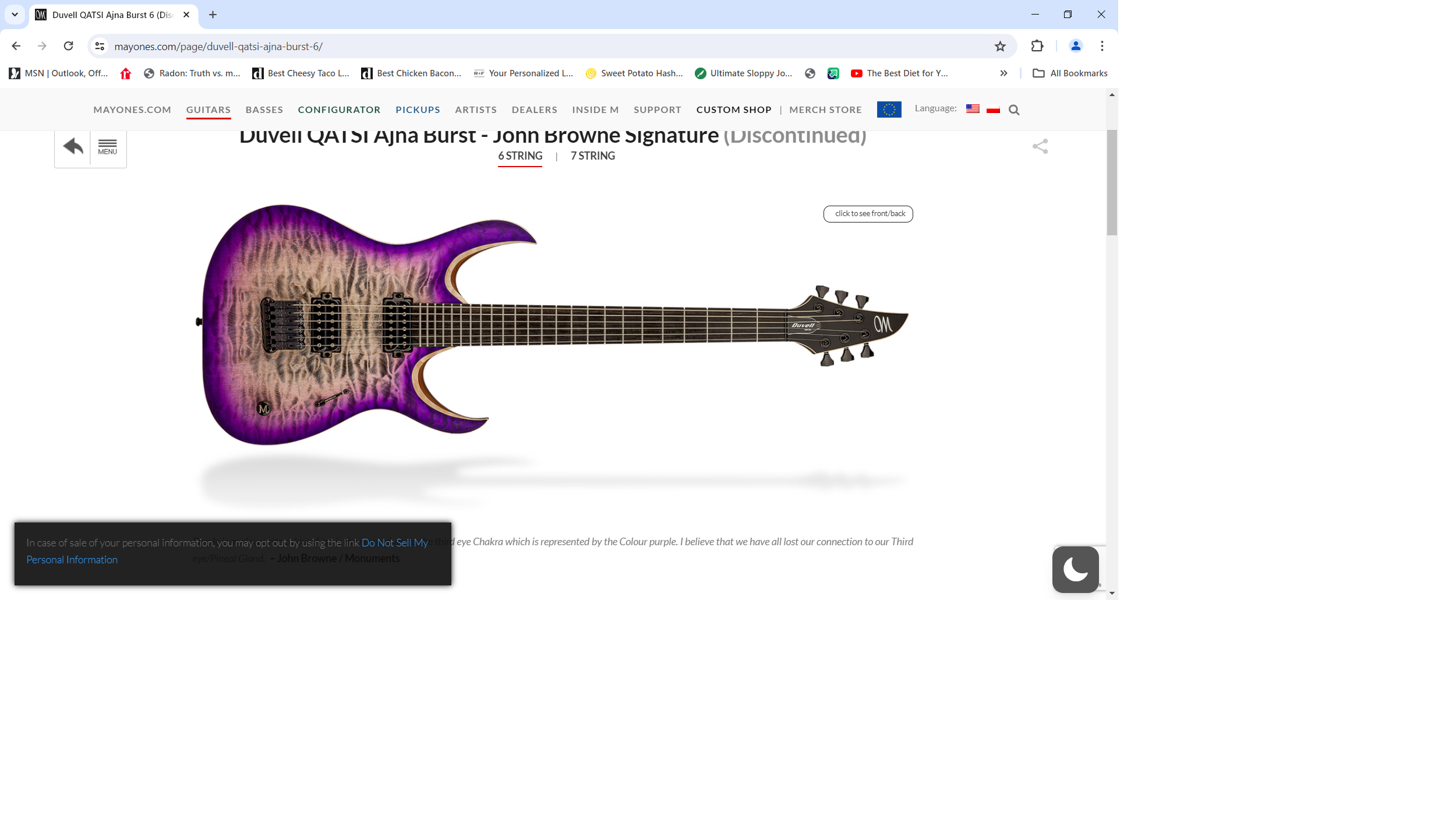 Absolutely killer unique Mayo Duvell. I've owned this guitar going on nine years, it is incredible and not many of these around. Fun fact, this is actually the very first John Brown Qatsi model ever built and was in John's possession for a while. You can still see this exact guitar on the Mayo site under their discontinued models (Screenshot of it below). I'm in the process of selling damn near everything to take care of life priorities and this pains me more than any piece of gear I'm letting go of.