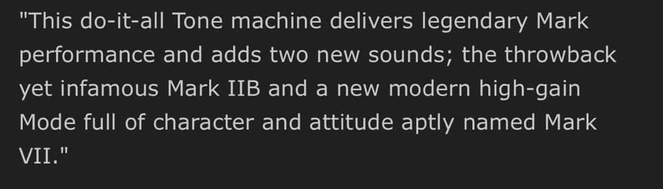 I disagree with that statement. Having more command over your tone means you have a better possibility of finding that tone in your head, but there is a point where too much complixity does kinda make an amp suffer. A lot of it is just switching in and out parts of the circuit that would already be there in the first place, well that's all it is... an example of complexity equaling better tone, well i'm one of those that think the Mark IV was a big improvement over the III. The III was just kinda grating tonally... and a bit honky unless you brought that 750hz WAY down.In the end though, simpler always=better tone. Looking forward to what they come up with. It'd be nice to know even a little about the few Mk VIs that went to artists....