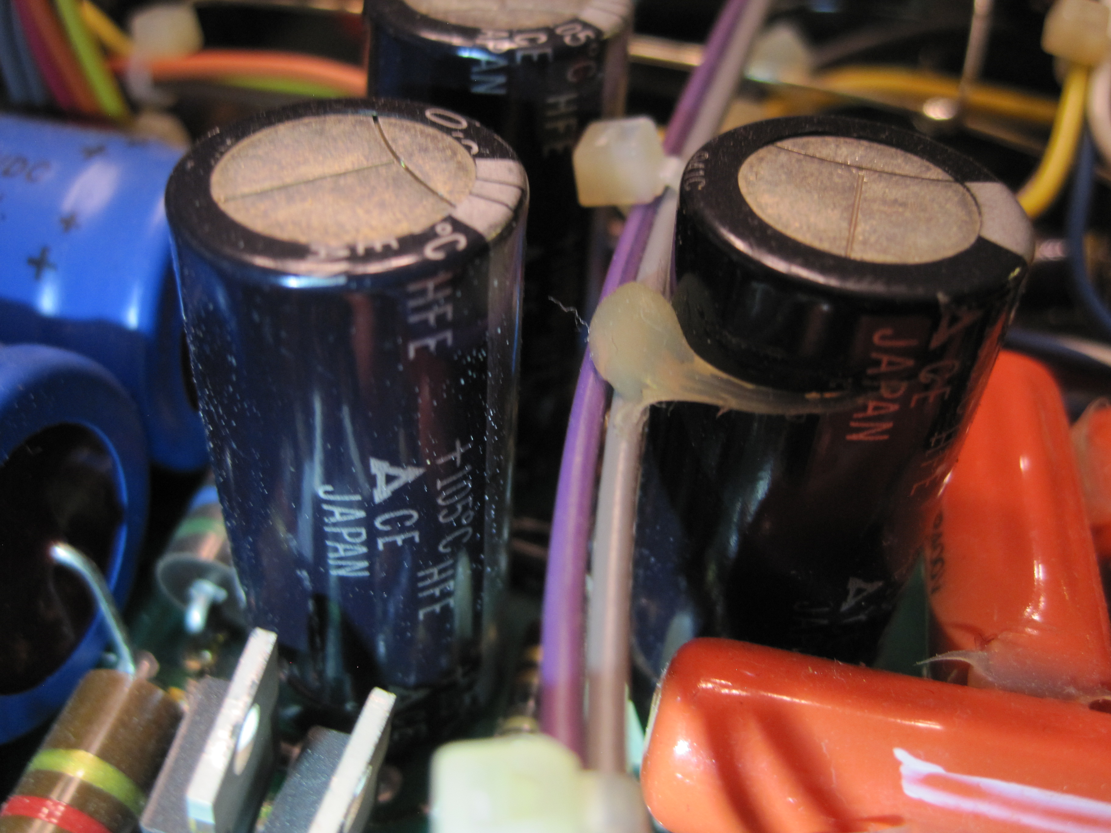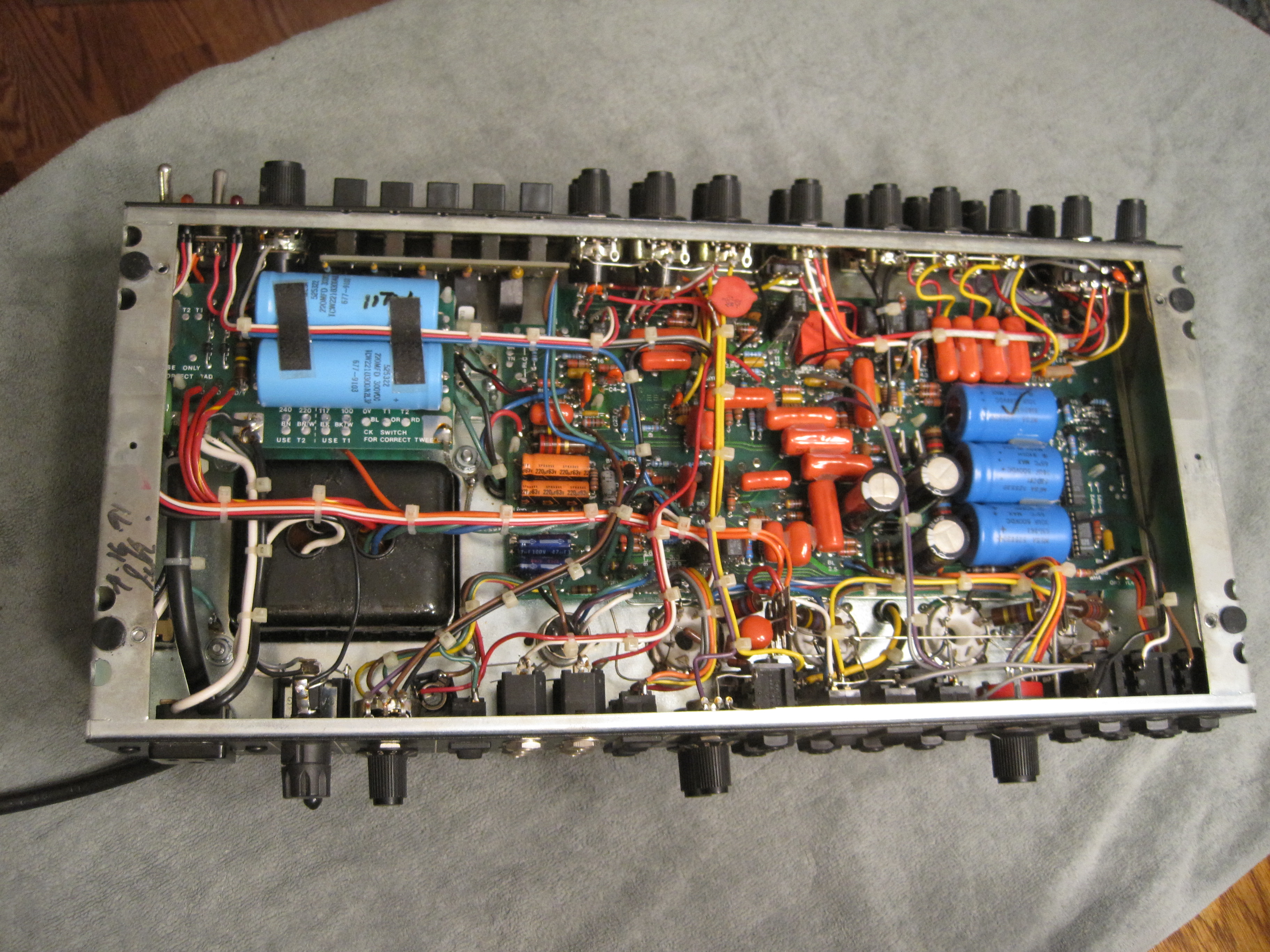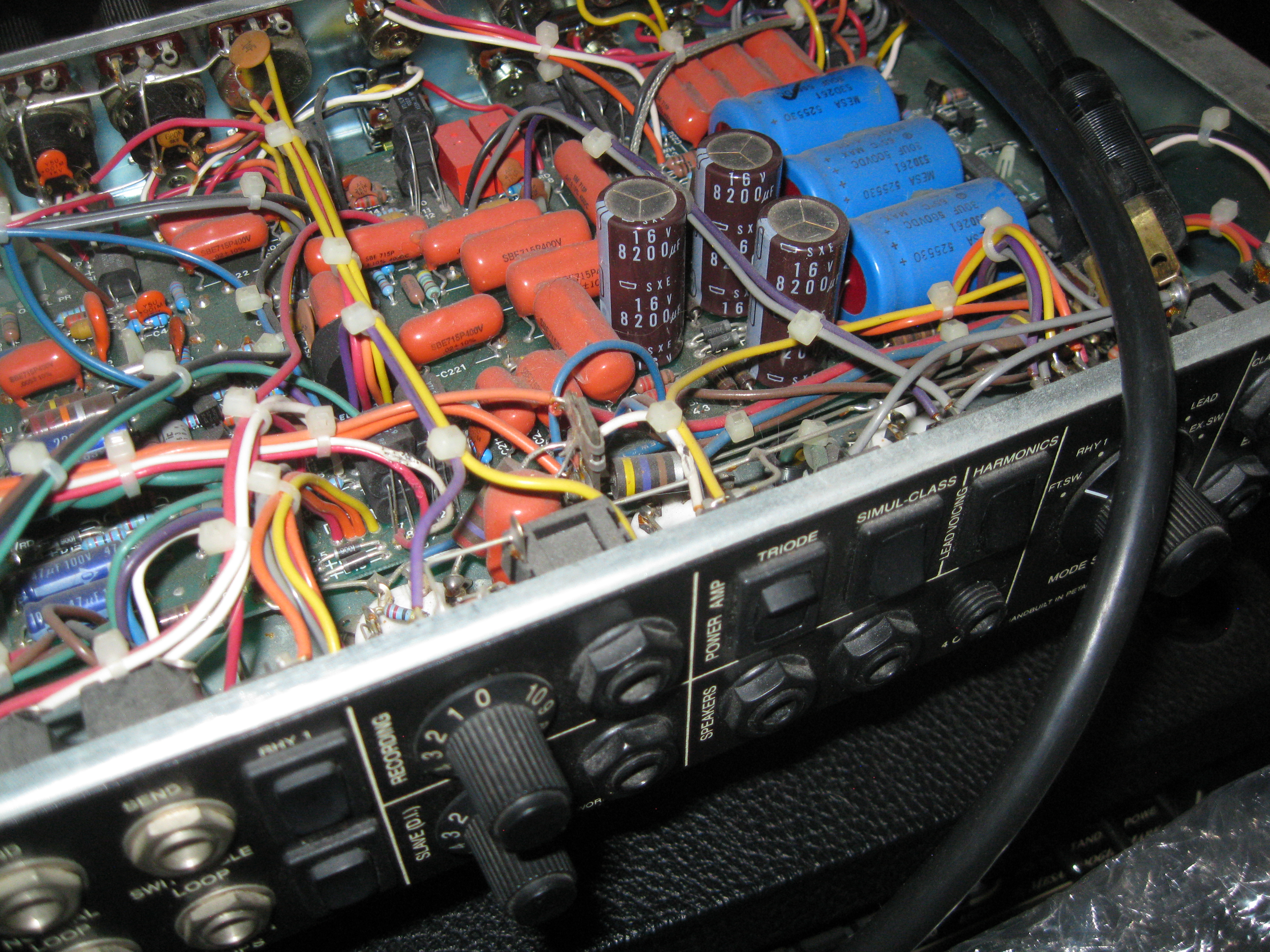 After buying the amp someone told me about the brown leaky radial caps on the pre amp board so I searched and found people talking about horrid clean up jobs that the factory charges by the handful as it must be a nasty job. I pulled my newest chassis, sub-1000 serial # to have a look. I saw the 3 large brown radials sticking up but mine were 8200uF, not the 10KuF ones I read that everyone was having a problem with.