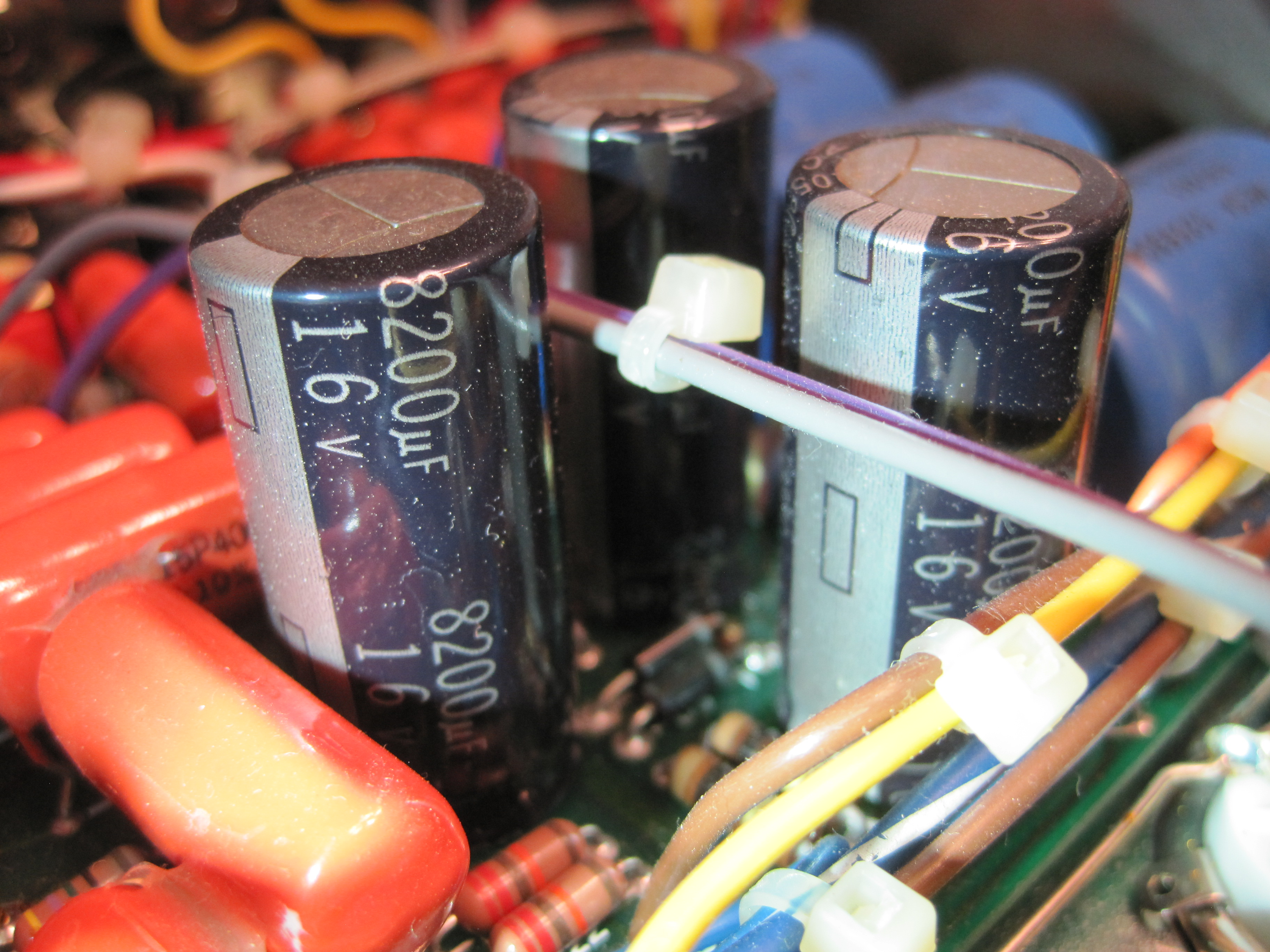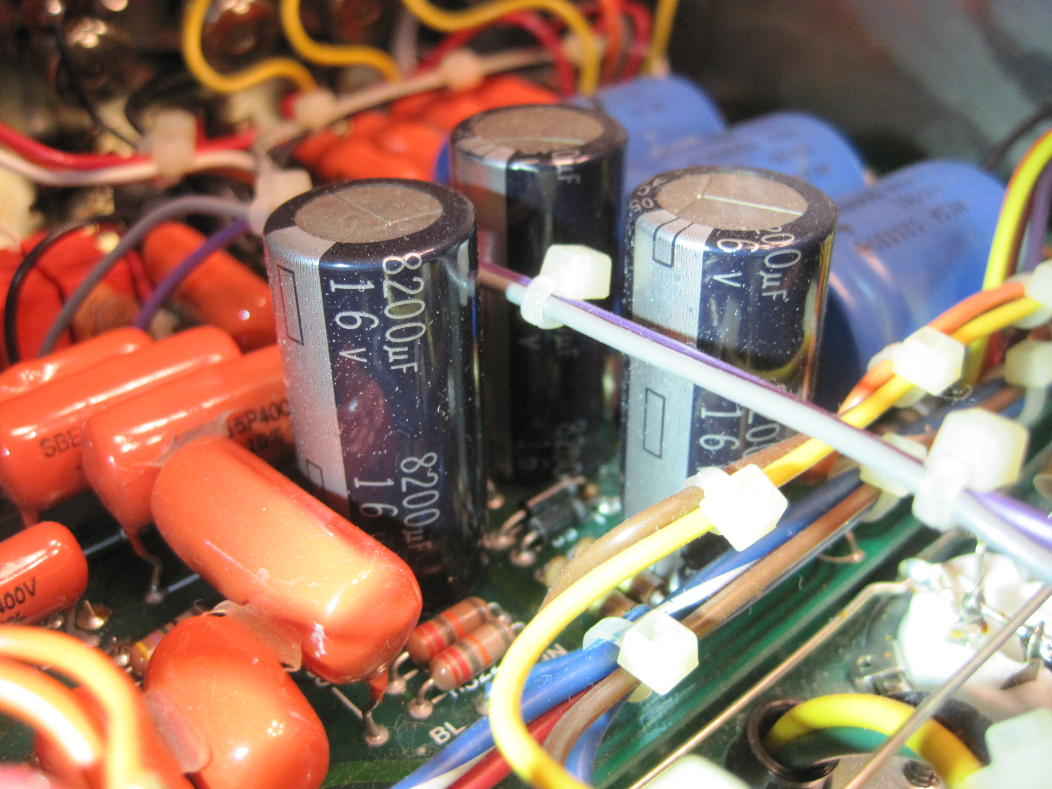 "The 8200mf caps are NOT the leaky troubled caps. I have seen a few break loose from the board, but can't recall one that has leaked. The nasty ones were the SPRAGUE 10,000 16 volt."