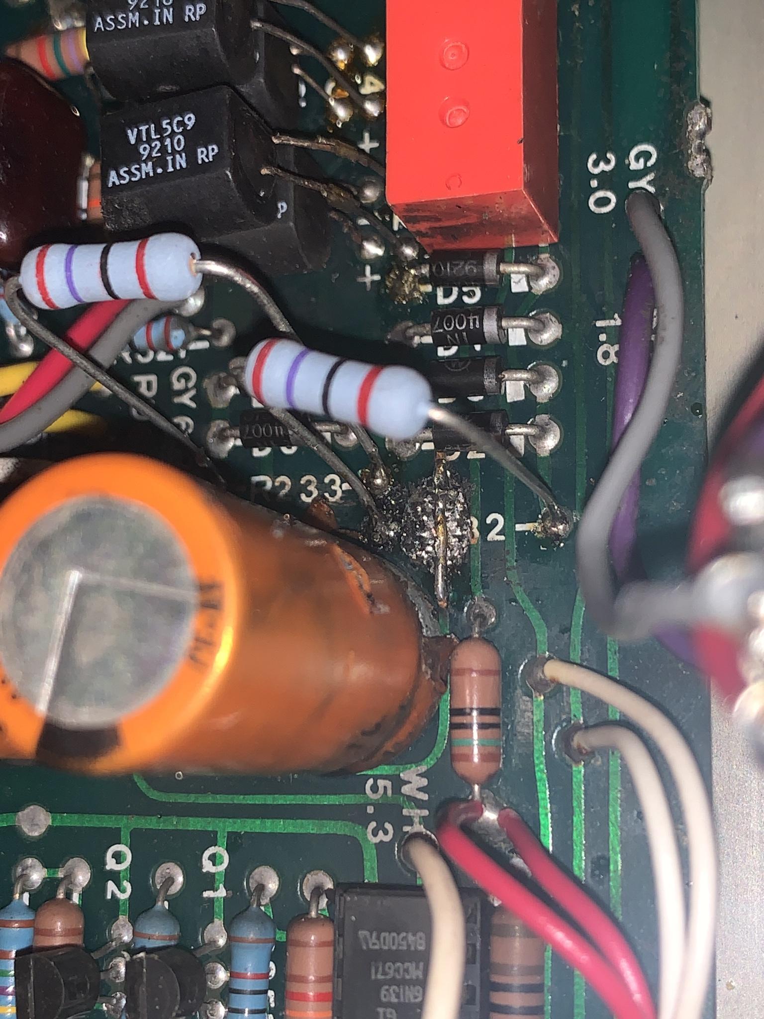 I had a Single Recto Solo head that burned some resistors and burned the section on the pcb right below where the resistors cooked..I called Mesa and they were really helpful...I did take the complete chassis to a repair shop and they decided they didn't want to work on it..they said they don't work on Mesa amps because the resistors etc are way too close to the pcb(s) and create a lot of headaches later on down the road..The only way to fix that is to carve out the burnt sections of the circuit board and re-route any affects circuit paths. The burnt board creates a carbon path for short circuits. No repair for it but to remove it. or replace the board.