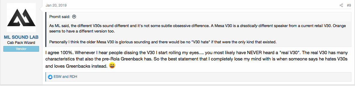 Also, an IR developer chimed in about the differences in V30's over on the Fractal forum, and shed light on different Mesa cabs: