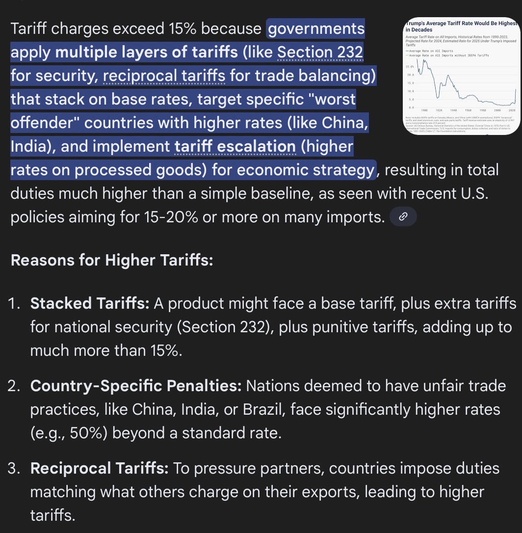 You’re looking at “baseline” tariffs. They are not the bigger picture. There’s ton of other moving parts and charges to both sides within the all the convoluted rules. That’s why the effective tariff is much higher.