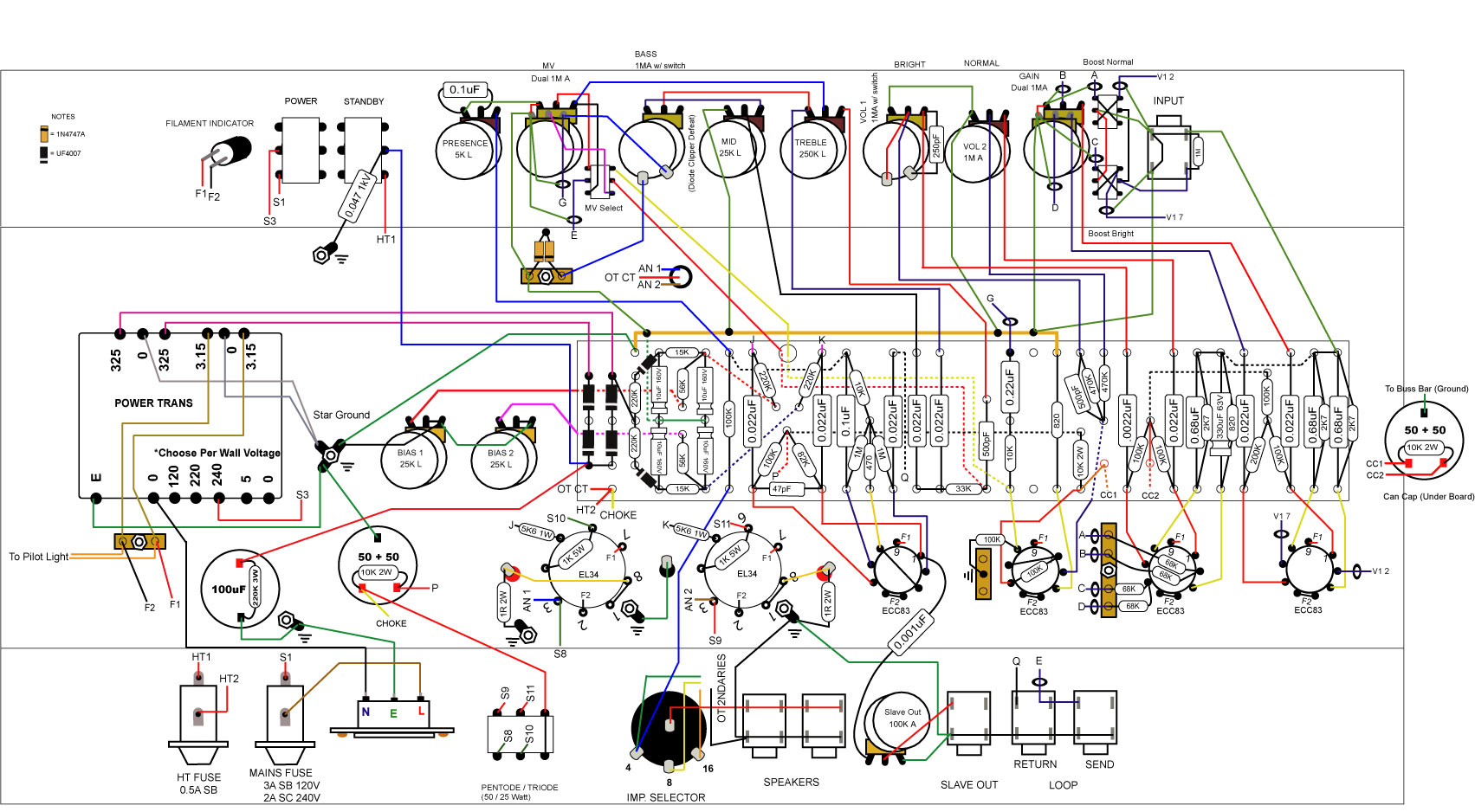 I’m just not a fan of the top schematic. How would that have more dynamics than the circuit I drew up?I can see why that circuit sounds so stereotypically '80s lol. Not my thing. If I were building that one, I'd make each plate 100K (get rid of the extra 100k and lower the 200k); make the first coupler 0.0022uF and the rest 0.022uF; add the 0.68uF bypass on V3 (maybe); change NFB to 49K/8 ohm; add a depth control with 2200pF cap; and replace PT for one with proper 350v secondaries. That circuit from Ceriatone is probably running too low of a B+. This would no longer sound '80s though. Would be more modern. '90s hard rock/metal with a higher output, mid-heavy pickup like a Duncan Nazgul.