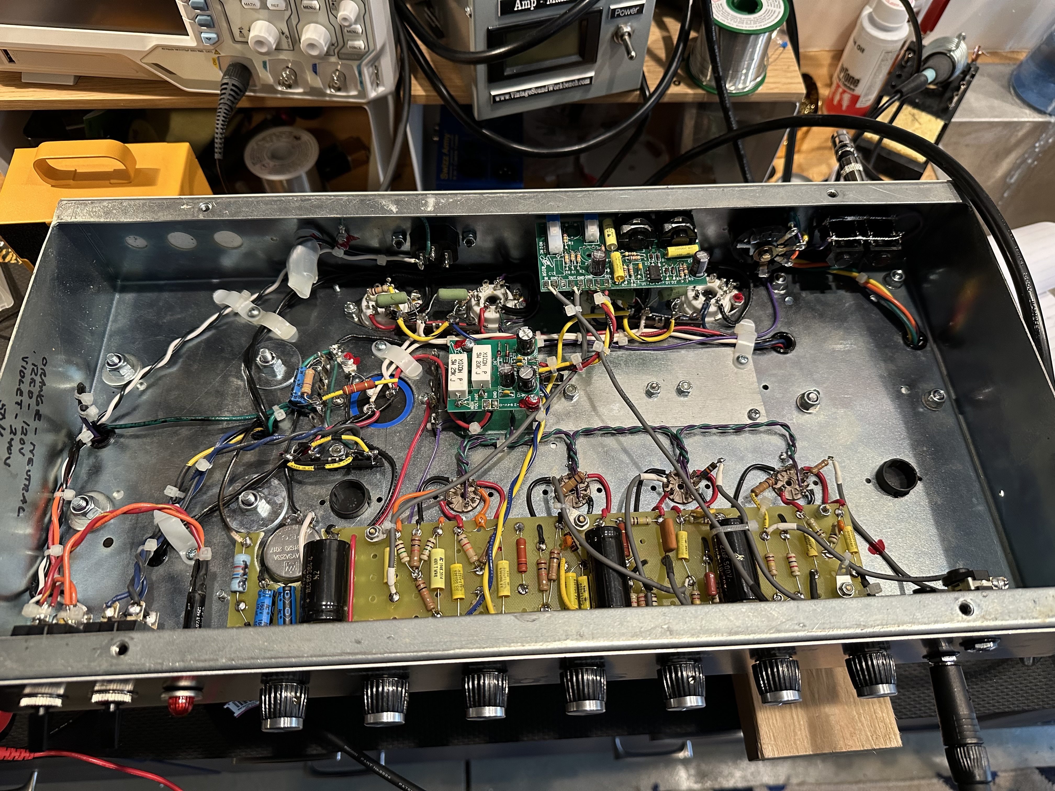 He has told me several times that schematics don’t mean much in his brain. He is constantly moving wires around and putting them in non-traditional paths to make things better, whether that’s floor noise, tone, safety, or whatever. So yeah his builds may “look” sloppy. But I’ve lost count of how many Morris amps I’ve owned and have never had a problem.