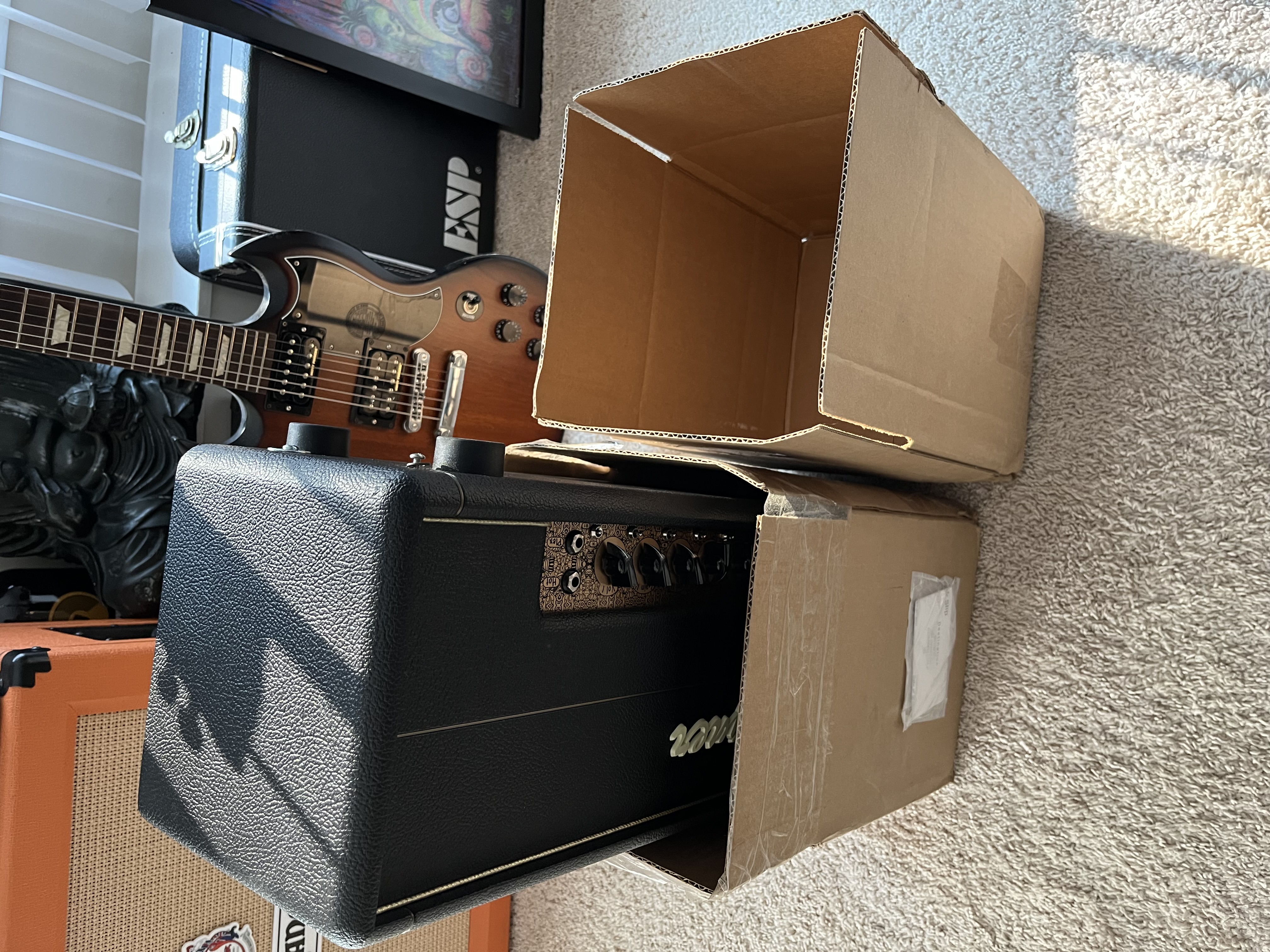 Amp is fucked. One chassis screw is hanging out of the bottom and tranny is bent. I can’t believe the headshell is intact. Powers on, no distortion, volume and gain all the way it’s barely like a loud tv.