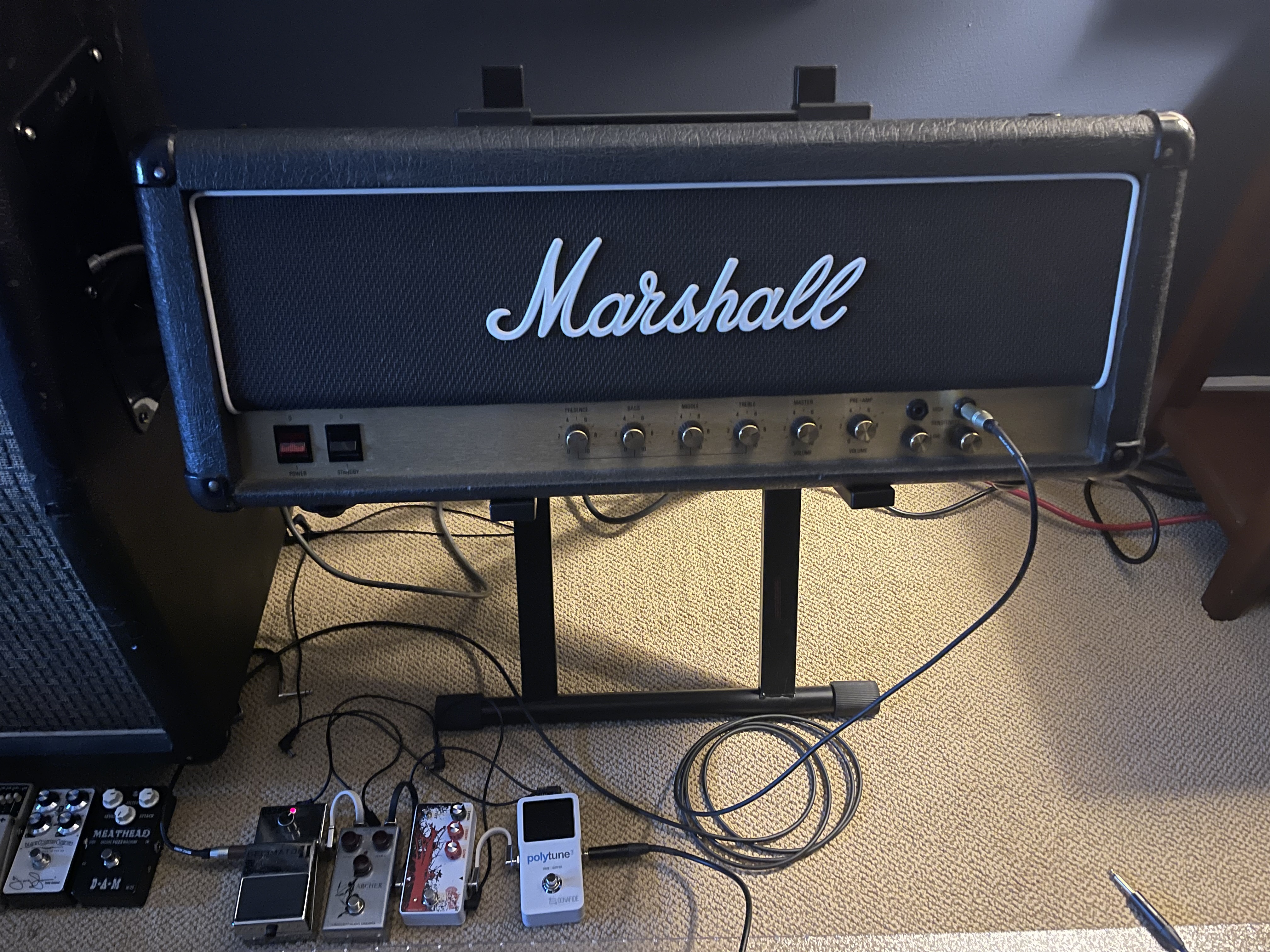 If you’re plugged into the left input, it’s the normal low input 800 circuit. If you’re in the high input with the extra knob on the right pushed in, it’s a stock 800 circuit. Pull out that knob and you get the extra gain stages, plus all three gain knobs are active. It took a couple days of playing around with it, but now I have it dialed in and it’s one of the meanest sounding amps I’ve owned. You can dial up quite a bit of gain (like sludgy death metal levels), but still retain that tight percussive Demanufacture palm mute. I’m using an EMG loaded ESP baritone, so I still use a Dirty Tree pedal to keep the low end clean.