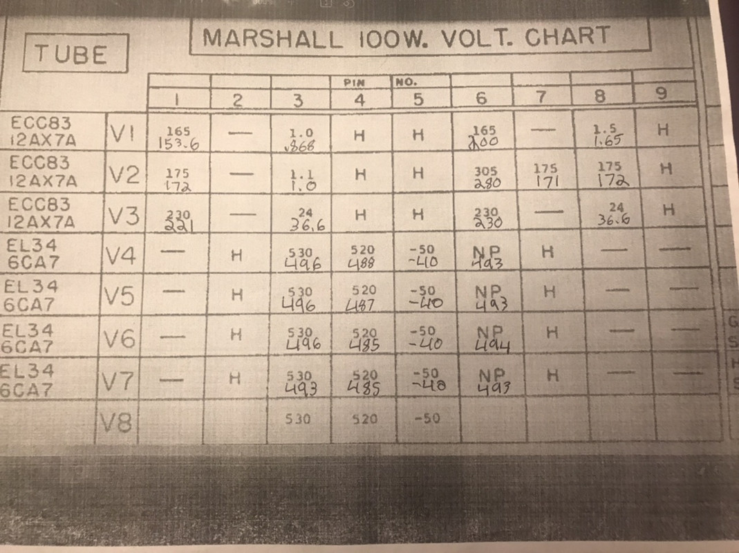 Where was the B+ on a 1970? Were these originally 500DCV and above? Acccording to Dave Friedman the 12 series 68 that sound best were around 460DCV supposedly. I don't know what year this voltage chart is applicable to but it might help.With mains at 120.4v AC: