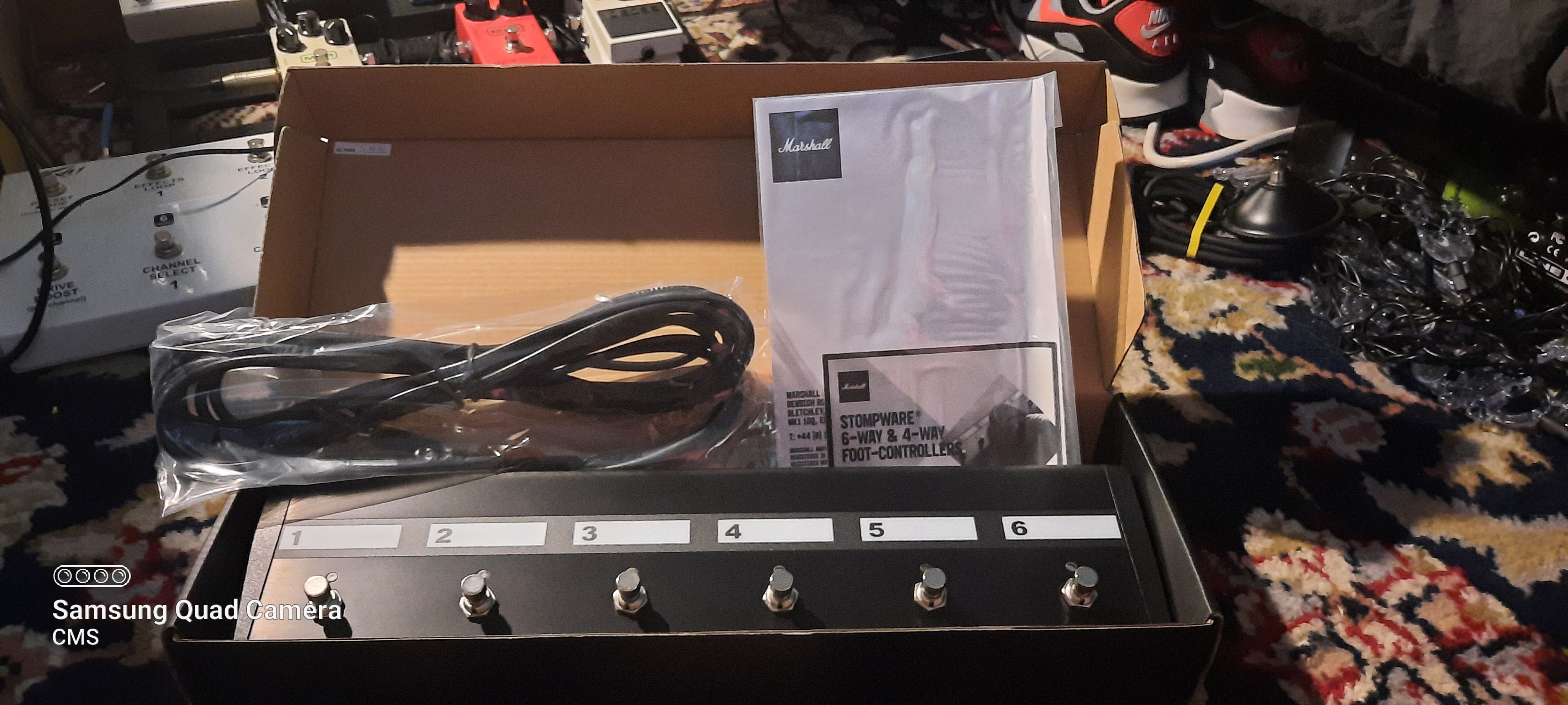 Just got my 6 button footswitch for my new Marshall DSL100HR. It was sitting by the desk when I got home from work. Got the Marshall over the weekend on Saturday, and other stuff has trickled in here and there over the past few weeks too. Other stuffs includes, Two Notes Torpedo CAB M+ and Torpedo Captor 16, Line 6 Pod Go Wireless, REVV G3 preamp/od/distortion pedal, Seymour Duncan JB Jr mini humbucker for my Strat, and of course the DSL100HR amp and the 6 button footswitch as before mentioned. Needless to say, I've got PLENTY to do in my free time over the coming days/weeks. Got a Peavey Invective 120 I'm looking to let go of and waiting on folks to start messaging far as that goes too. So it's gonna look a little less jumbled up whenever somebody takes that off my hands, but for now, even though it is a bit cluttered, it's pretty damn sweet and coming right along. Oh, and I can't forget the mini-JCM 800 my girl got me to keep from scratchin my gear up with all my keys, and from losing them too because I 'm terrible about that. It may just LOOK like an amp and not make any noise, but it looks sweet as a mofo tho and I dig it. One of those things I would never buy myself because I already know its over priced AF, even though I have no idea what she actually paid for it, and I don't want to because I'd probably ask her to take it back. But because it was a gift from her, I totally f'n dig it and it's staying on the wall