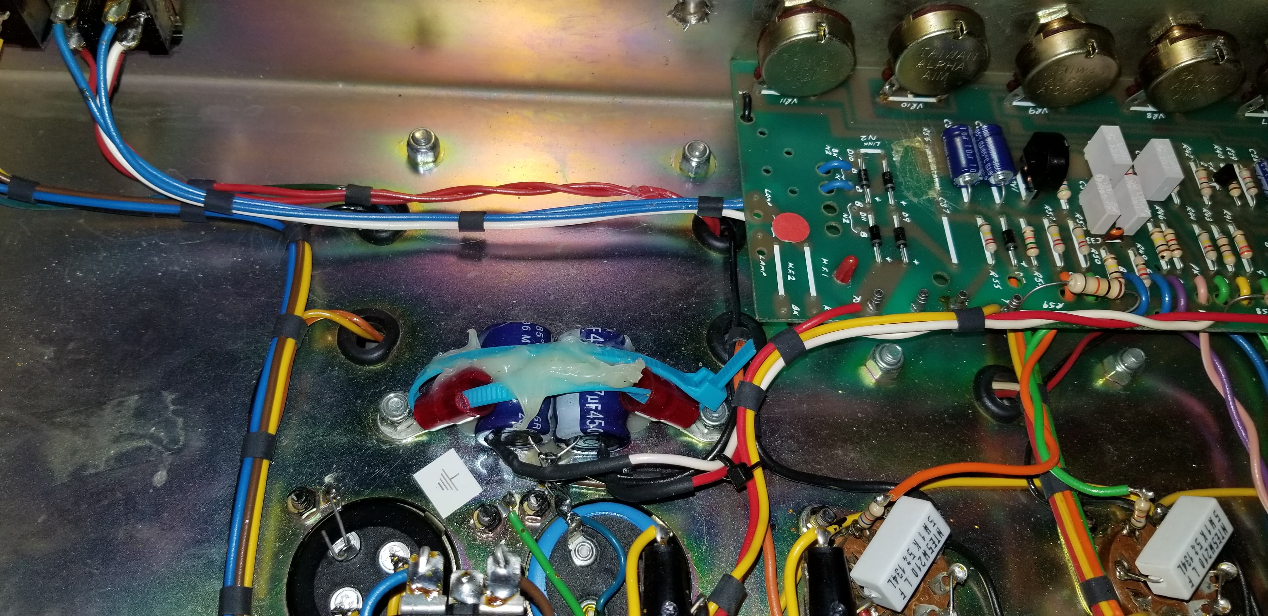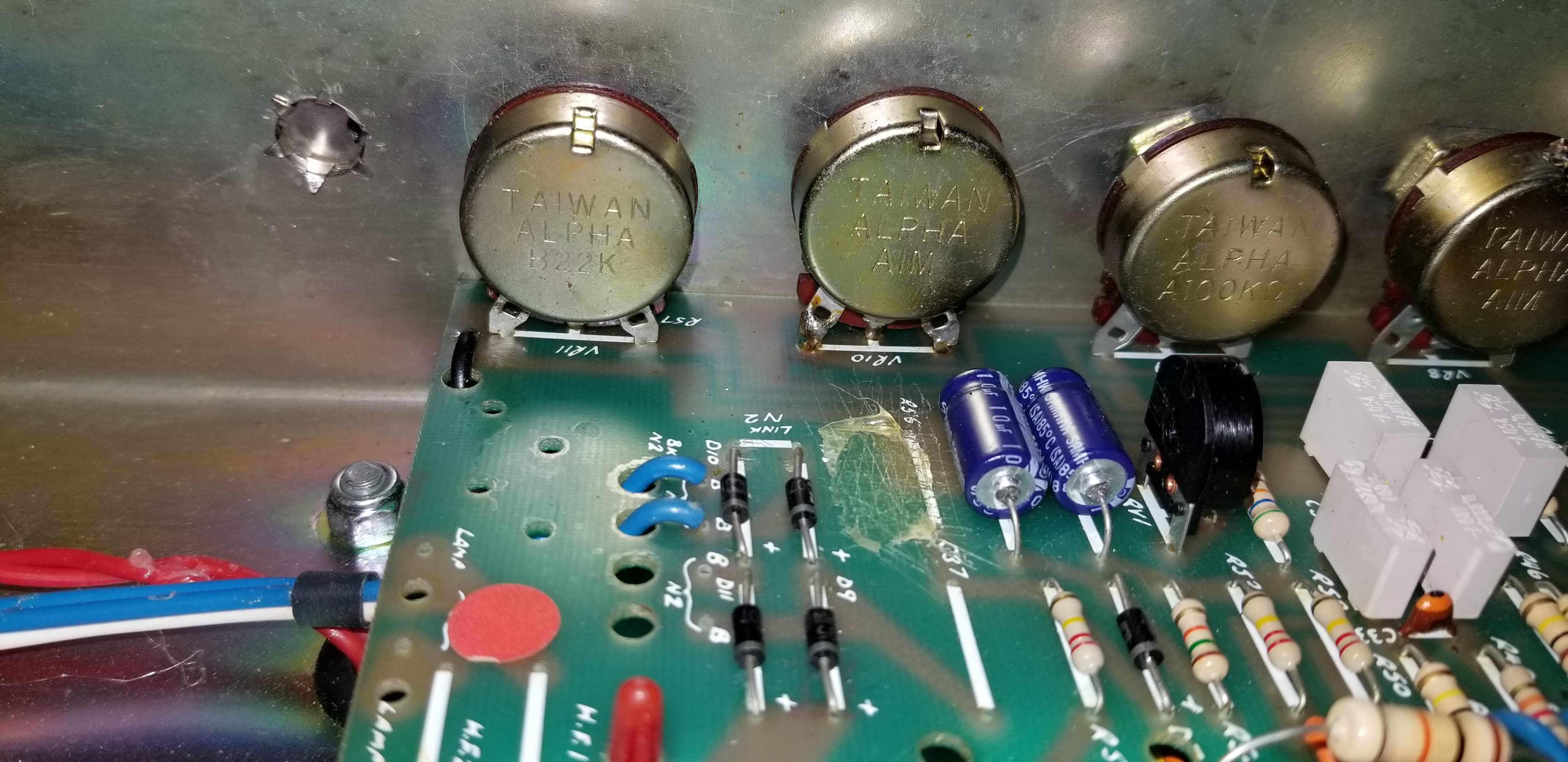 Opening it up, I immediately noticed it had 2 additional caps wired in with the original LCR cap, so someone added an extra filtering stage at some point. Bonus, I guess. There is also a spot next to C37 where someone had glued something to the board, and then removed it later. There is also an additional hole drilled in the front that has been plugged, so someone reversed whatever mod had be done at the time. I'm thinking that's a perfect spot for a depth pot.