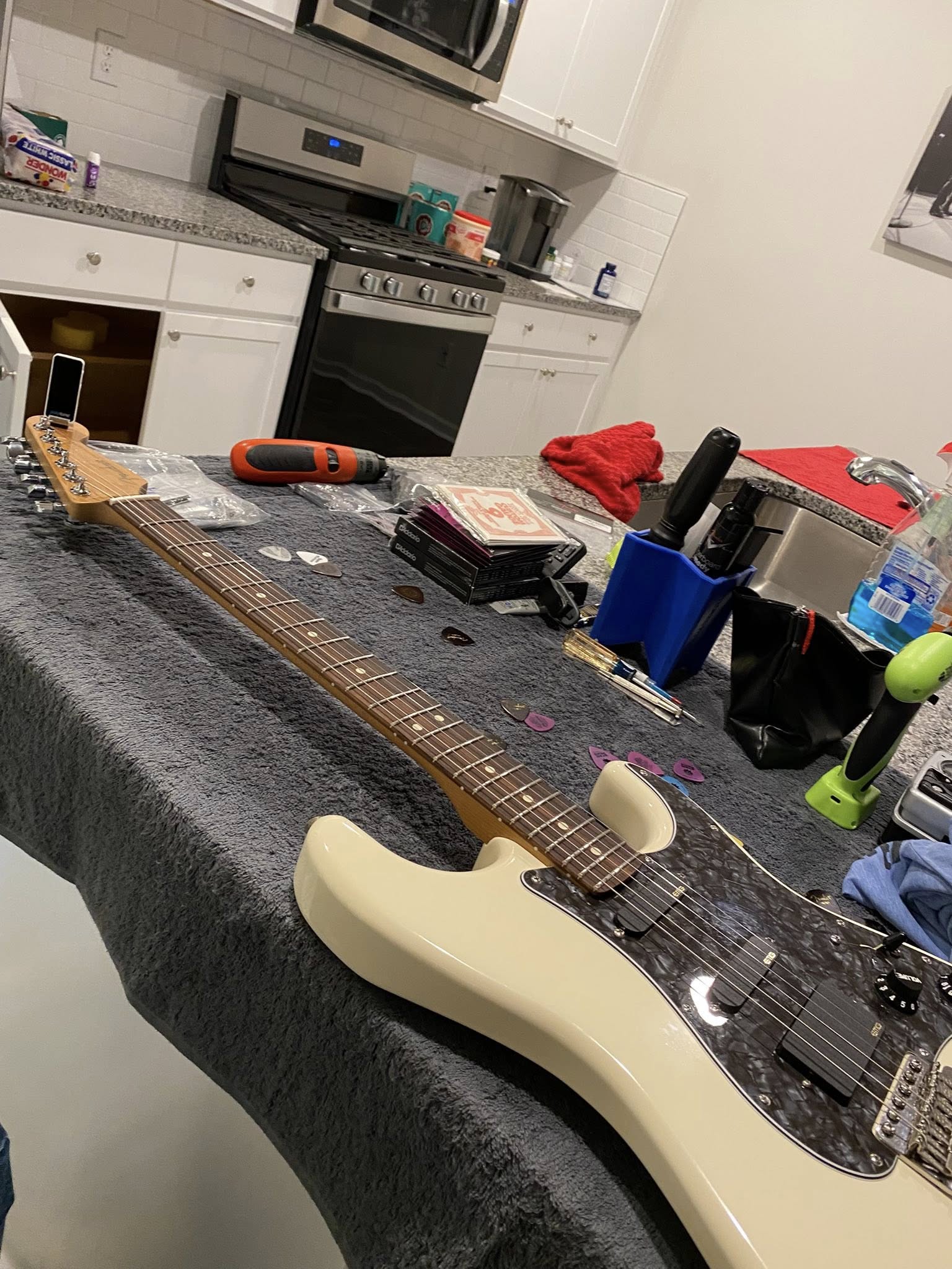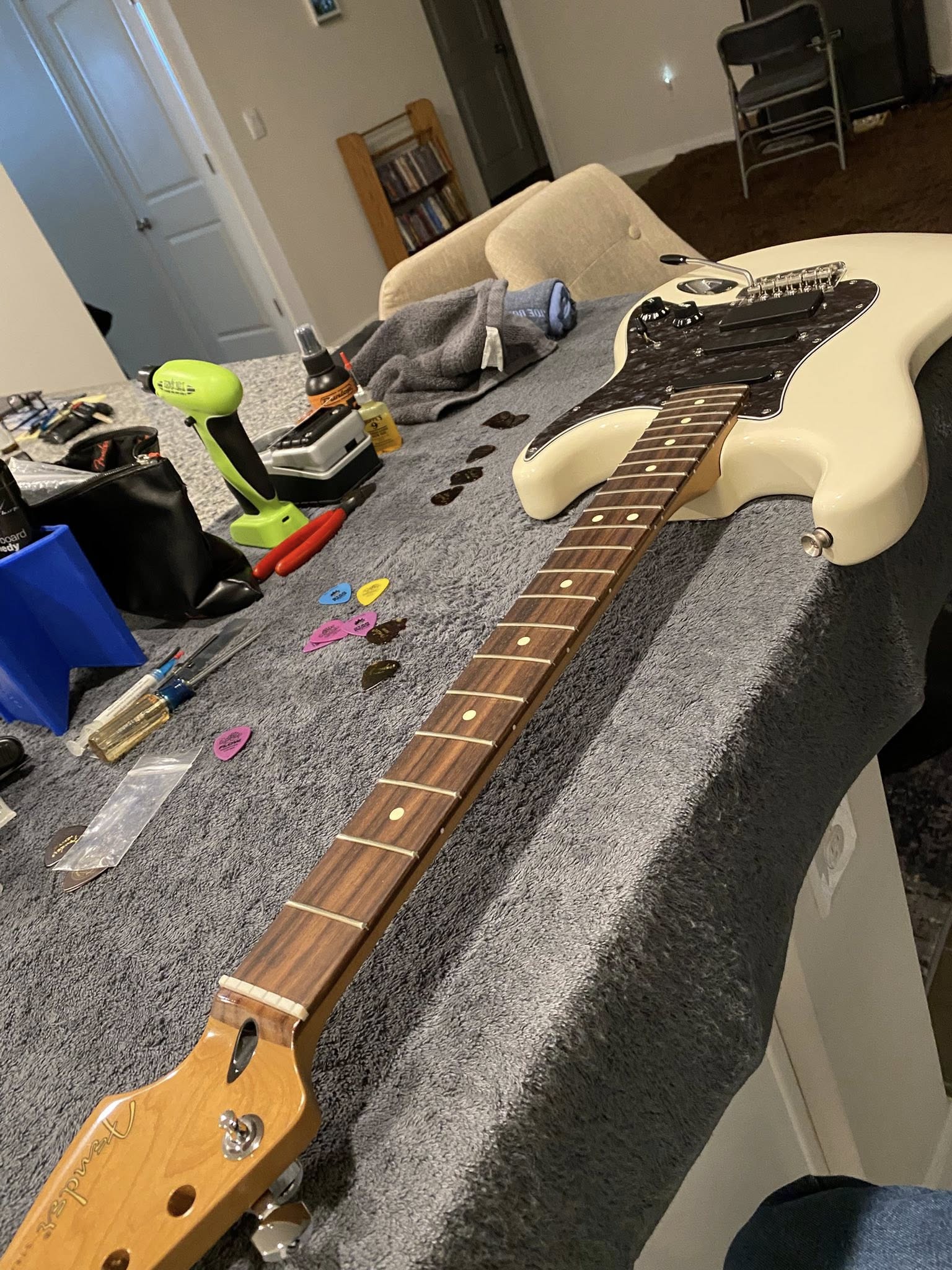 Put on a new Roasted Maple/ Rosewood Fingerboard neck. 12" radius, jumbo frets, rolled edges. Also put locking tuners on.