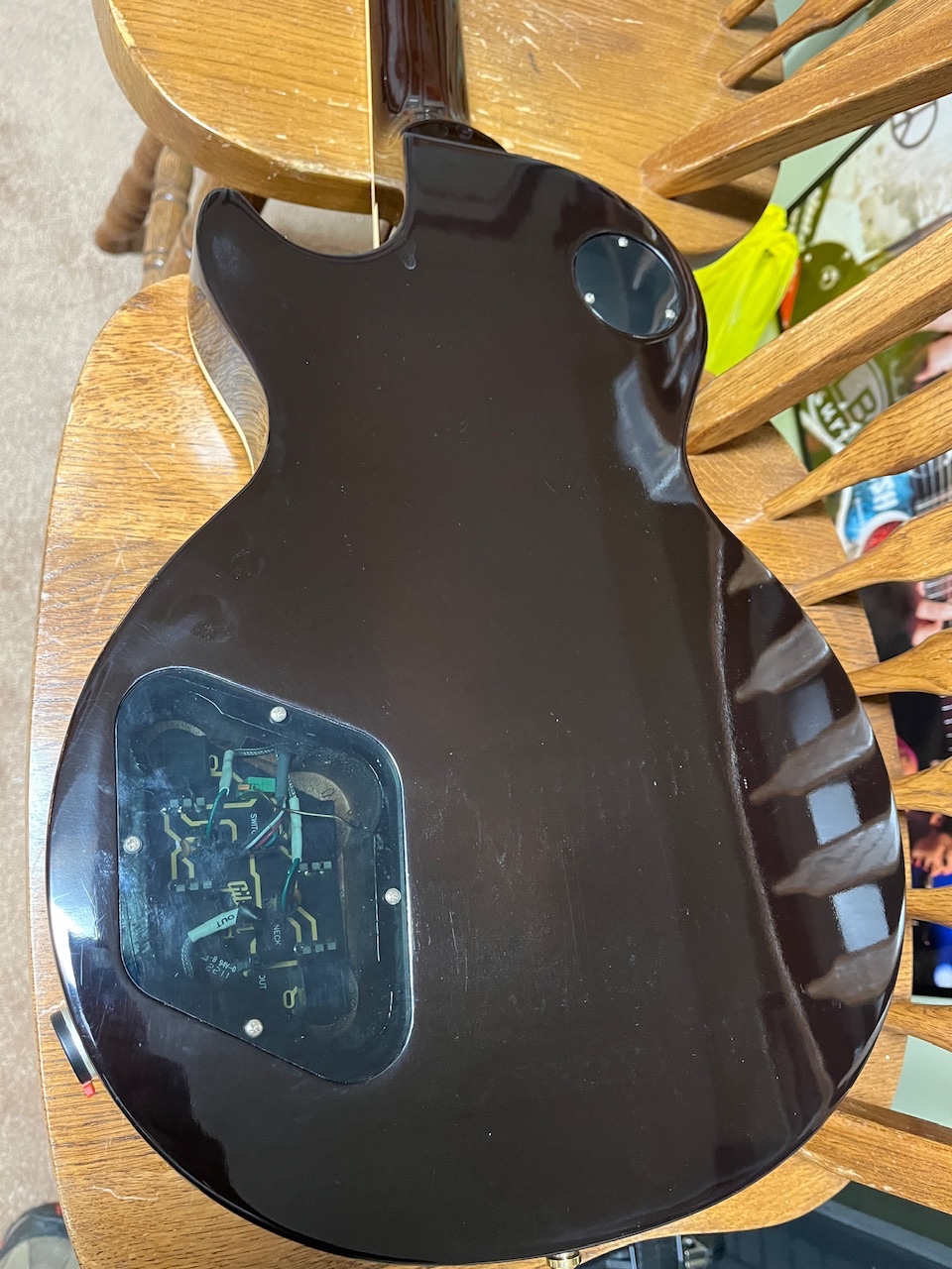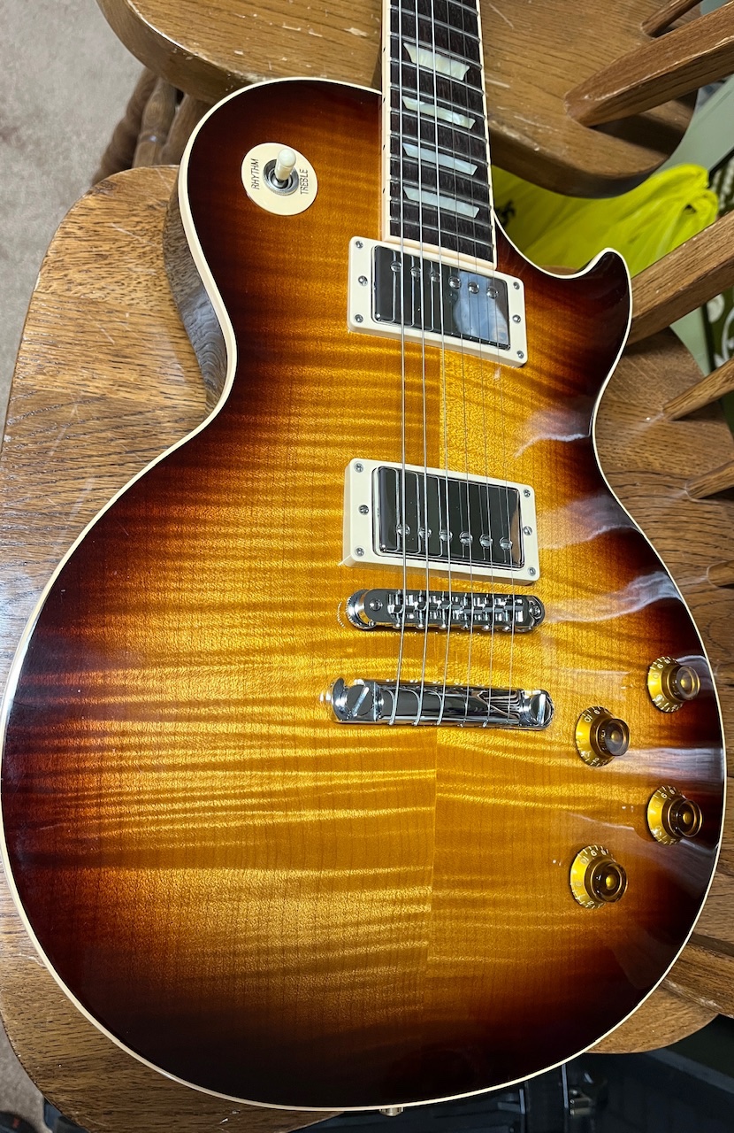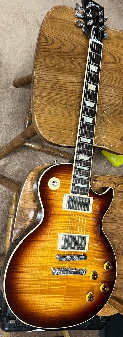 This tobacco burst LP Standard catches my eye. I pull it down, plug it in. ITS NICE. Good tone. Desperate need of a setup and new strings!!! It does have that damm circuit board electronics!!! Oh well!!!