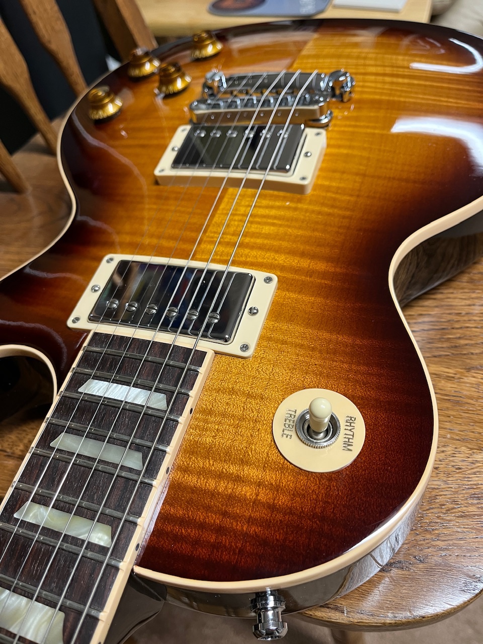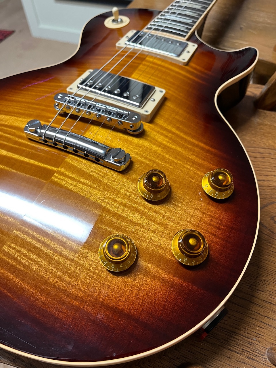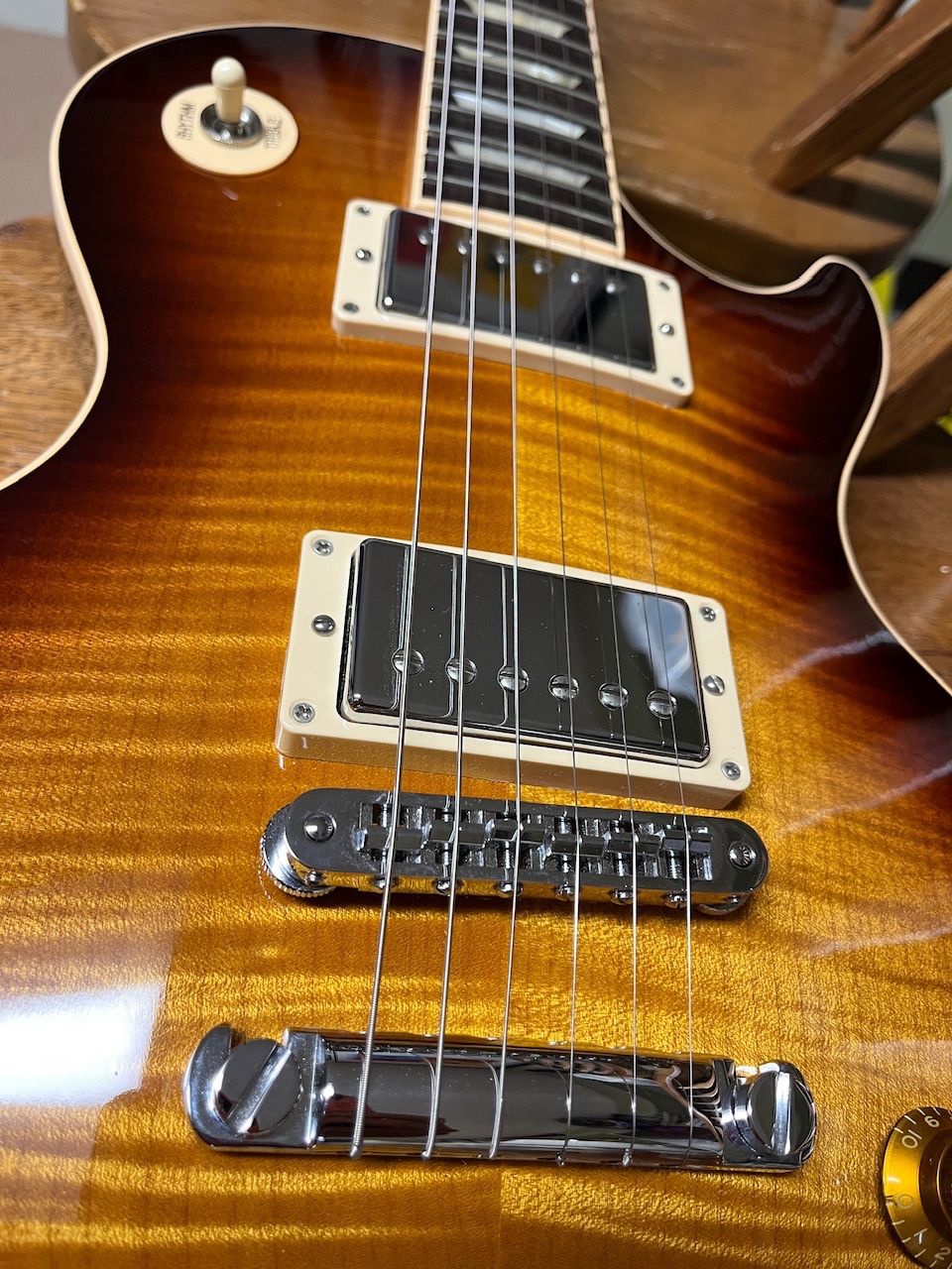It has burst bucker Pros!!! I couldn’t believe it. AND locking Tone-pros bridge/tail AND locking Grover’s!!!!