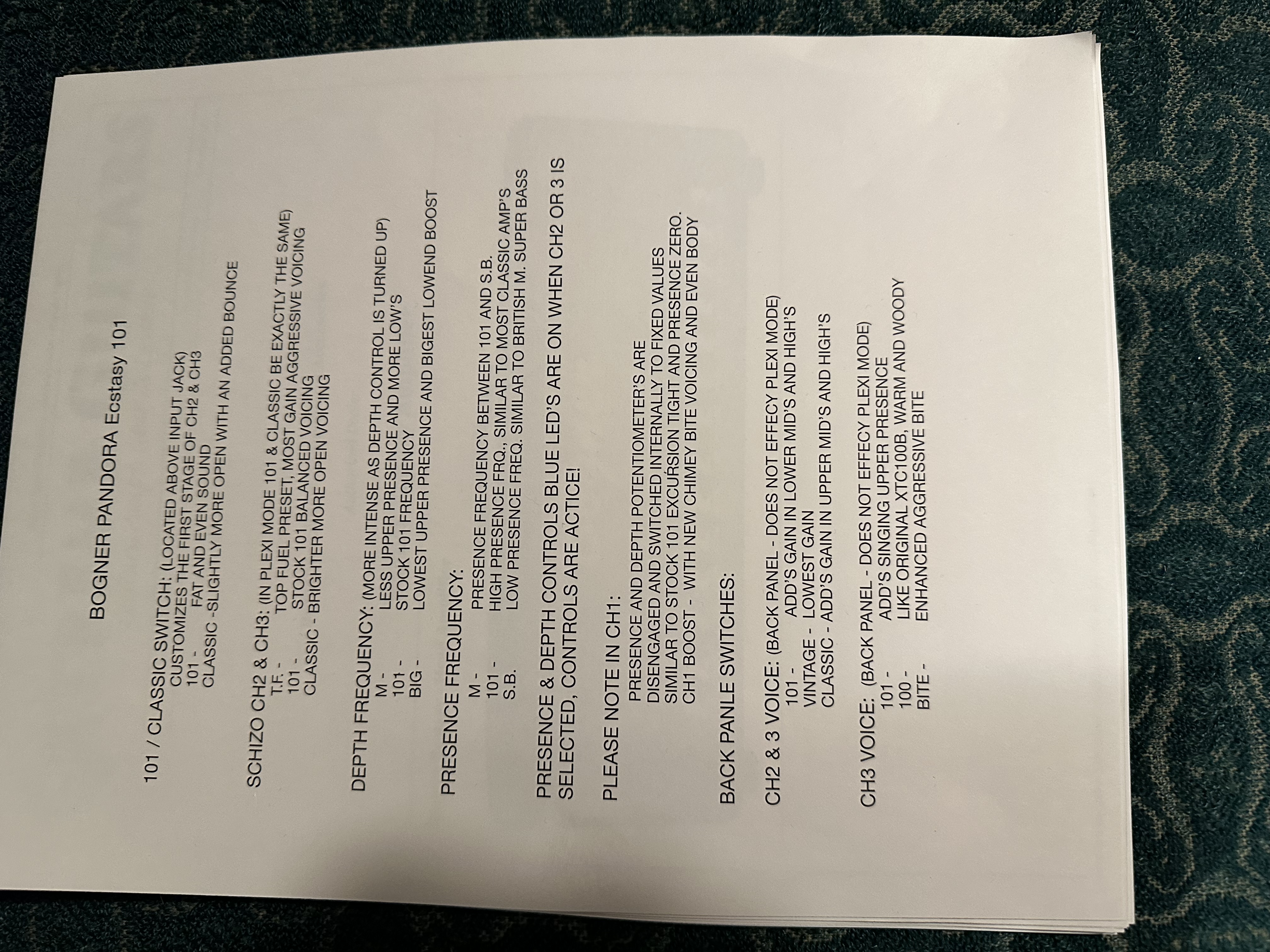 The Pandore is my favorite amp ever. I have had all the various suspects over the years and many Ecstasys but this is a whole new level. Sounds great at any volume and has the versatility that no amp I have played has. Since I got it I have had an easy time parting with some of my other amps. Tremendous amp and for me it is perfection. The many new toggle switch options are the coolest as you can really alter so much in both the feel and sound.