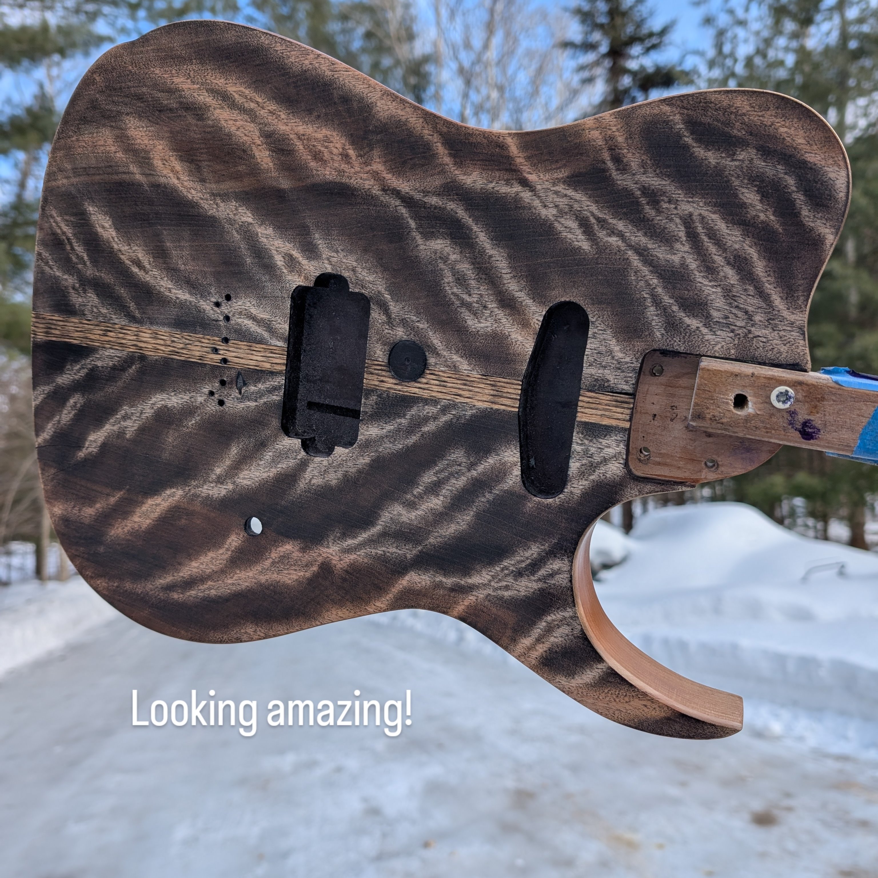 Flame Birch on alder body roasted bird's eye Maple neck. I'm going to send it to Dean zelinski to have his z Glide lasering system done to the back of the neck humbucker single single. It has a strip of Ash down the center to replicate the shaft and the flame Birch is the feathers on an arrow going to be done in dark brown with black hardware
