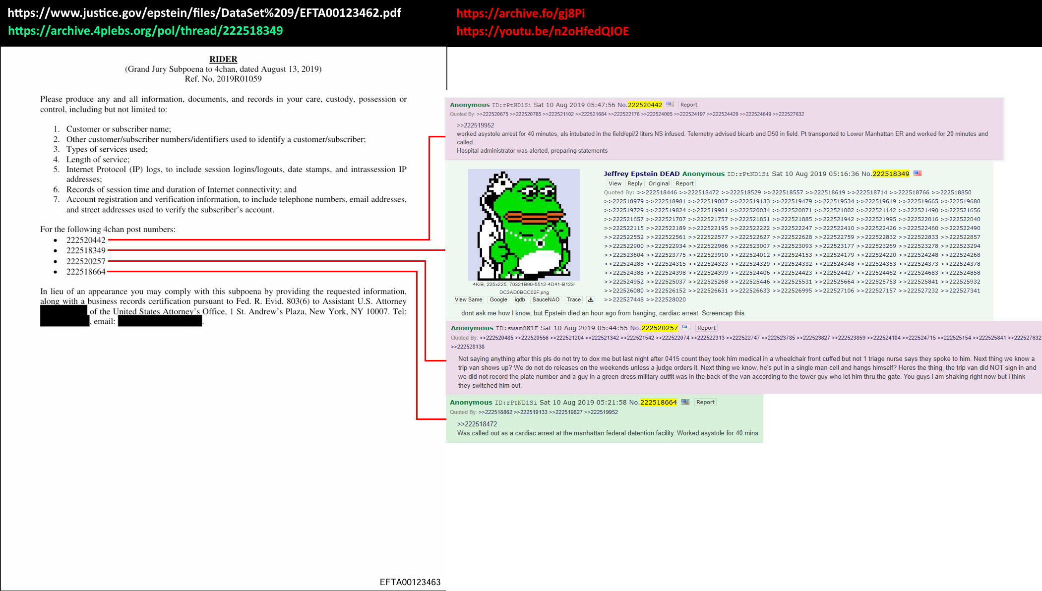 Someone working at the jail was posting about it on 4chan when it was going down, FBI subpoenaed information to find out who this was. Probably the same person who was posting about how Epstein had been taken to medical on Aug 9 at the same time a black Suburban arrived at the jail which was not logged and suspected they switched him out.
