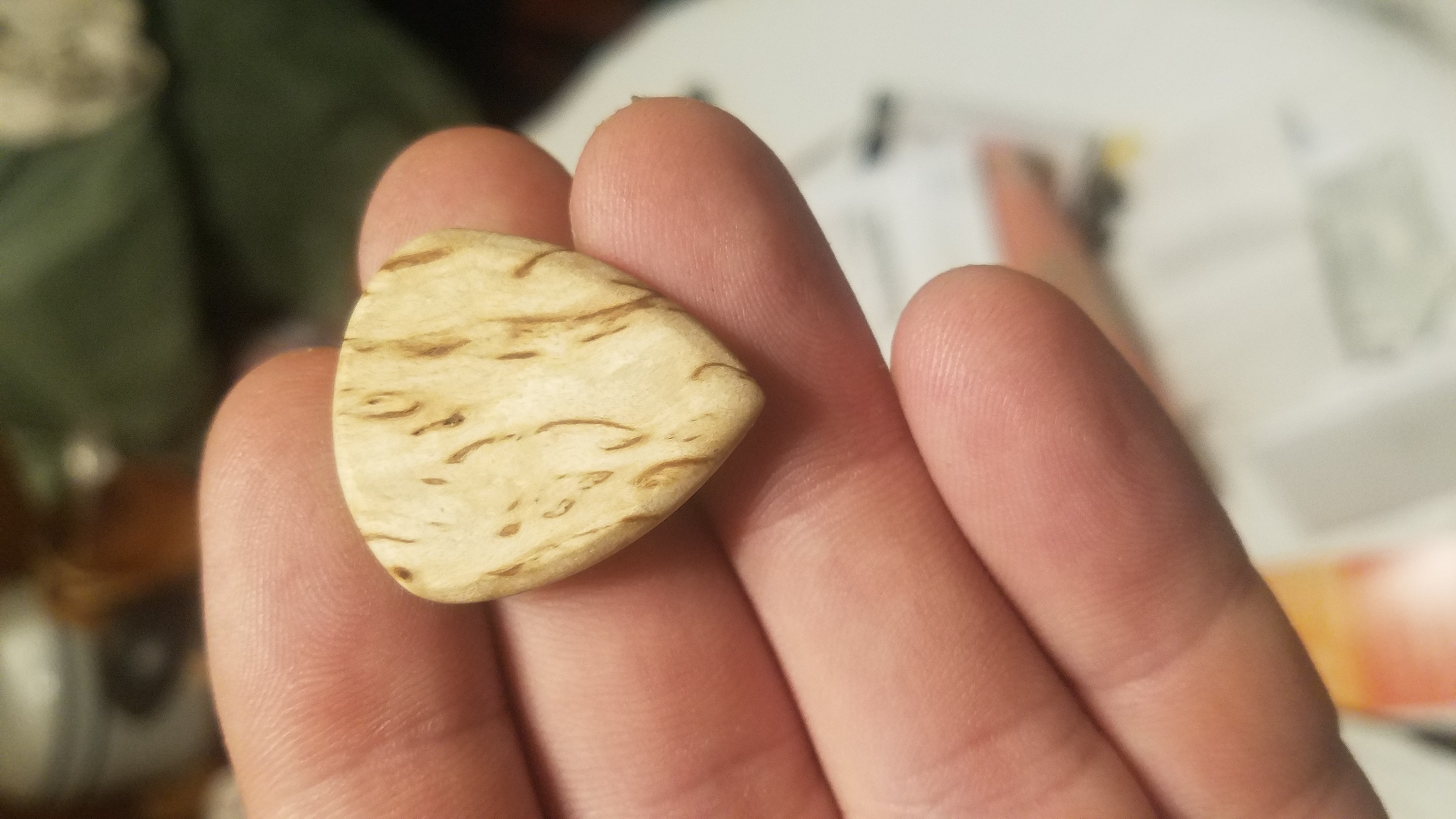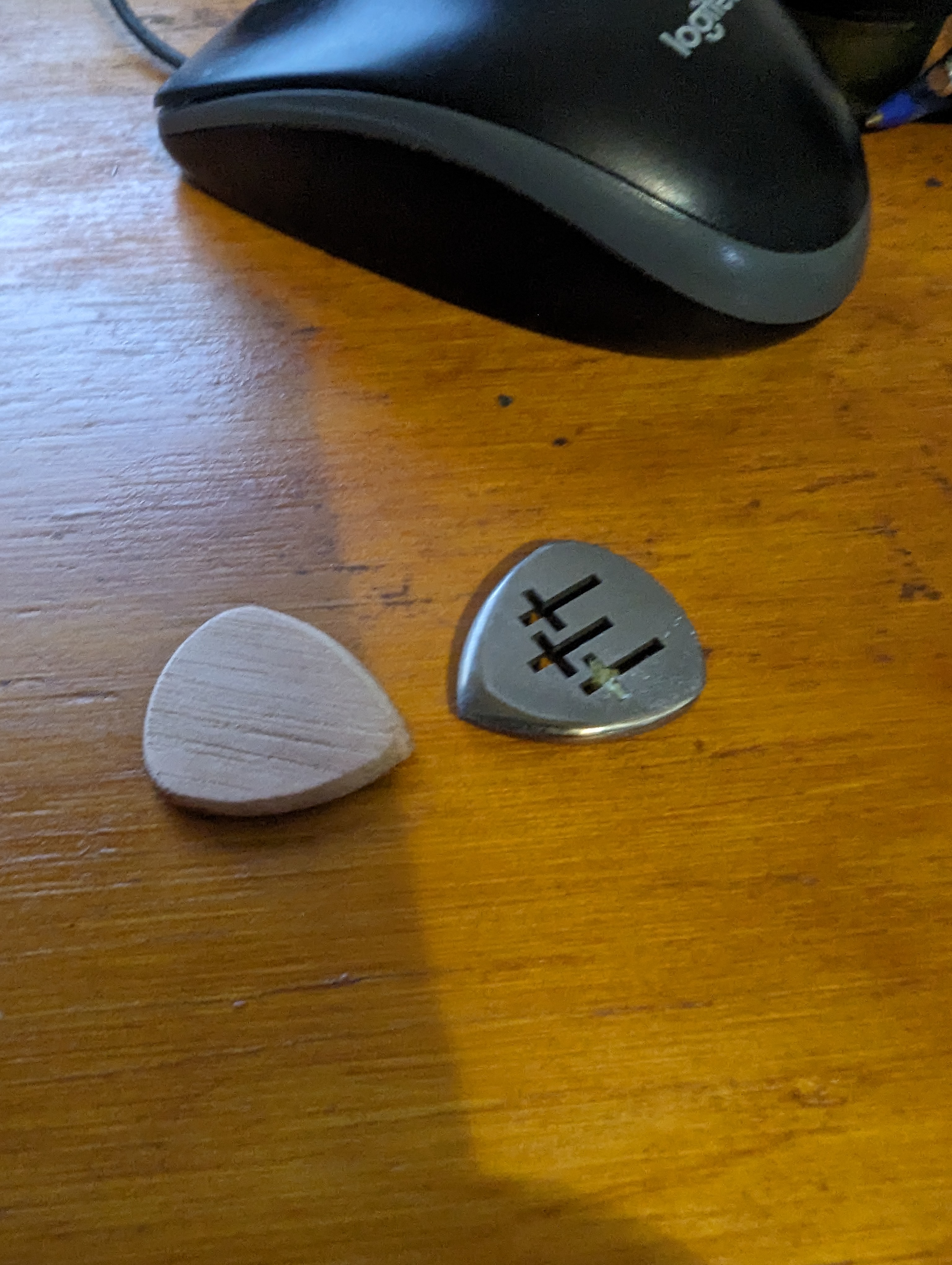 Anyhow, I like it. First impressions are that the tip profile feels almost exactly how I thought it would (as soft or softer than a purple 2mm dunlop when picking super shallow, but with the broad shoulders of the 420 flow when digging in), and it glides over the strings as easy as my 420 flow, if not easier, when strumming. With this pick I can actually hold it pretty near to perpendicular to the body and parallel to the strings and still not have issues strumming. My worn 420 would occasionally catch. It's also stupidly light (my kitchen scale shows 8.7 grams, or about 9 paperclips) compared to what I expected. We'll see how it wears. So far it just seems to get shinier on high-wear spots? Maybe there are tiny scratches? I think it's probably already ahead of my plastic picks though, which was kinda the point.
