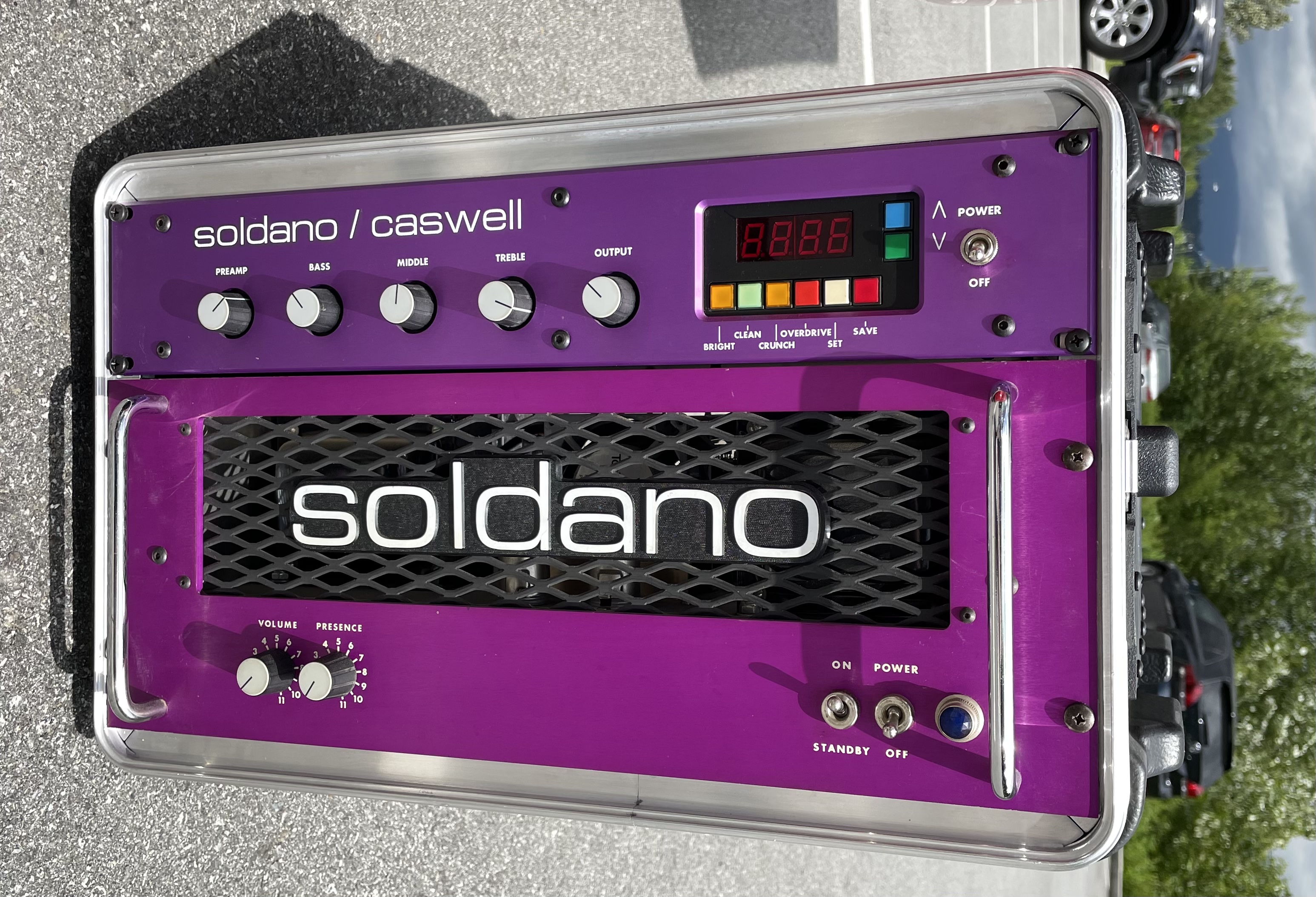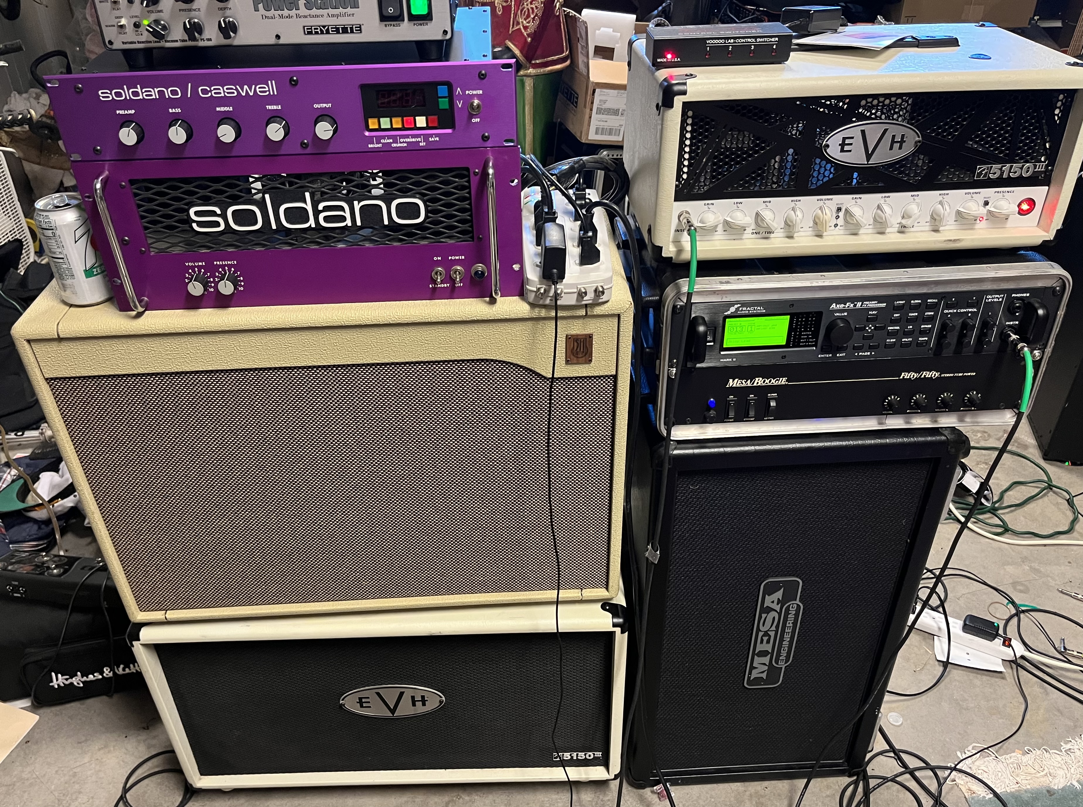 So about a month or so ago I was gassing for something.. what? Who knows but I came across what I had been searching for… a damn Caswell with Soldano power amplifier in an auction in BC Canada. Oddly or not oddly, I won the auction. Fortunately a buddy I know lives up there and picked it up for me and packed it well and sent to me. It arrived about 2 weeks ago and I opened it up and made sure it turned on but did not get a chance to fiddle with it as we had a show that weekend and I didn’t want to get sidetracked so I put it out if mind. Sadly my buddy died at the show last weekend so I didn’t feel like doing anything but this week I connected everything up as I have to press on. First the Caswell through the Soldano power amp. Then the Caswell through the Fryette PS100. I actually like the Fryette better. Maybe I need to give the slo power amp a bit more time idk. But the sound is incredible. So vs my SLO100 the Caswell allows multiple settings for tone which is nice. It’s midi programmable as well so I use my voodoo channel switcher to control the Caswell. I also have the Mesa 50:50 with the axe/fx II for a wet dry setup. Very very cool. I am tempted to try the Soldano power amplifier with the axe fx…. Just to see. Thing looks so cool. Sounds fucking awesome.