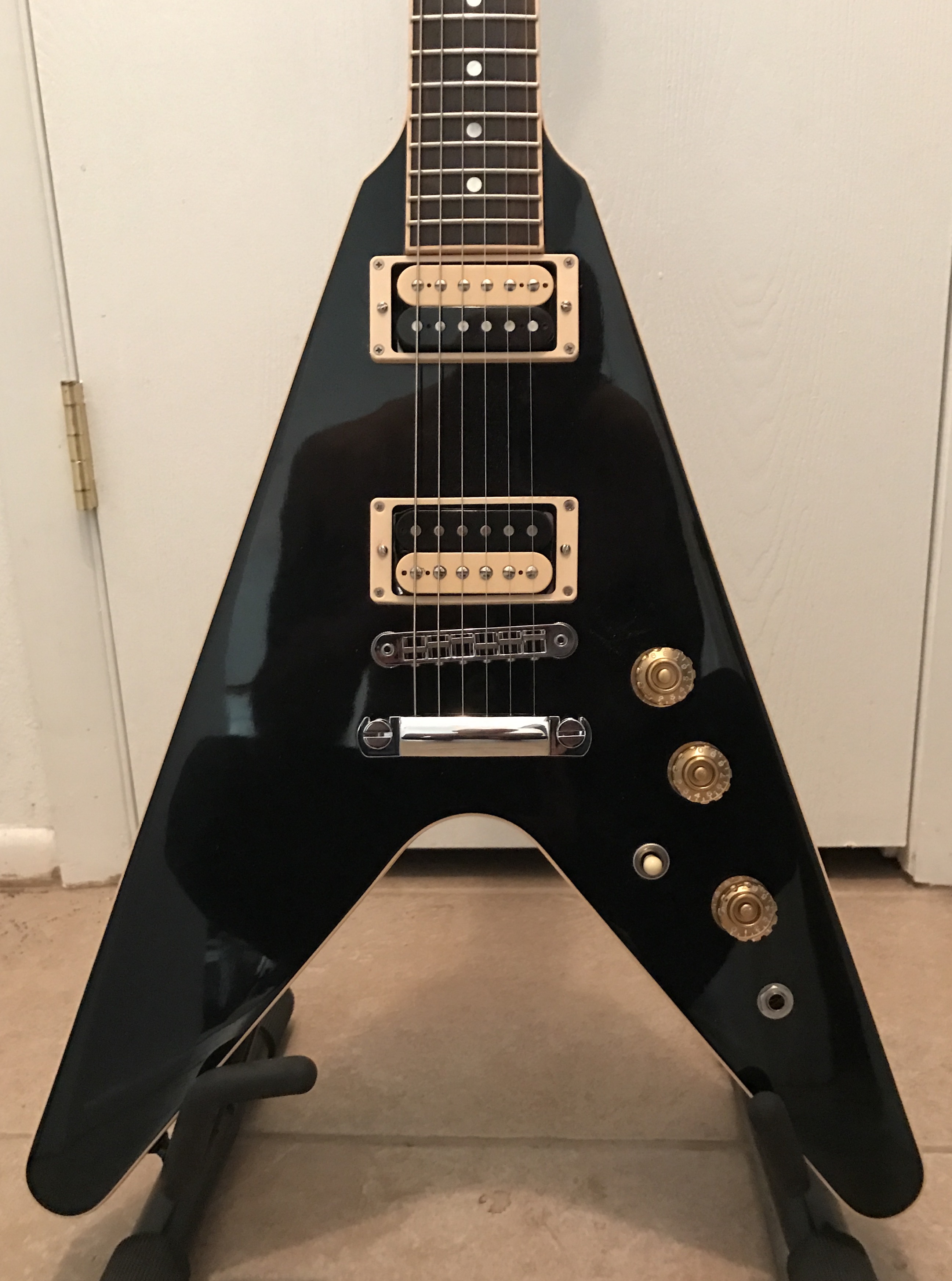 I just got this 2016 Gibson HP Flying V. Features titanium nut and bridge saddles. It has a cut out lower relief for upper fret access, robot tuners, burst bucket III and 57 Classic. Absolutely love this guitar. Right out of the box with factory set up played a 4 hour gig and it played and performed excellent!
