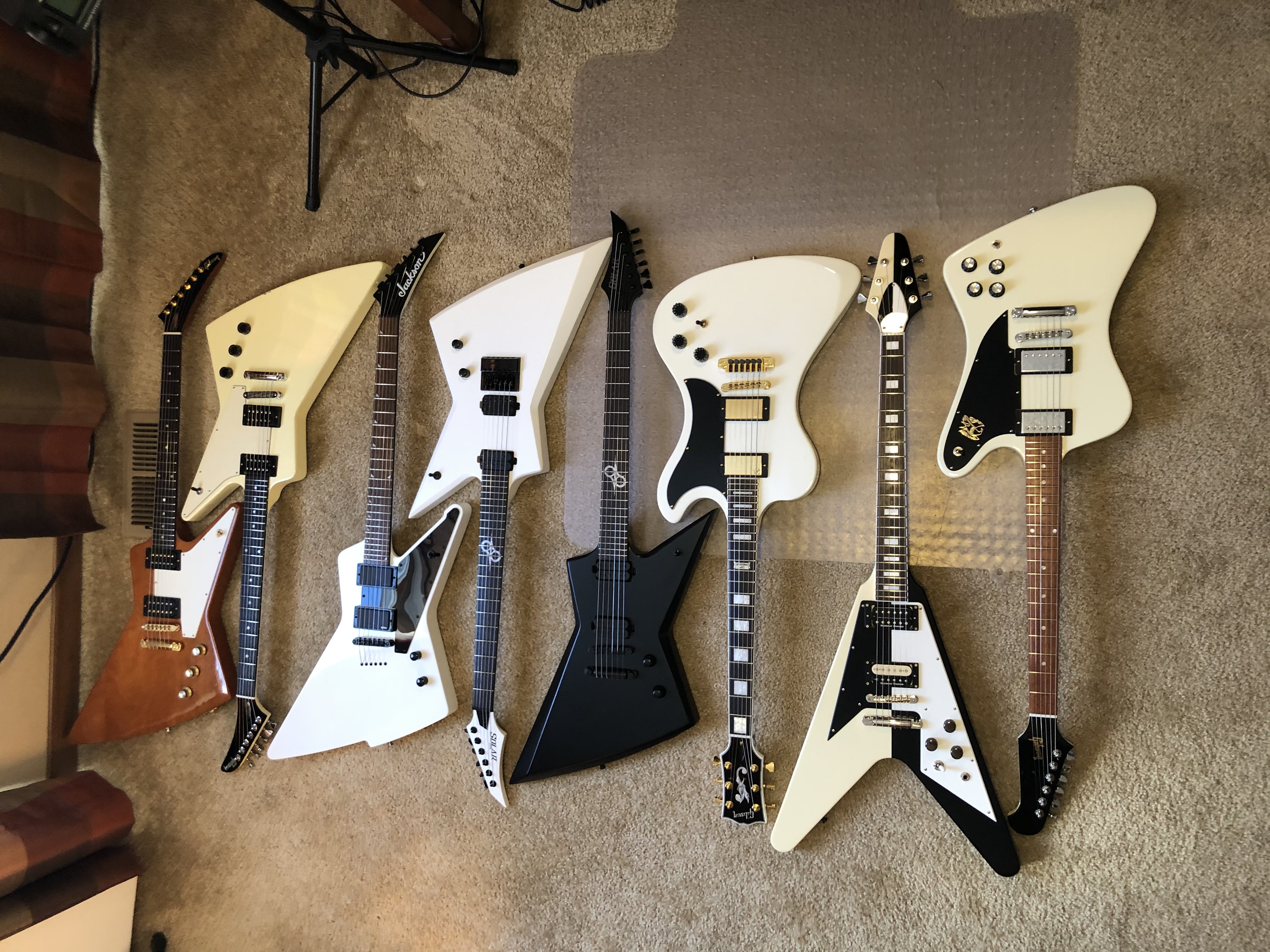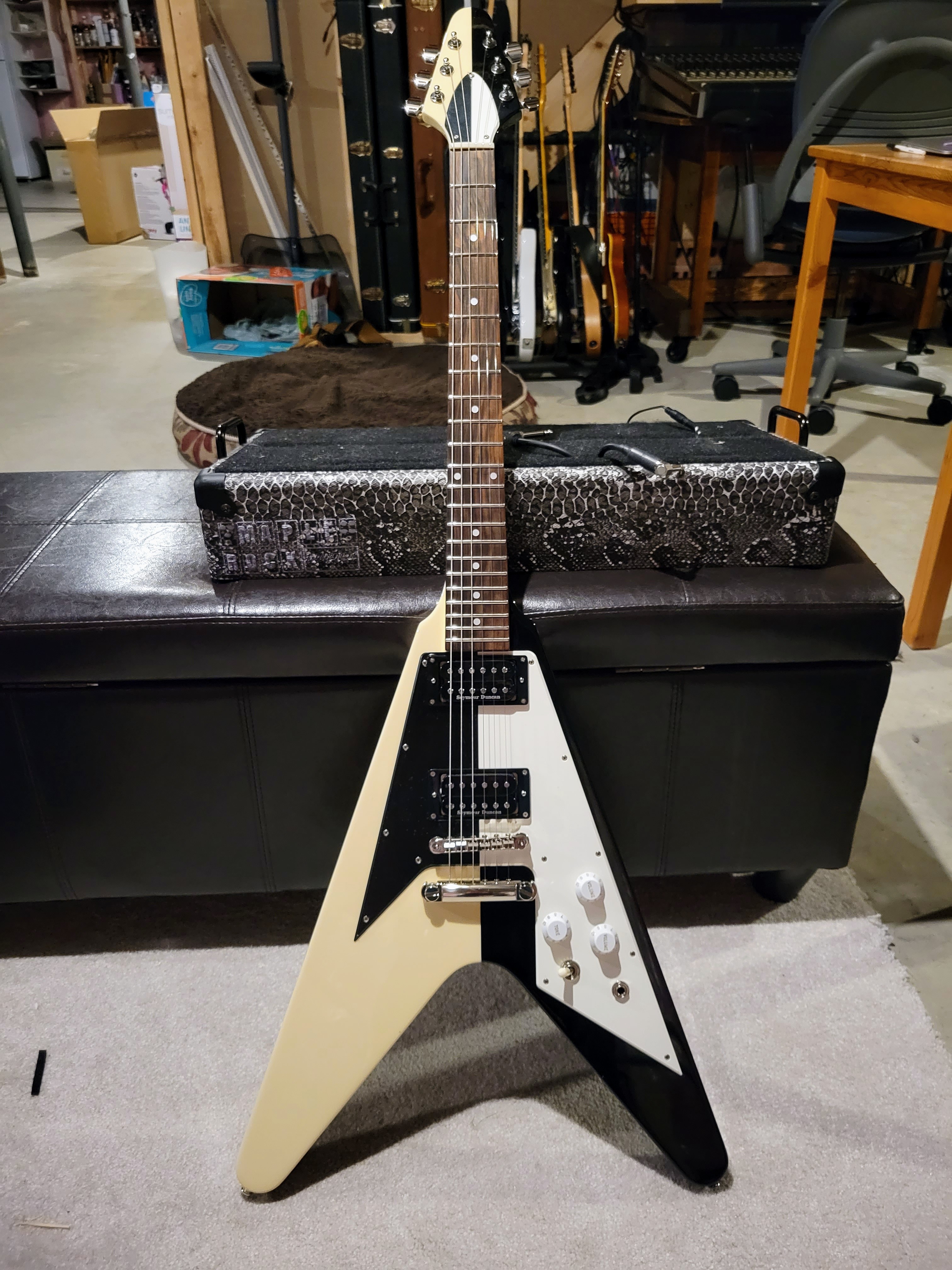 Nostalgic, maybe a little cheesy, saw a good deal on one of these out of Japan and pulled the trigger. First impressions are that it is light which I had heard, but lighter than expected. I wish the rosewood fretboard were a little darker and more consistent like my USA Explorer but the thing plays really nicely. Feels really nice to play and the finish and paint job are excellent. Definitely that Japanese quality you associate with their brands. I'm aware that they may have outsourced some of their manufacturing but at least the quality control is there. The strings are garbage but I plugged it in, fired up my wah and JMP clone and that's the tone right there. So good. It honestly makes me play just MSG and UFO tunes lol. I guess that's sort of the point though. Anyway, you guys have your VH obsessions so this is me feeding my Schenker obsession. When I was a kid, my brother took an old guitar neck and stuck it on a white/black plywood V body he built for me. It was an absolute abomination and played like shit but this is how bad I wanted one. 30+ years later I finally got my hands on one. It's Too hot to handle!