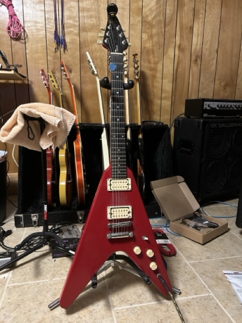 You stole my avatar’s guitar you bastardNever would have thought an impulse buy of a V that was cheap at the time, in a color I didn’t care for, would become my long time #1. Once I got the Wolfetone’s in it and refretted with Jumbo’s, which was soon after I got it, the sound and the feel of the neck is home to me. Threw on some Kluson’s as well because I just think they look better than Grover style. My white, mid 2K V is exceptional as well but this is the head cheese. As much as I would like a different color I’m almost too afraid to mess with the tone in any way, which who knows with a refin?