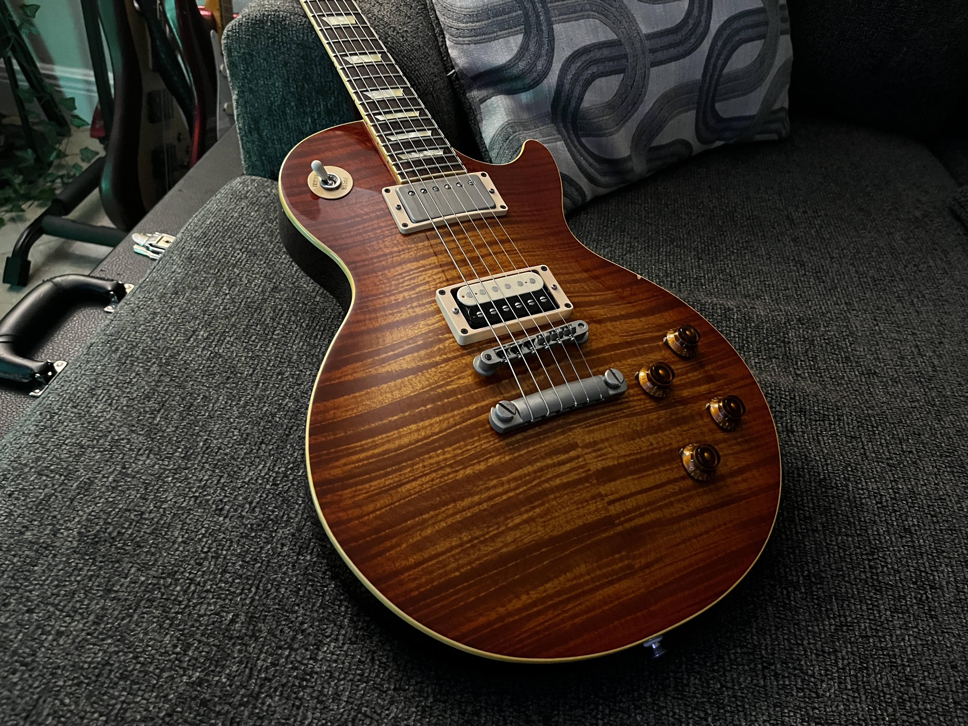 I´ve been snooping around for a Les Paul Standard-style for years, the only LP I´ve had for a long time is a Greco LP Custom with a Kahler and that´s really something else than a nice, timeless Standard. Anyhoo, I think a lot of the japanese stuff is great bang for the buck and decided to jump on this mid 90s Orville. It´s their LPS-57C model, essentially the same as the ´59 reissue but with a solid plain-top. Gibson 57 Classics bridge and neck, which I guess is where half the name comes from rather than the model year 1957. Looks real sweet and seems like a quality piece, just like I hoped for.