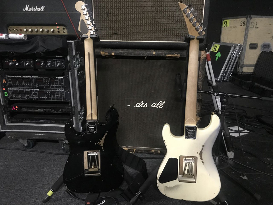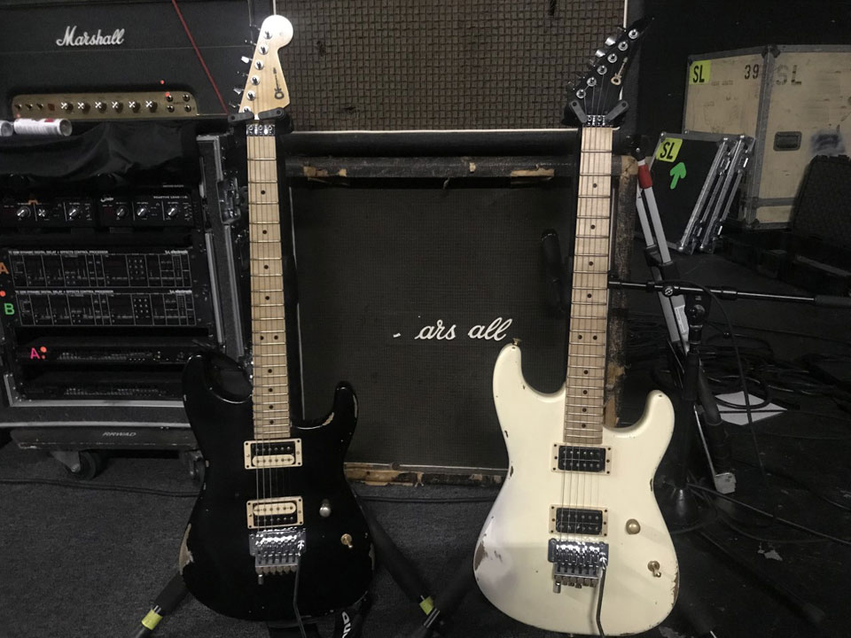 A couple of new tone machines I just got a couple of months ago from the Charvel Custom Shop, stainless 6100 frets, black is ash and white is alder, light relic nitro, Jalen Origin pickups..hope to be using these on the Roth Las Vegas shows coming up!