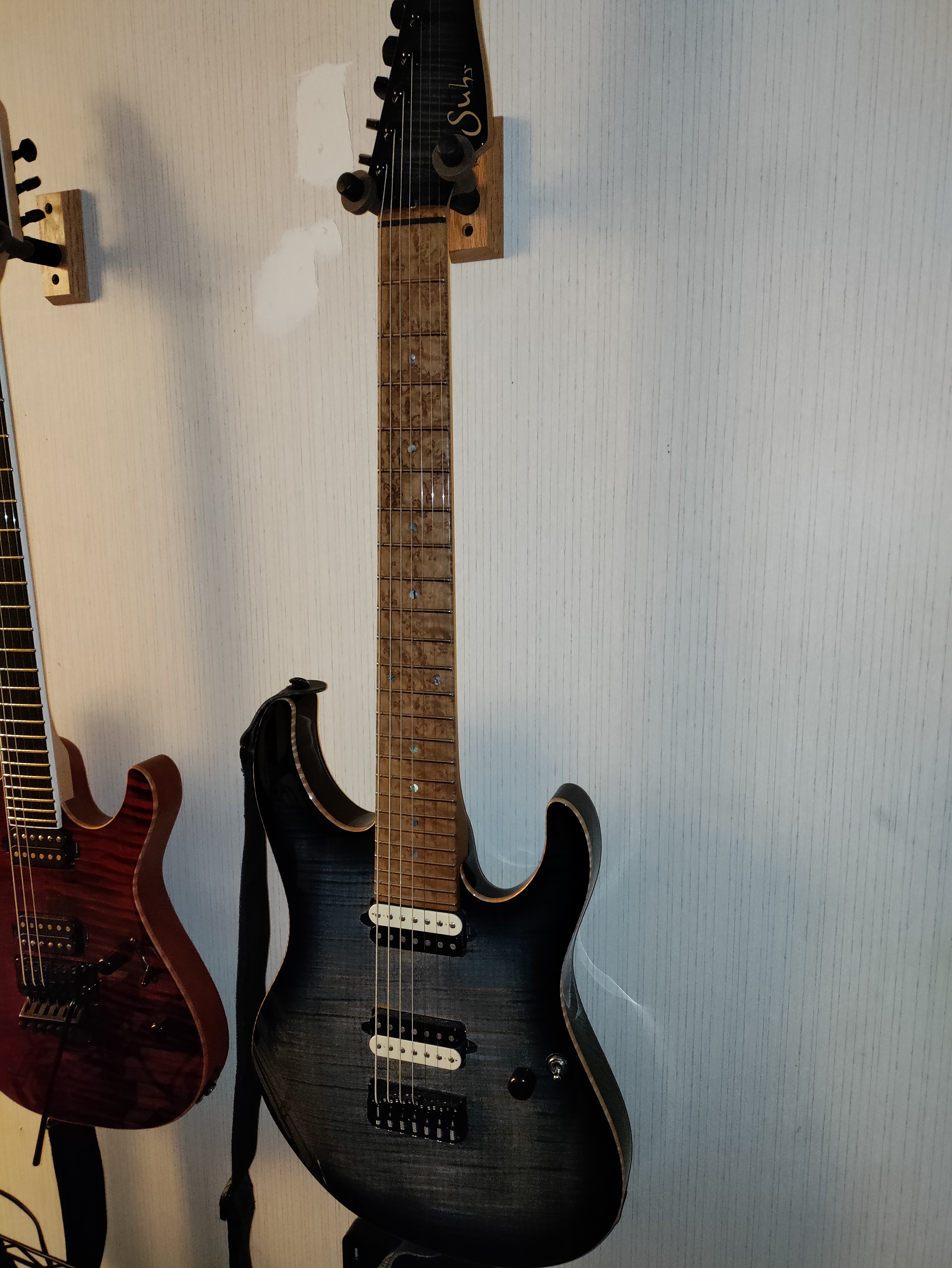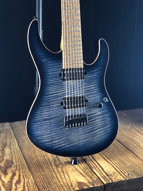 This is my beloved Suhr Modern 7 I had custom built a few years ago. Pick ups have been swapped out for Bare Knuckle ceramic Nail Bomb and VH2 with zebra covers. Some specs are 1 piece 5A maple whale blue flame top, roasted bird's eye maple satin finished neck, 5A bird's eye maple fret board, basswood body, and hip shot bridge. Guitar was sent back to Suhr to have side dots replaced for white clay dots.