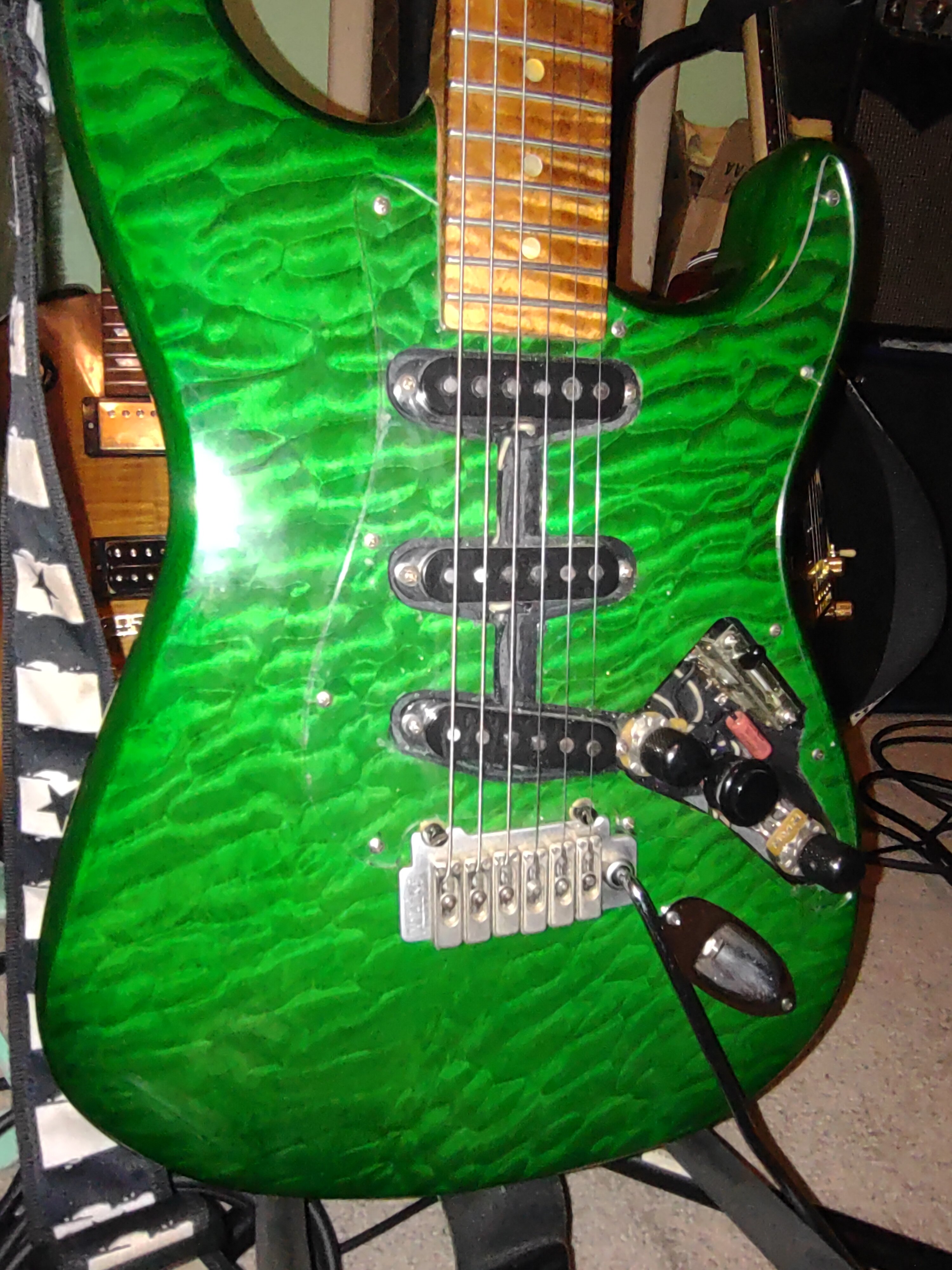 Strat style guitars with pick guard versus no pick guard…. I have these two Showmasters’s and basically they are Strats without out pick guards. They sound like your typical hot rod strat type guitar. Close to a strat but not quite there. They also have mahogany bodies also. Is there any information out there about how having a pick guard affects the tone? Just curious