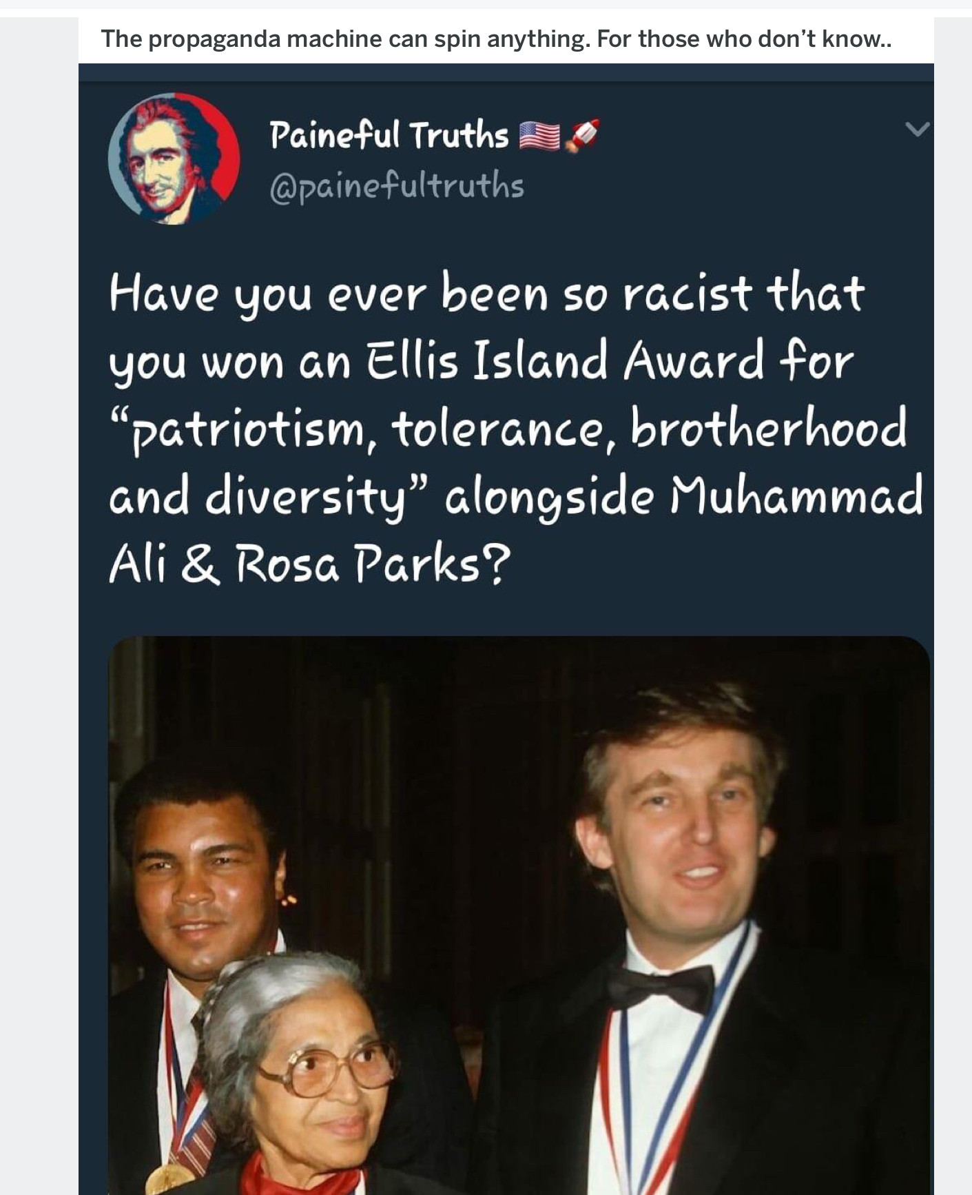 If any of you libtards had a clue you would know that the KKK made it very clear that they hate Trump due him always being friends with African Americans and receiving the brotherhood and diversity award along with Rosa Parks and Muhammad Ali .