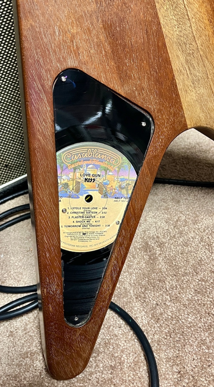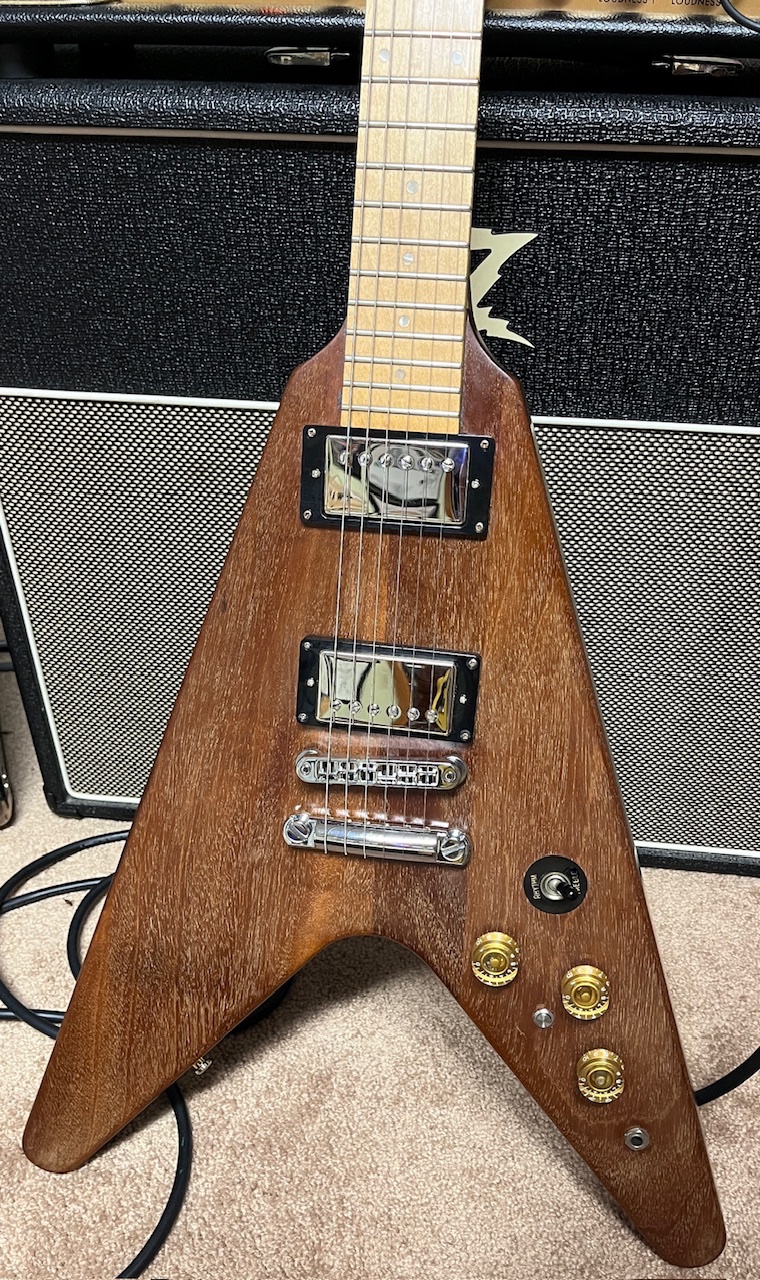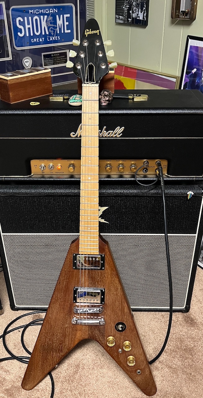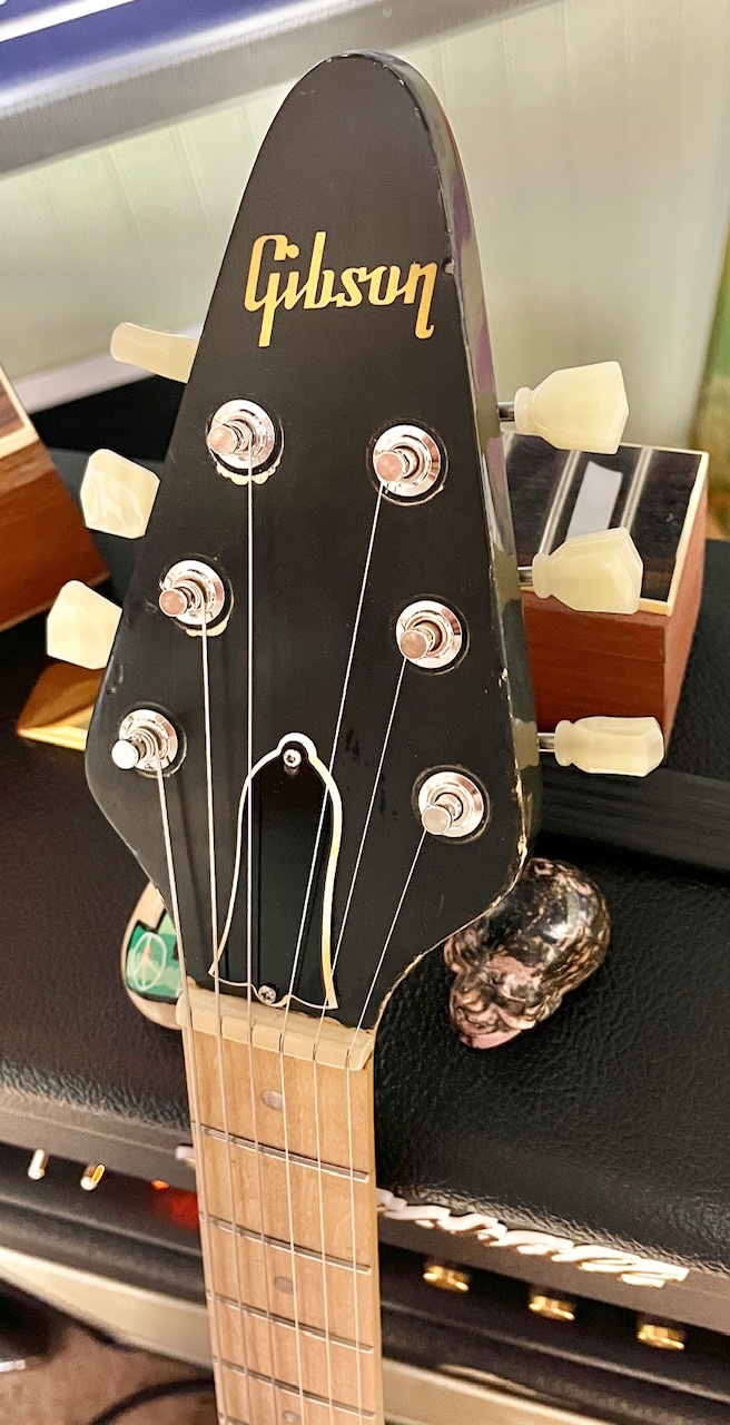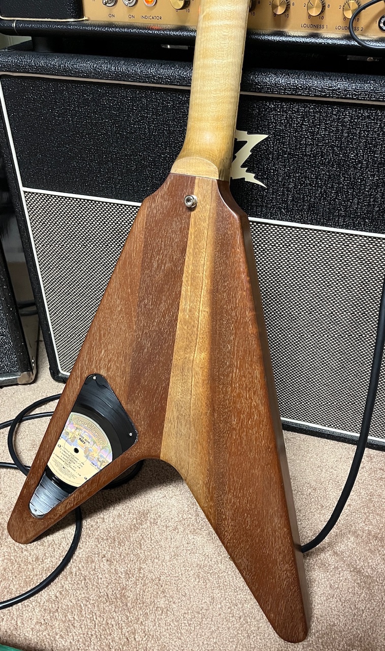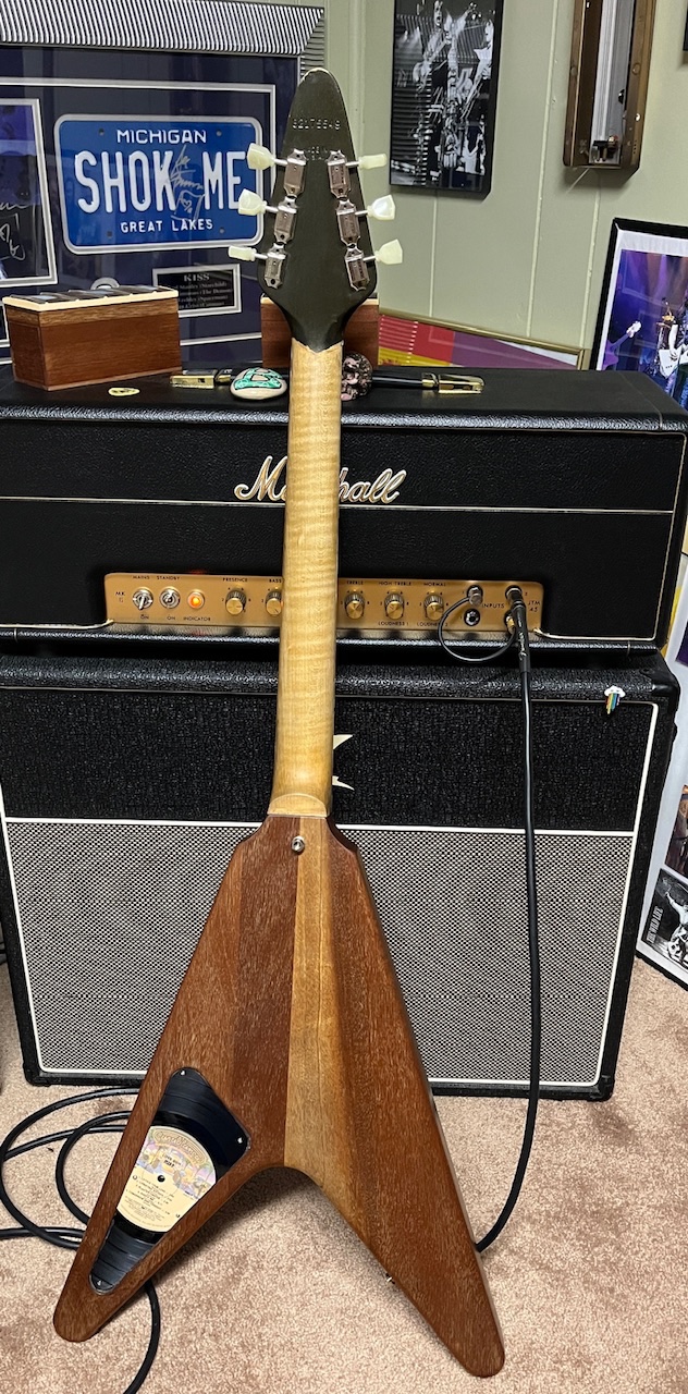 It’s been through some changes over the years. He stripped the finish off shortly after he bought it. Then he had late, legendary Luthier, Pete Moreno put a maple fretboard on it. This V surprisingly has a 1 piece maple neck!