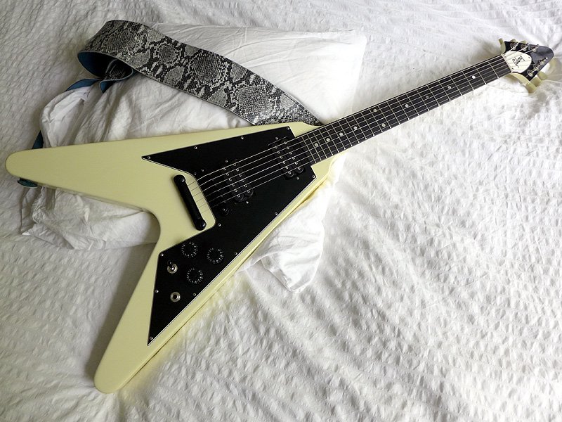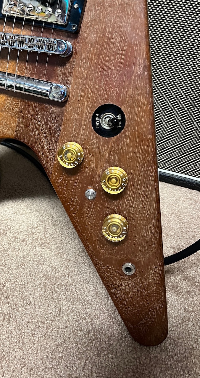 As far as the setup…the truss rod needed just a little tightening. The action is medium/low. It plays very nice!!! The burst buckers sound fabulous in this V!